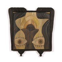 Ever Baldwin (American), Quiffs, 2021. Oil on canvas in charred wood frame, 37 × 34 in.