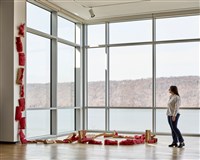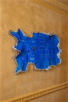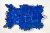 Nicholas Galanin (Tlingit/Unangax̂), Architecture of return, escape (American Museum of History), 2021. Pigment and acrylic on deer hide, 32 × 61 in.