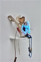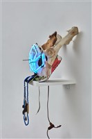 Natalie Ball (Klamath/Modoc), You usually bury the head in the woods Trophy Head, 2021. Neon glass, extension cord, cow bone, shoe, deer hooves, beads, bullet case, elk hide, 28 × 12 1/8 × 14 5/8 in.