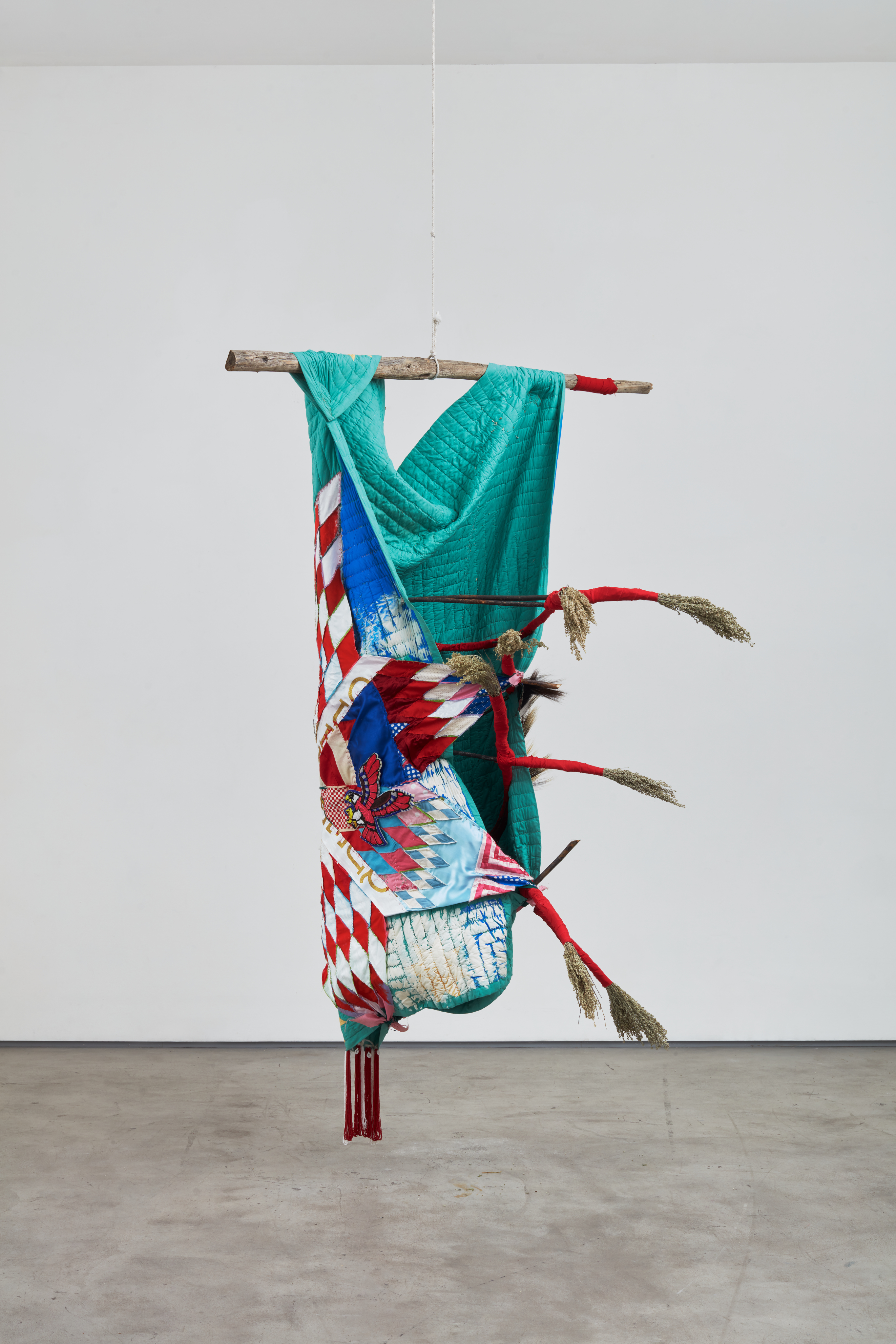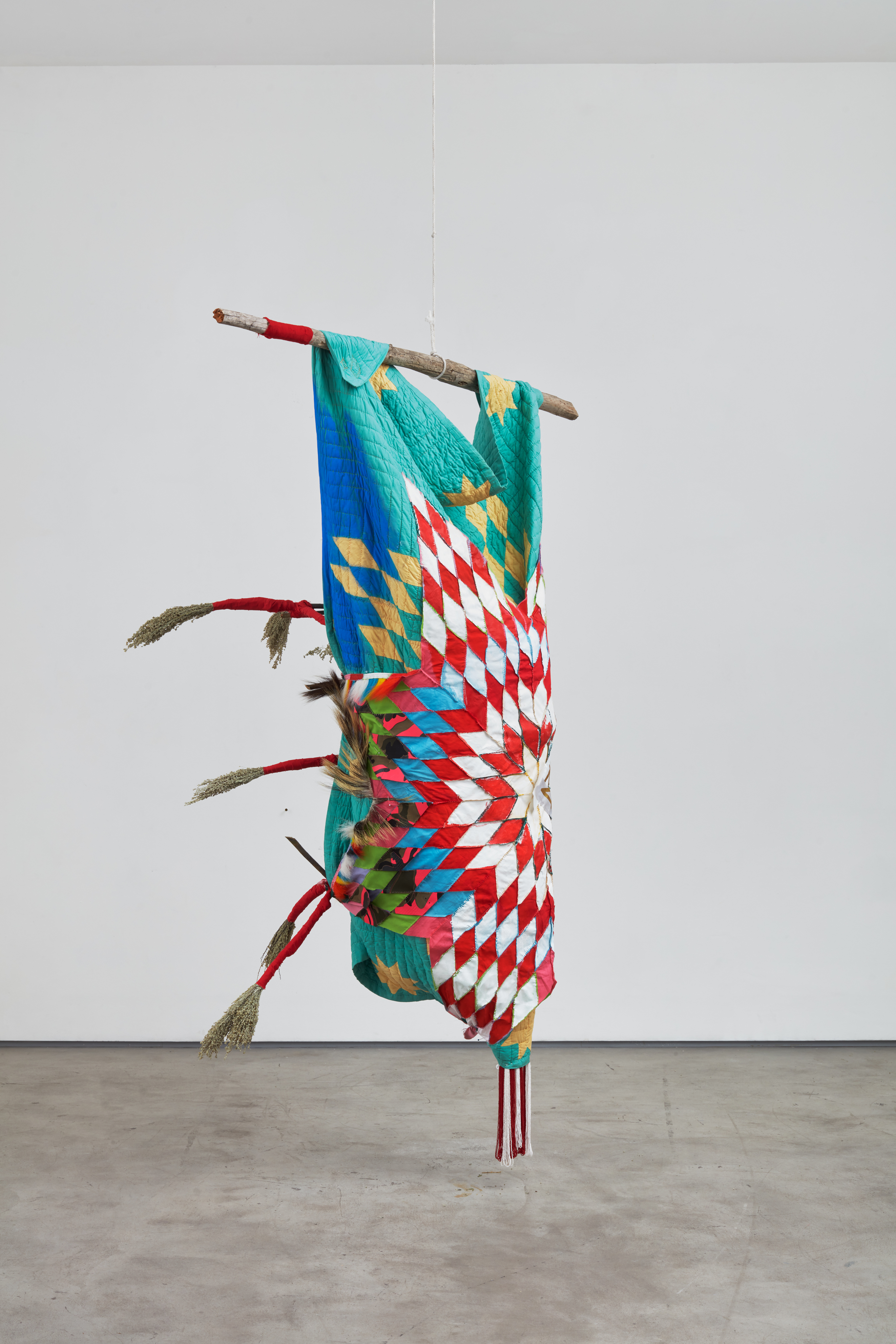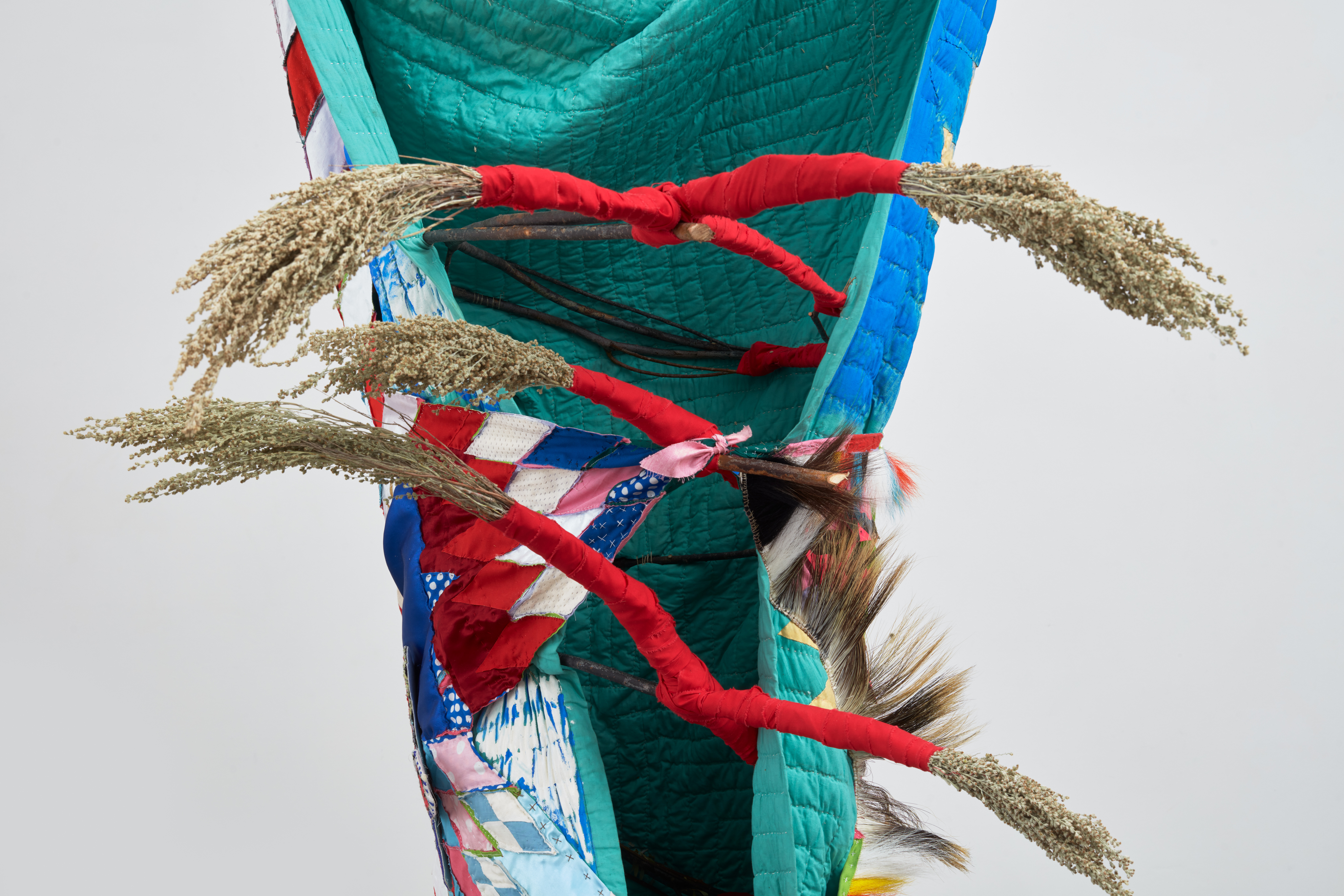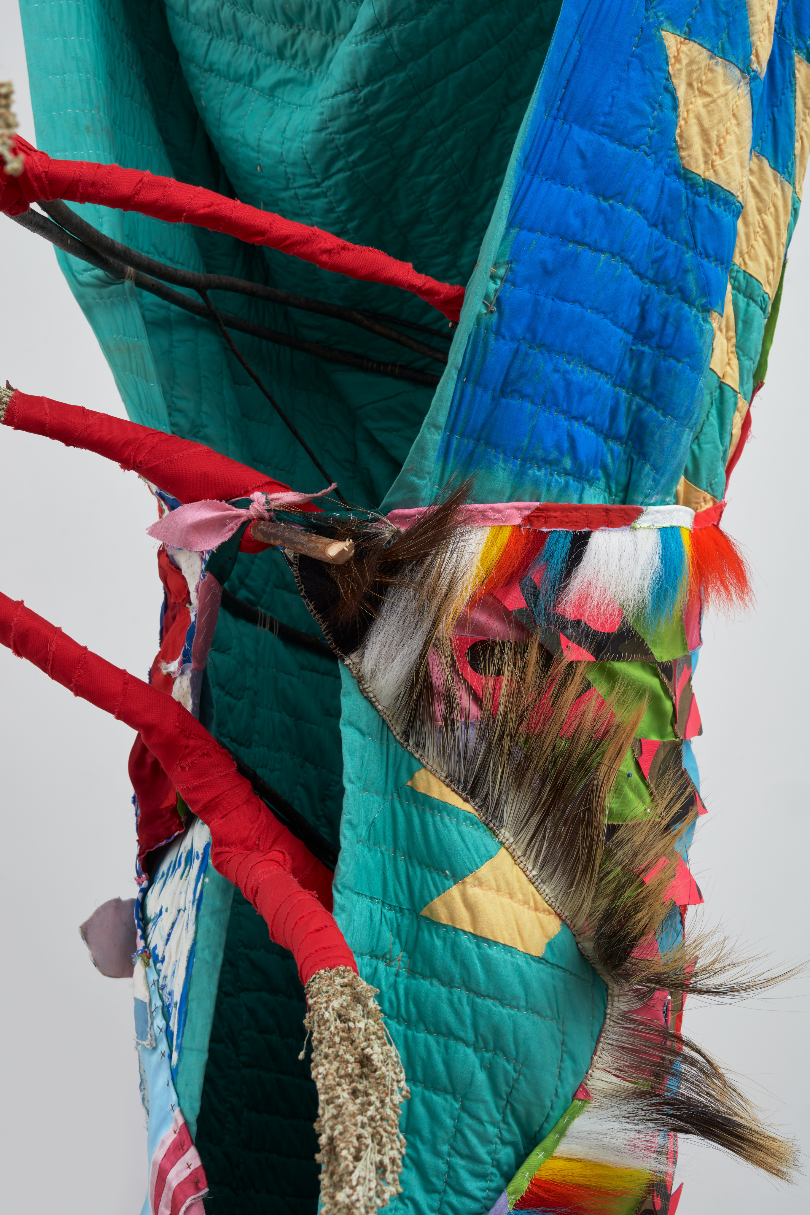 Natalie Ball (Klamath/Modoc), Deer Woman's new Certificate-of-Indian-Blood-skin, 2021. Textiles, chenille, beads, deer and porcupine hair, sagebrush, river willow, lodgepole pine, rope, 83 ¼ × 59 1/8 × 44 ½ in.