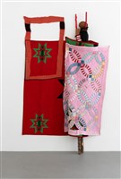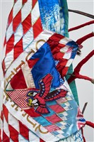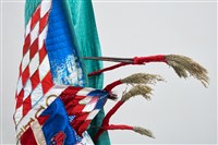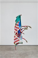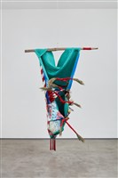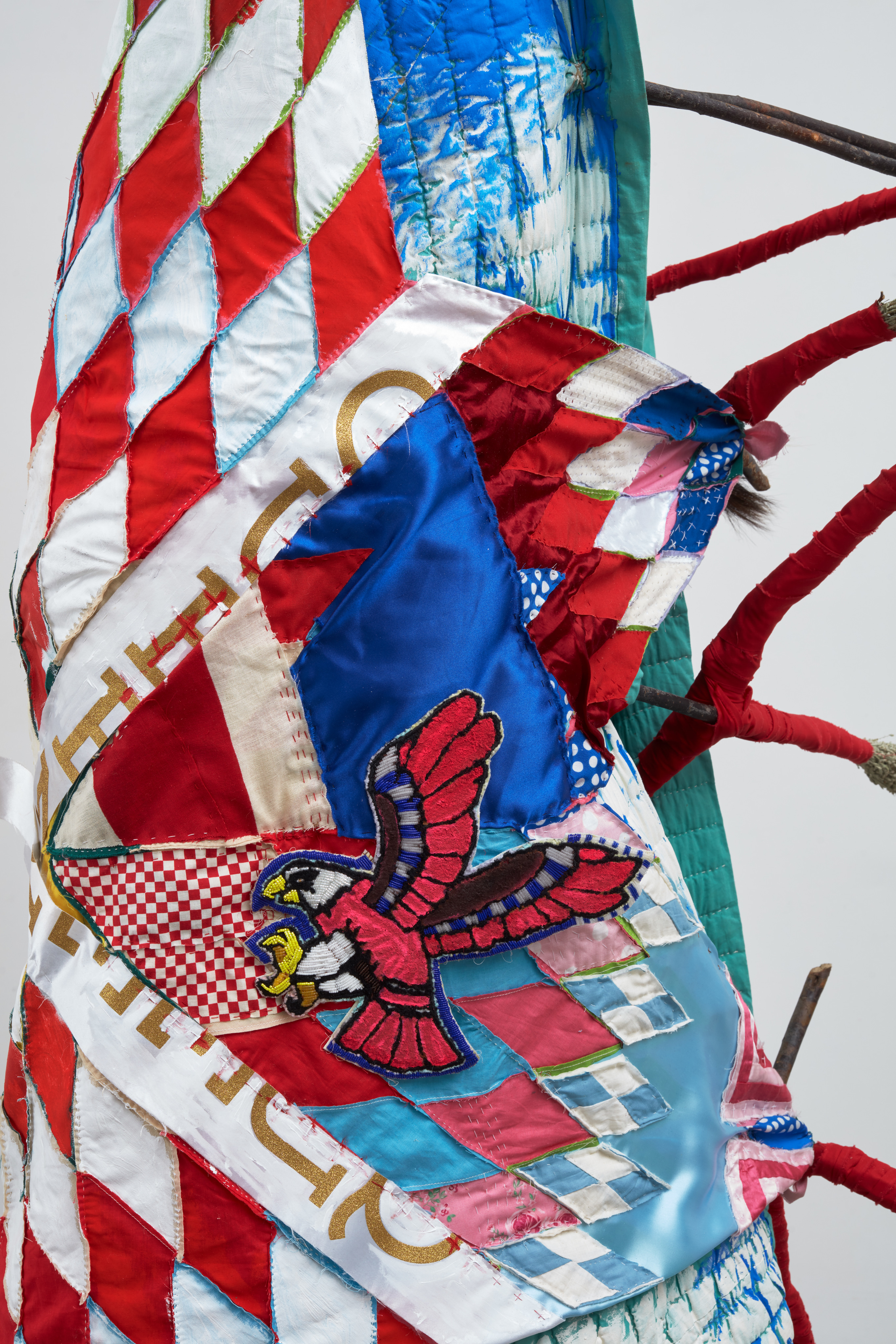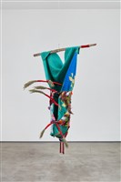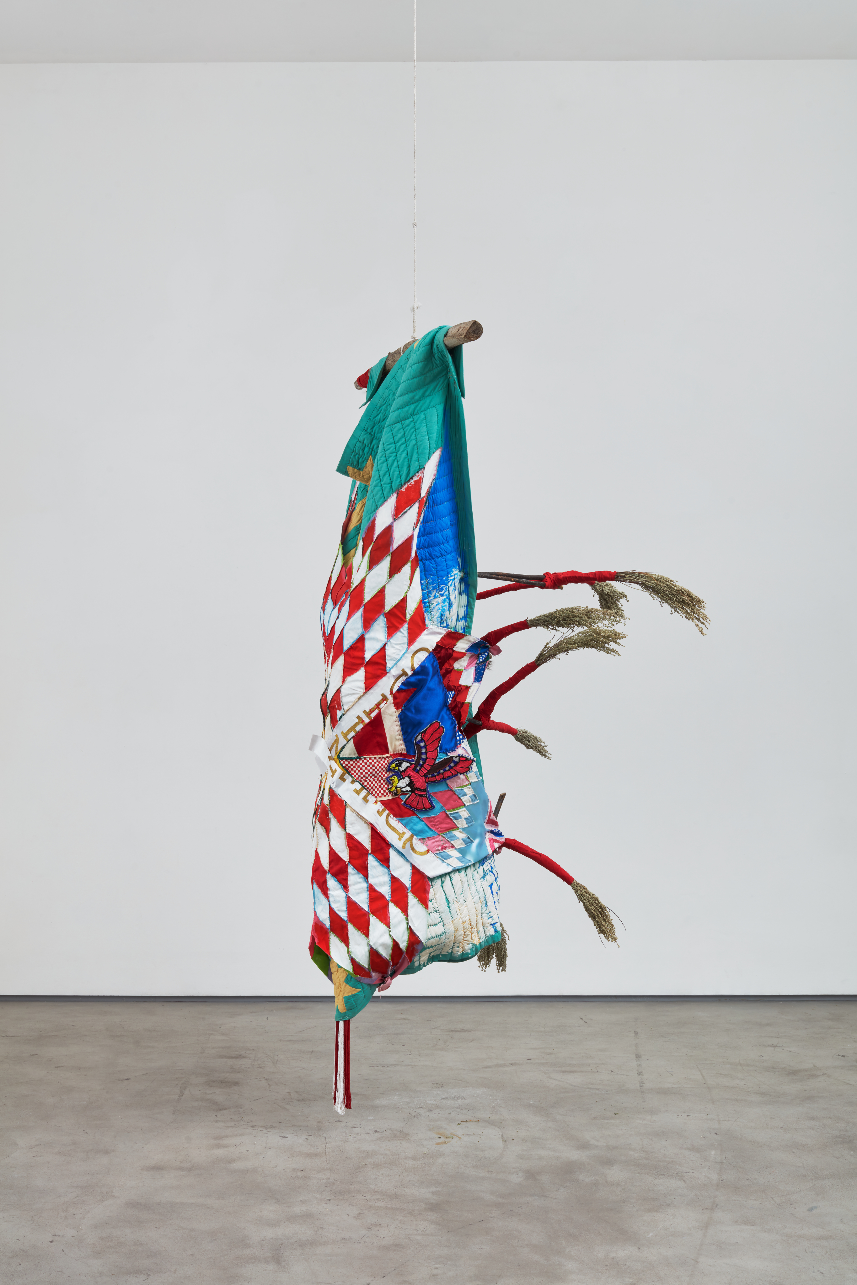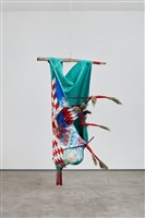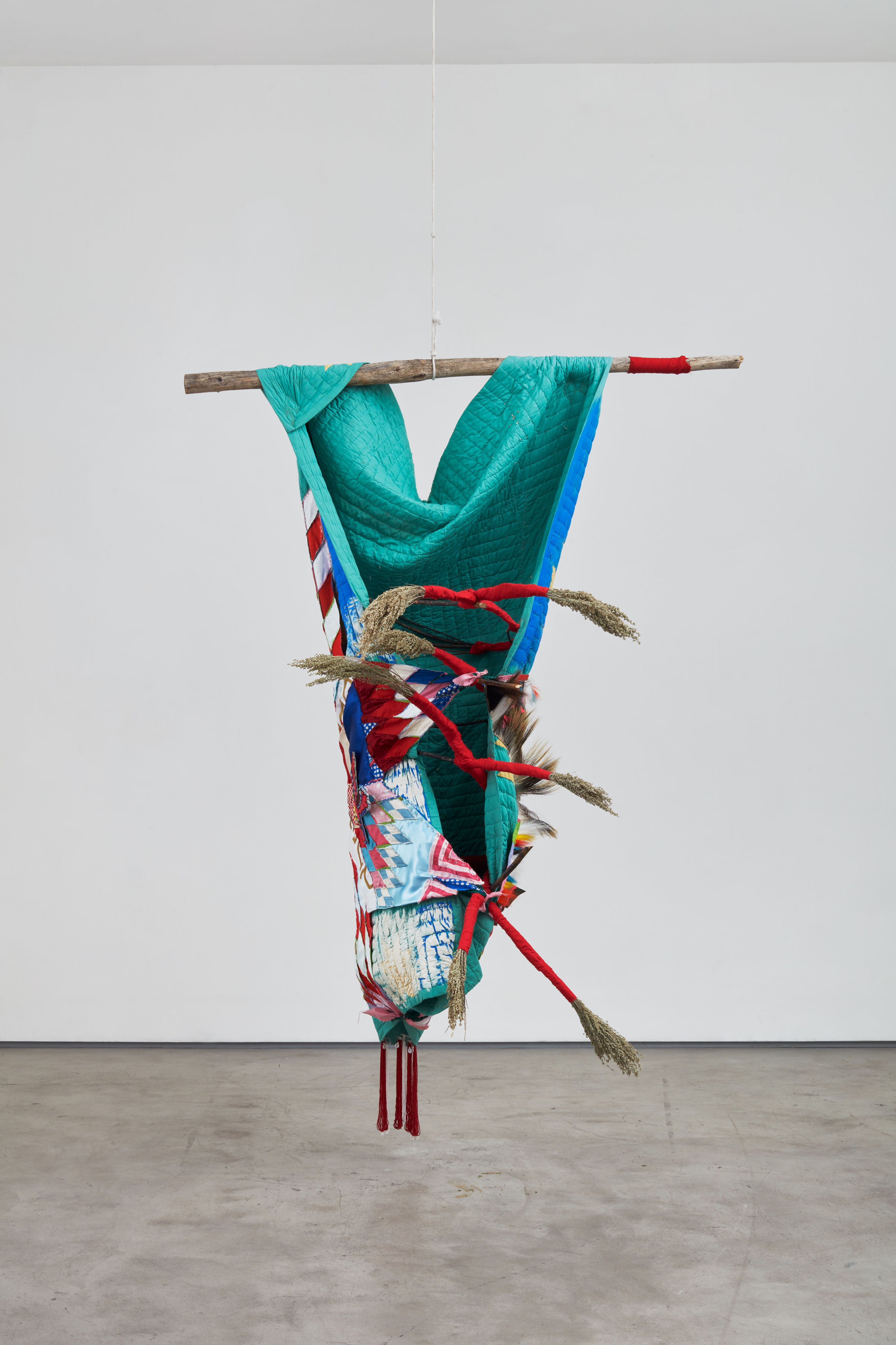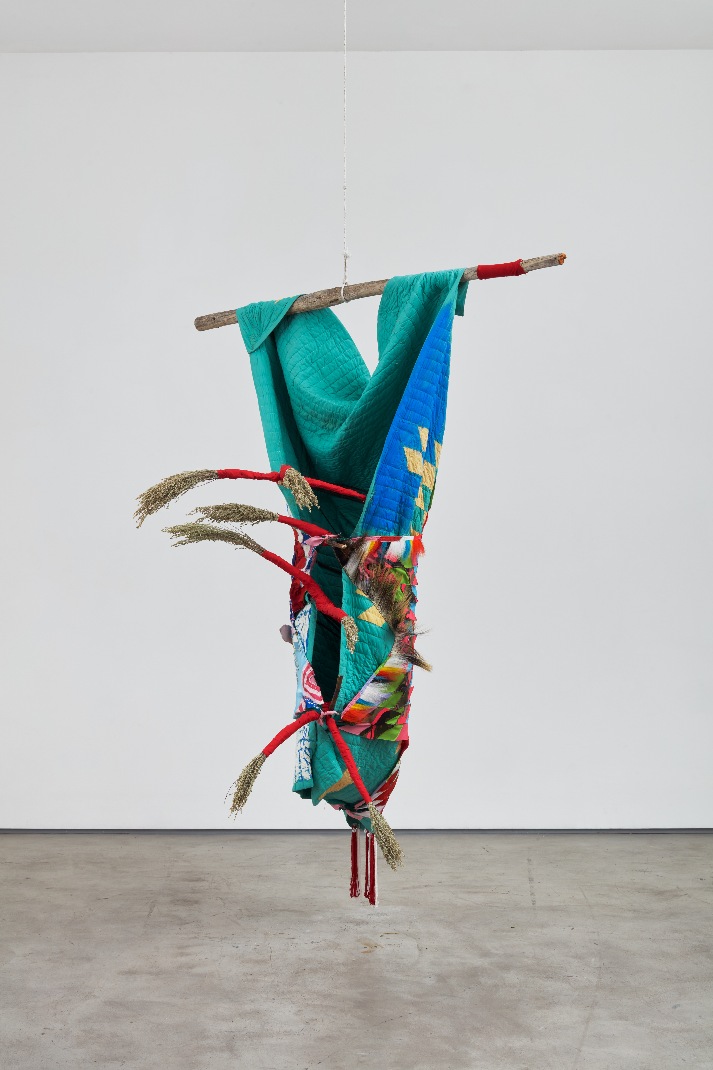 Natalie Ball (Klamath/Modoc), Deer Woman's new Certificate-of-Indian-Blood-skin, 2021. Textiles, chenille, beads, deer and porcupine hair, sagebrush, river willow, lodgepole pine, rope, 83 ¼ × 59 1/8 × 44 ½ in.