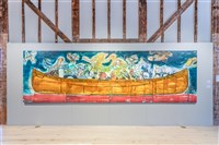 Jaune Quick-to-See Smith (Salish member of the Confederated Salish and Kootenai Nation), Trade Canoe: Don Quixote in Sumeria, 2005. Mixed media on canvas, 60 × 200 in.