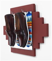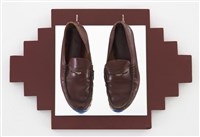 James Luna (Payómkawichum, Ipai, and Mexican), Burial Loafers, 1990. Acrylic, mirror, wood, and shoes, 16 × 24 × 5 in.