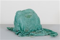 Jeneen Frei Njootli (2SQ Vuntut Gwitchin, Czech and Dutch), He coats the warp and weft until a field emerges (Orange upright bottle), 2021. Tarp, plastic and fixative, 19 ½ × 14 ½ × 13 in.