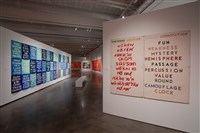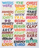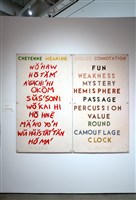 Edgar Heap of Birds (Cheyenne and Arapaho Nations), Understanding the Uniqueness of an Ethnic Entity, ca. 1980. Die cut paper board letters, acrylic paint on "homisote" wall board material, 60 × 72 in.