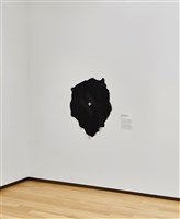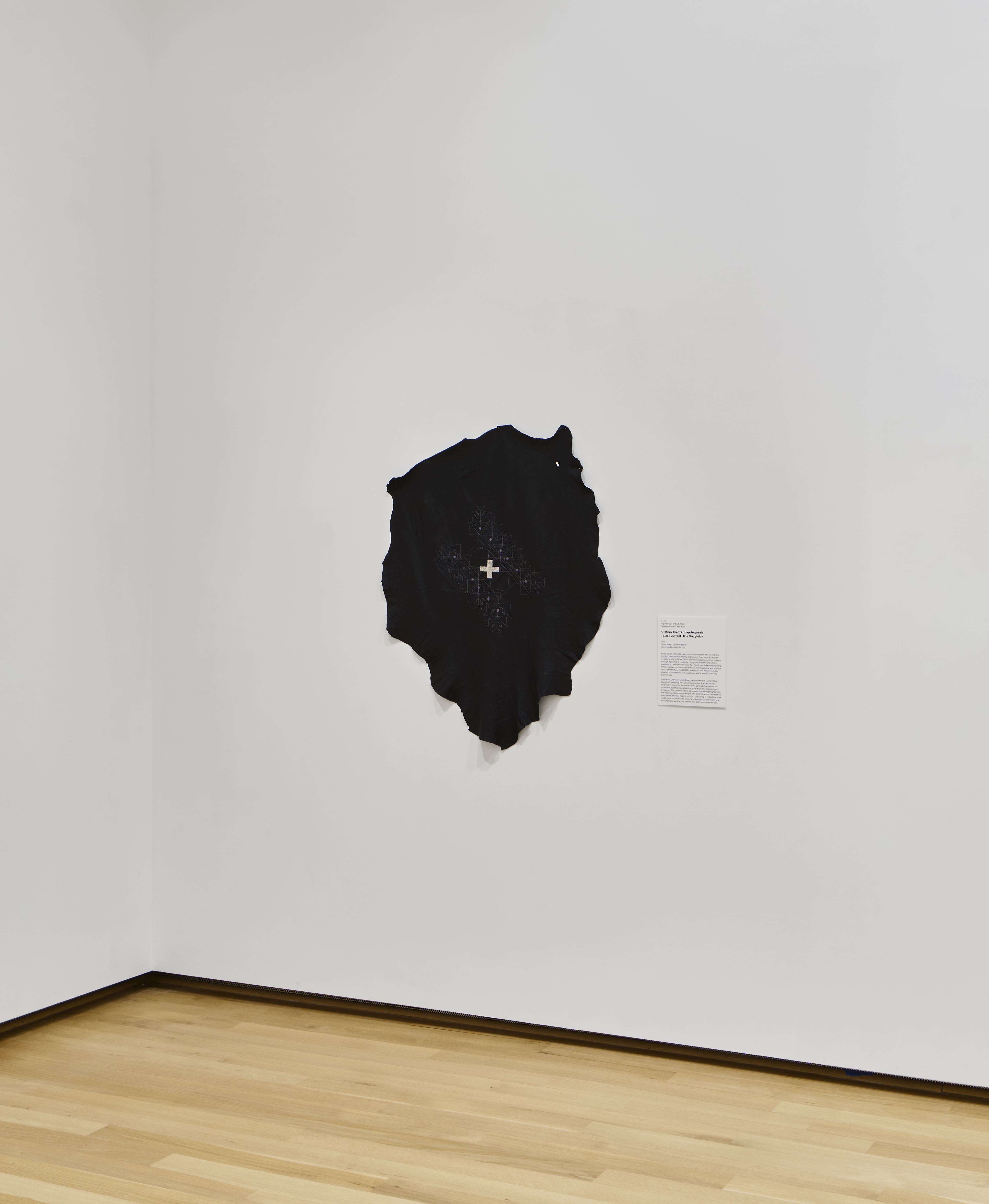Kite (Oglala Sioux Tribe), Otakiya Thehpi Chapcheyazala (Black Currant Hide Manyfold), 2019. Silver thread on black leather, 42 ½ × 35 in.