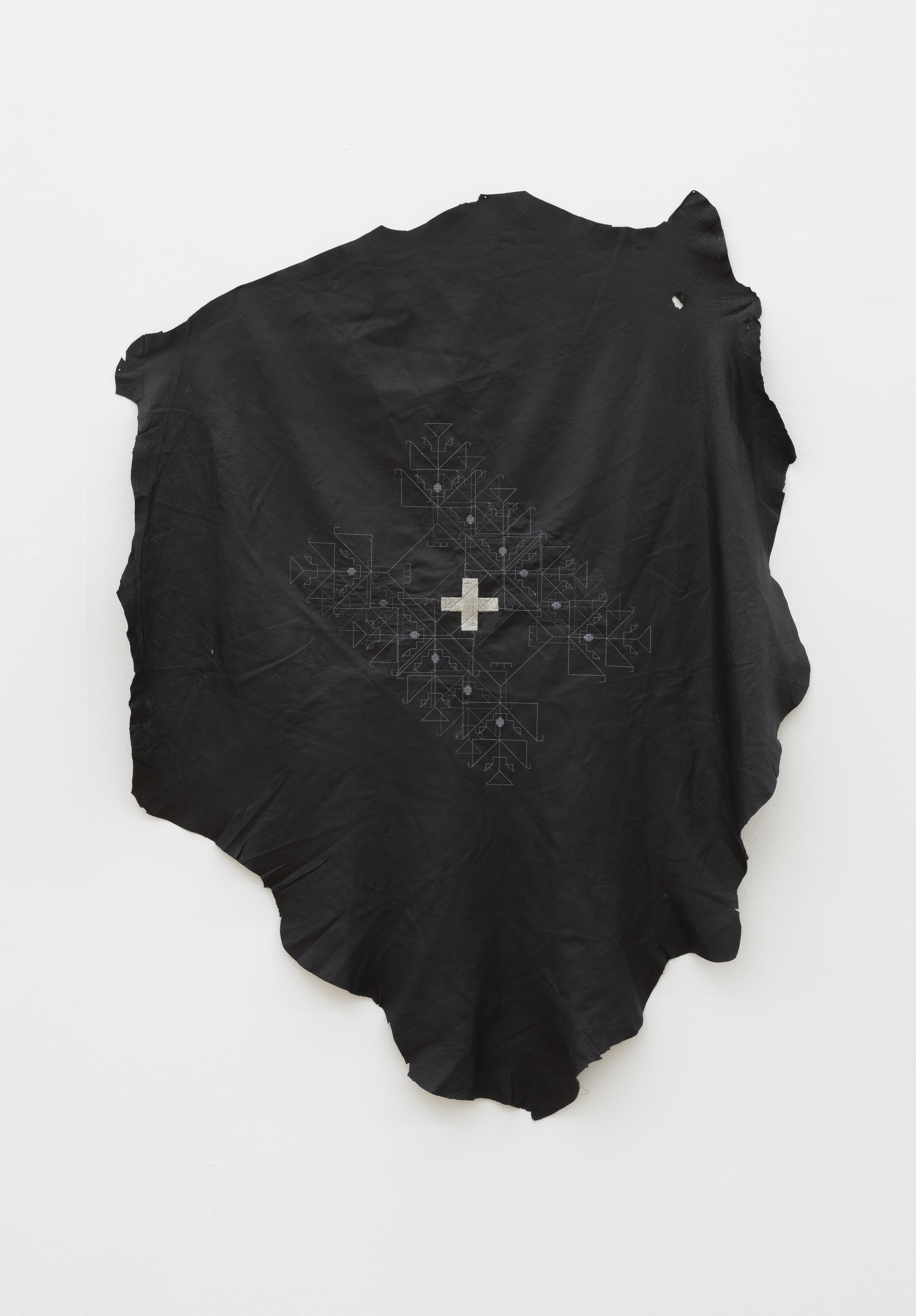 Kite (Oglala Sioux Tribe), Potential Transformation of Power, 2019. Silver thread on black leather , 21 × 18 in.