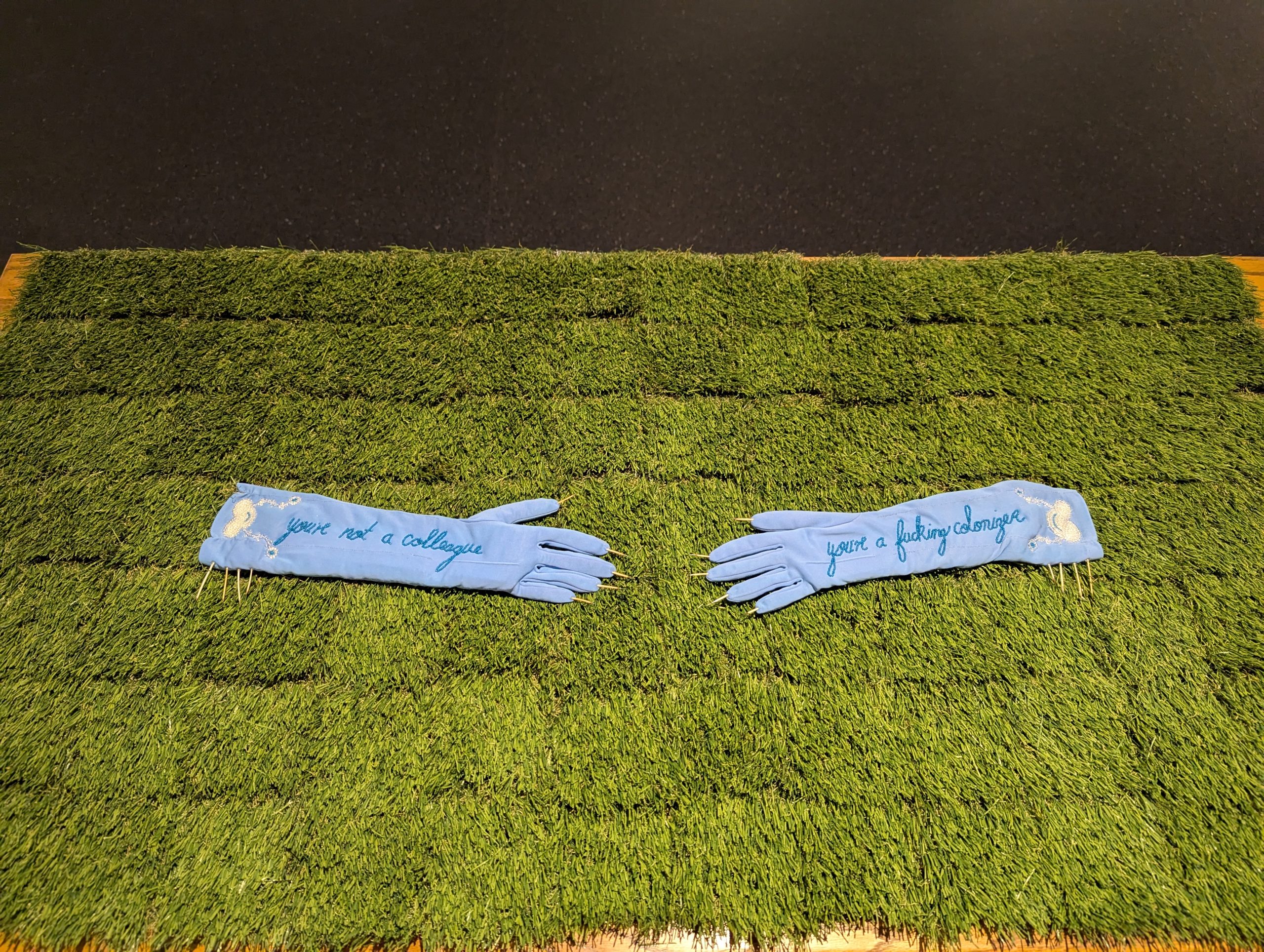 Audie Murray (Métis), Protection, 2020. Condom, gunmetal seed beads, glass seed beads, 24k gold delica beads, 9 × 5 × 3 in.