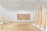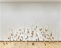 Sonya Kelliher-Combs (Iñupiaq and Athabascan), Natural Idiot Strings, 2022. Wool, sheep rawhide, nylon thread, steel wire, beeswax, 12 × 180 × 96 in.