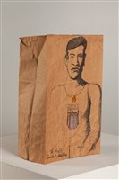 G. Peter Jemison (Enrolled member of the Seneca Nation of Indians, Heron Clan), Jim Thorpe, 1982. Marker, Colored Pencil, Collage on Key Foods Bag, 16 × 9 ¾ × 6 ¼ in.