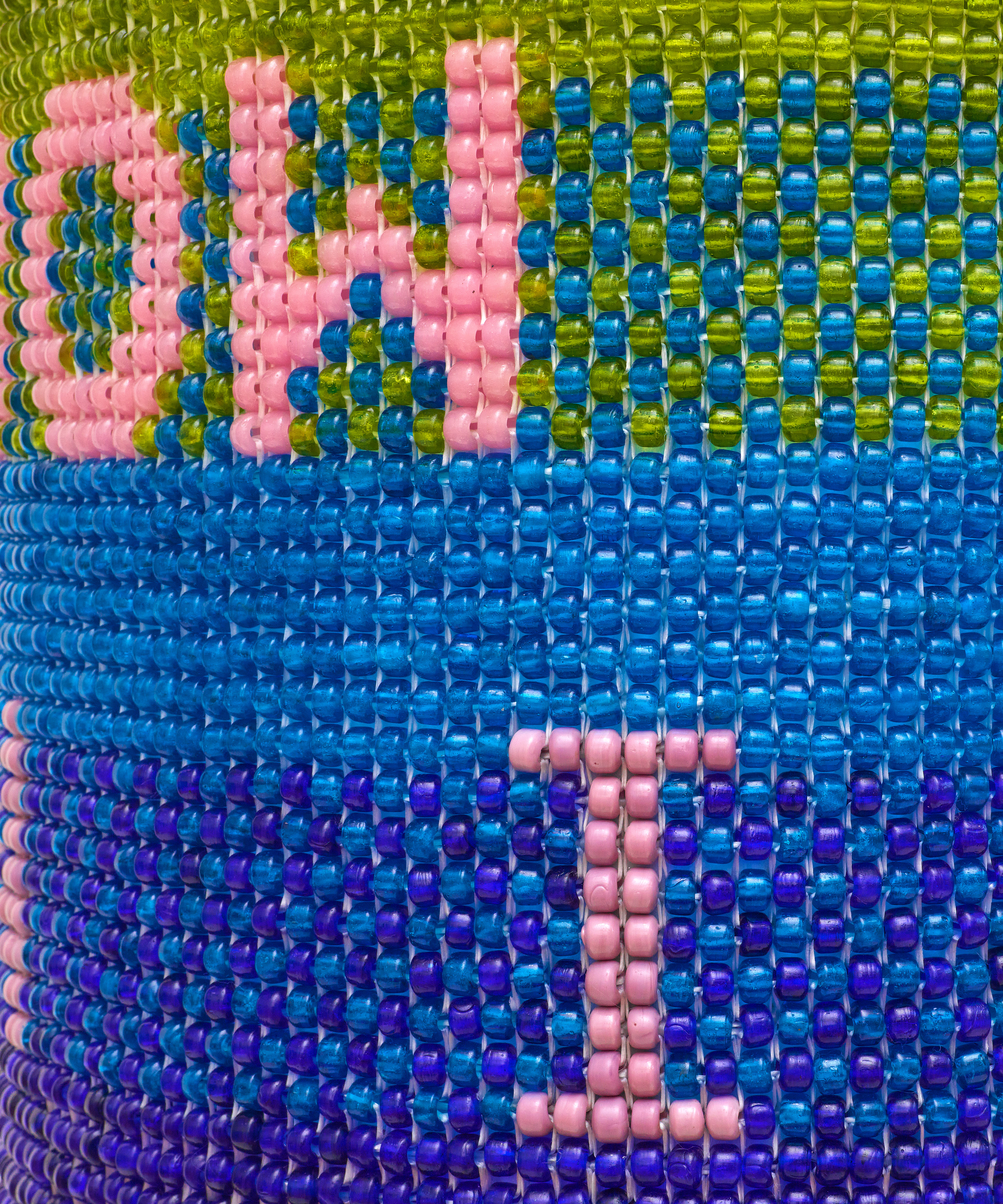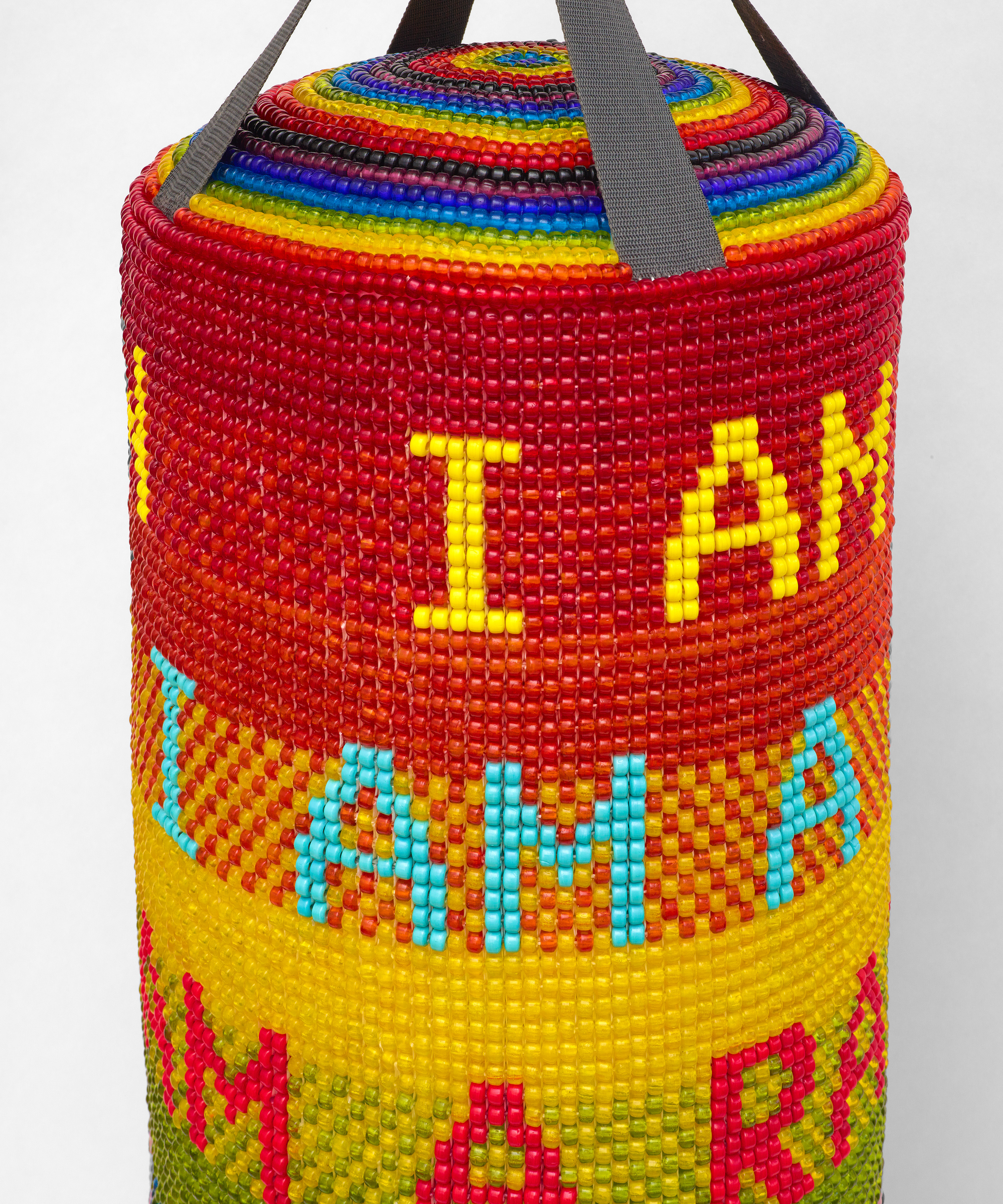 Found punching bag, glass beads, artificial sinew, acrylic, felt
