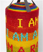 Jeffrey Gibson (Mississippi Band of Choctaw and Cherokee), I AM A RAINBOW, 2022. Found punching bag, glass beads, artificial sinew, acrylic, felt, 52 ¾ × 14 5/8 × 14 ¼ in.