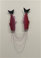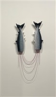 Erin Ggaadimits Ivalu Gingrich (Koyukon Athabaskan & Inupiaq), Iqalukpik Double from Kenai River , 2022. Basswood, Acrylic, Glass beads, and Salmon Vertebrae, 50 × 20 × 2 in.