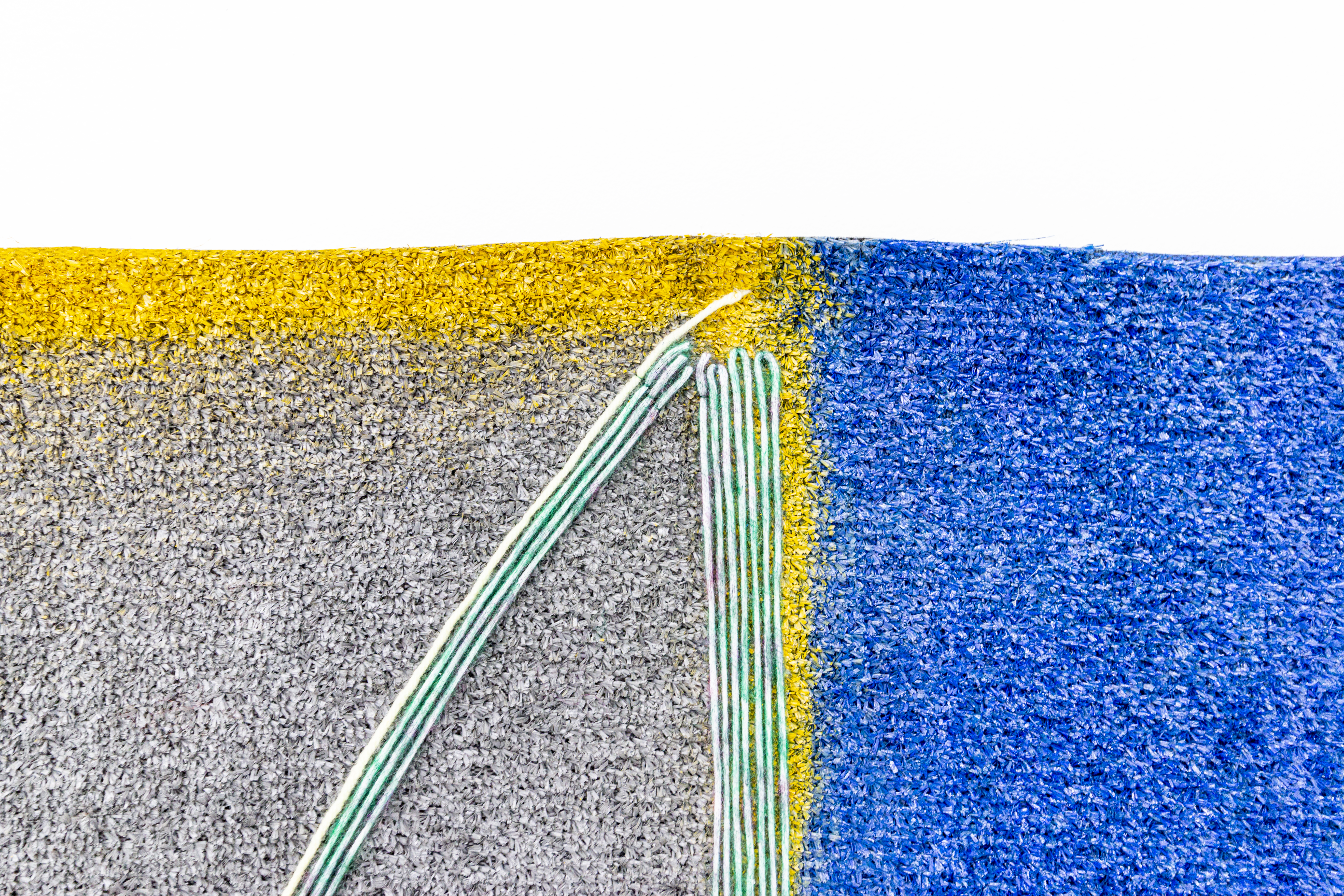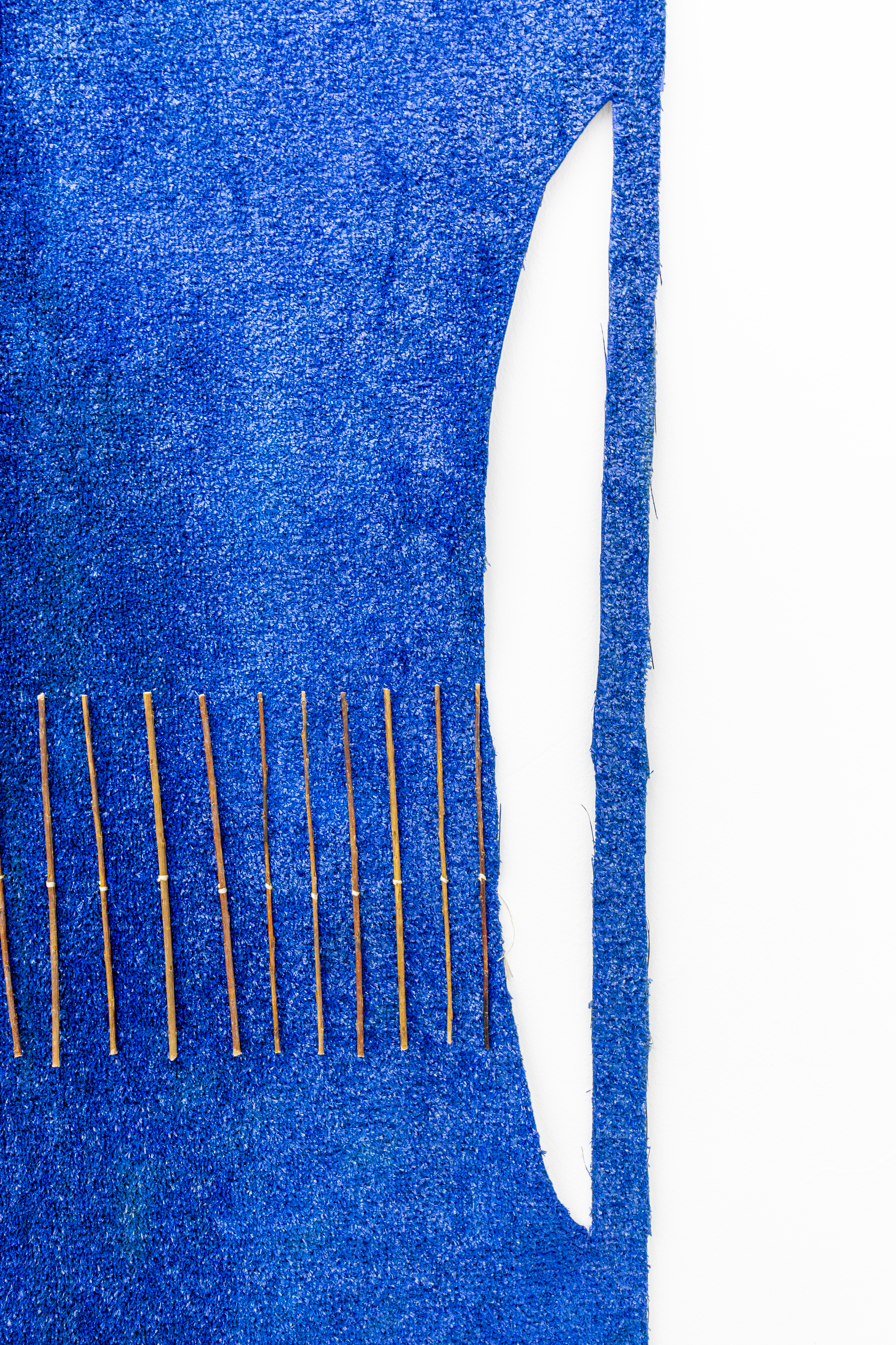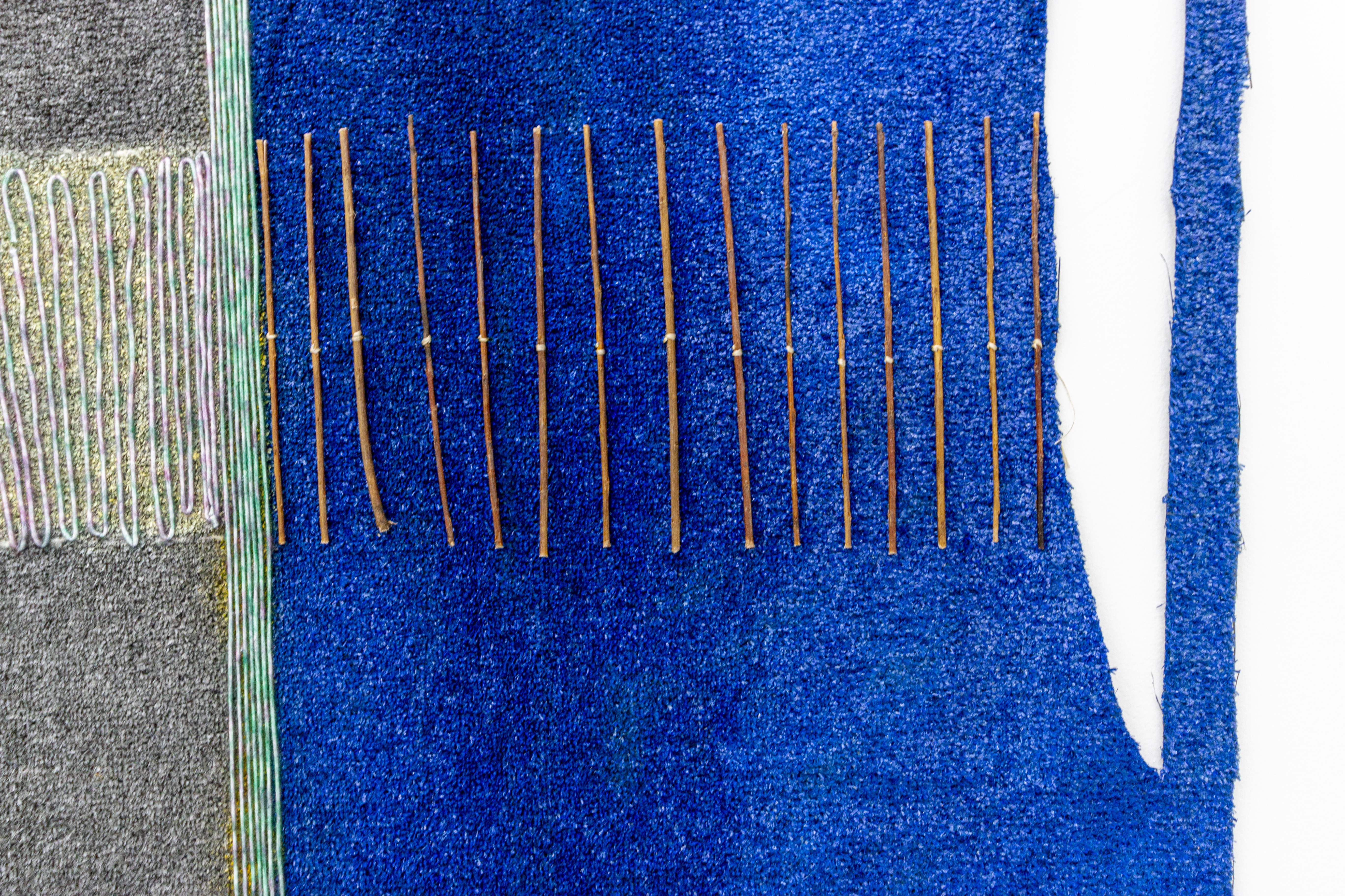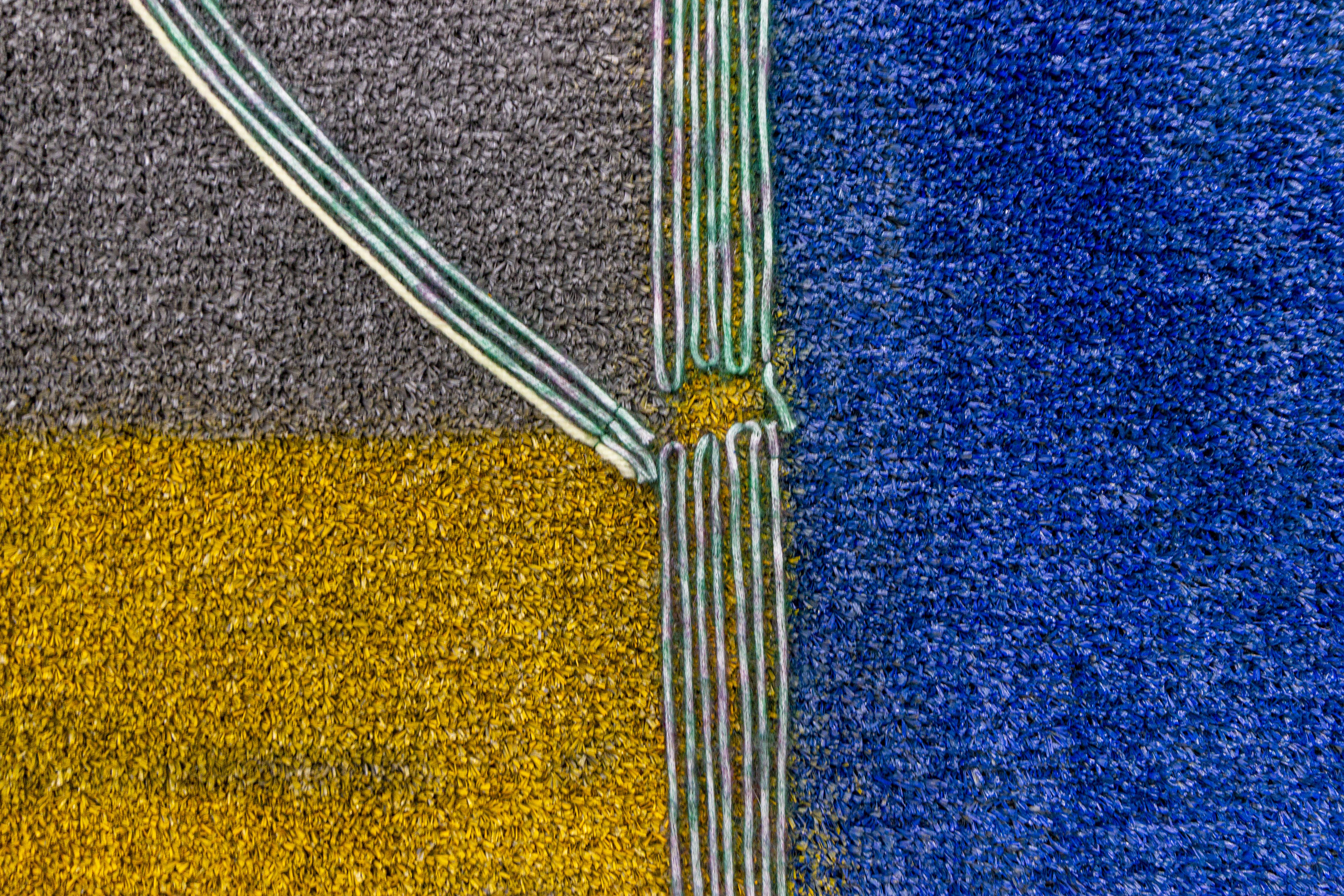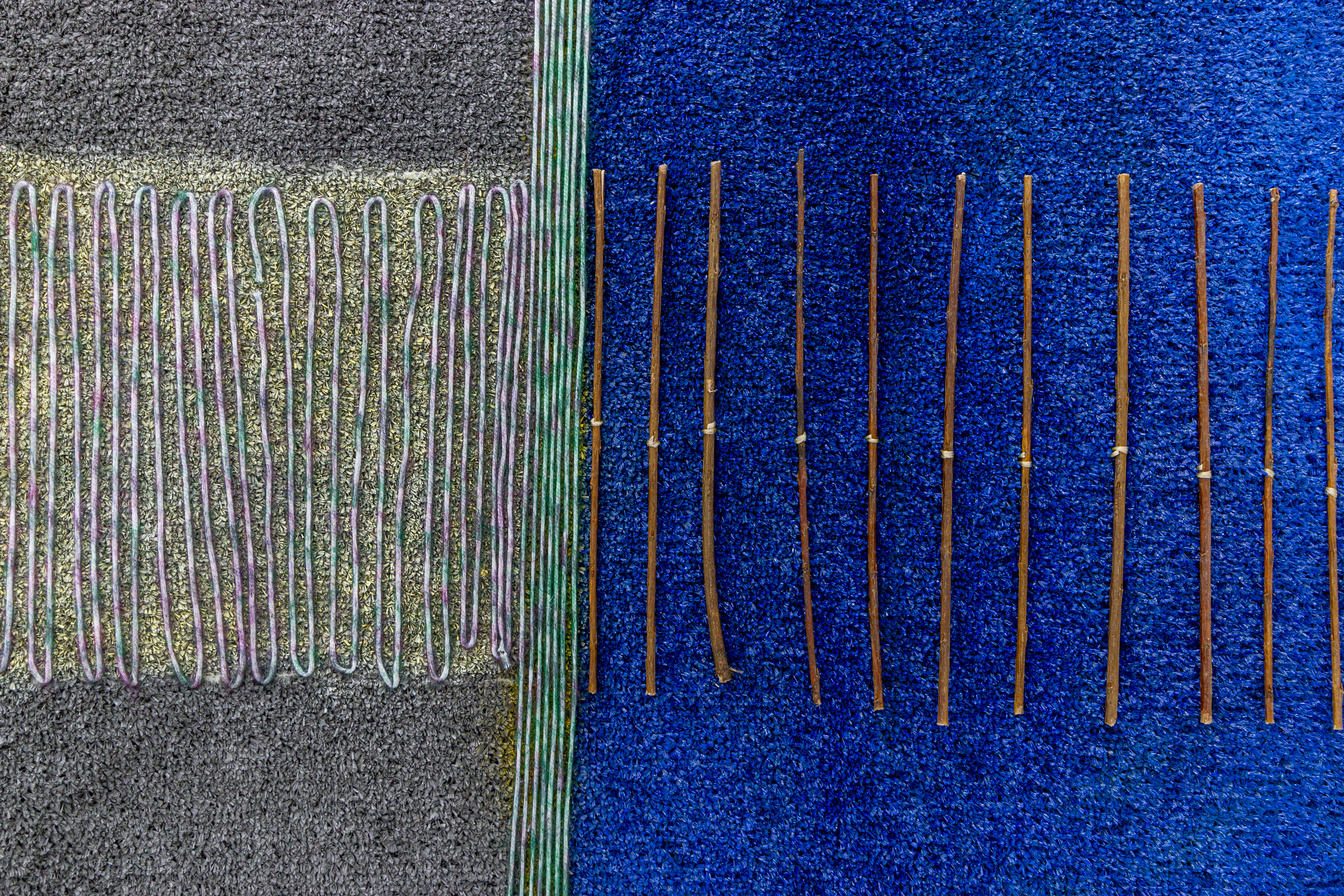 Teresa Baker (Mandan/Hidatsa), Field Notes, 2022. Willow, spray paint, and yarn on artificial turf, 74 × 120 in.