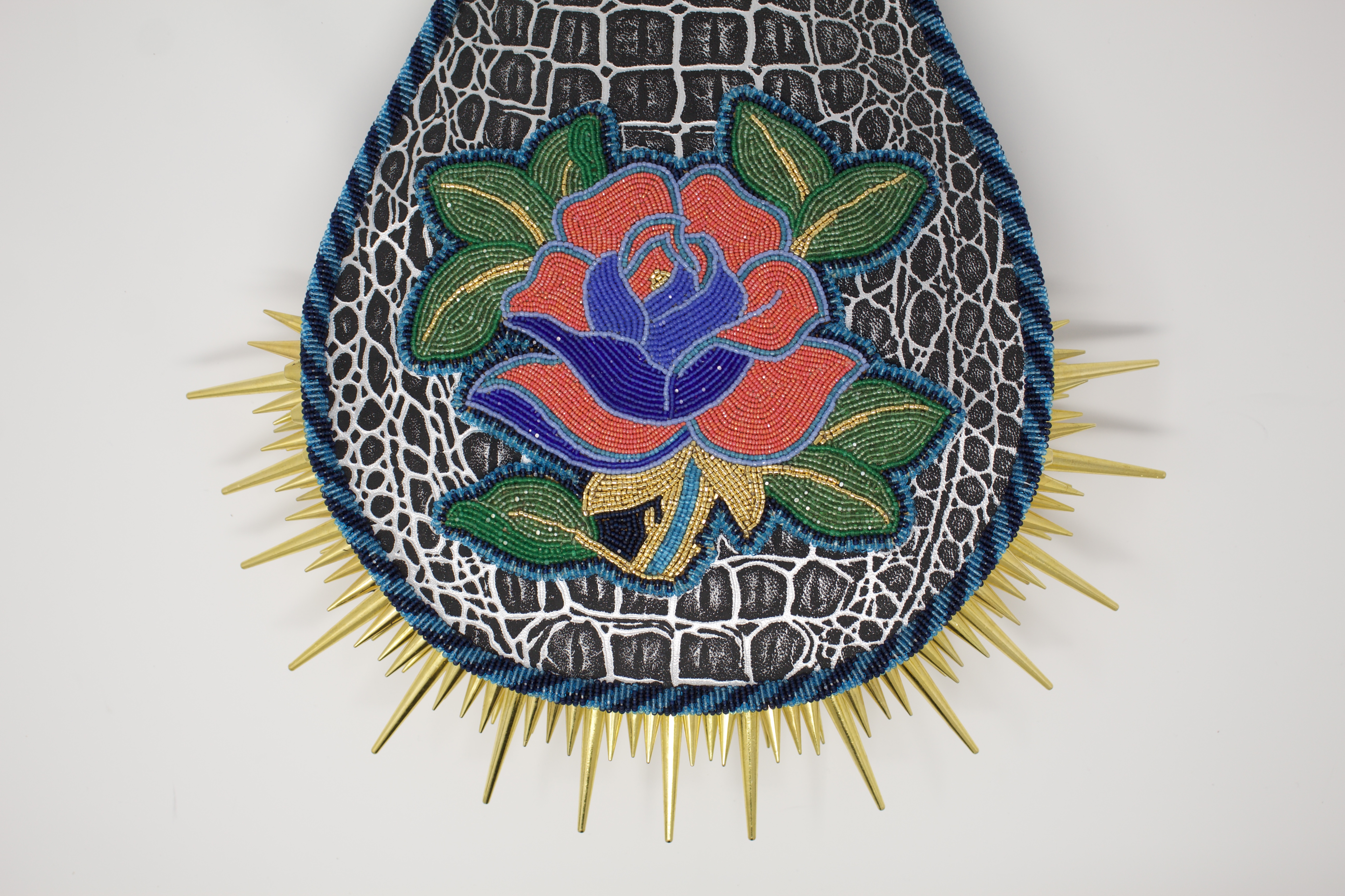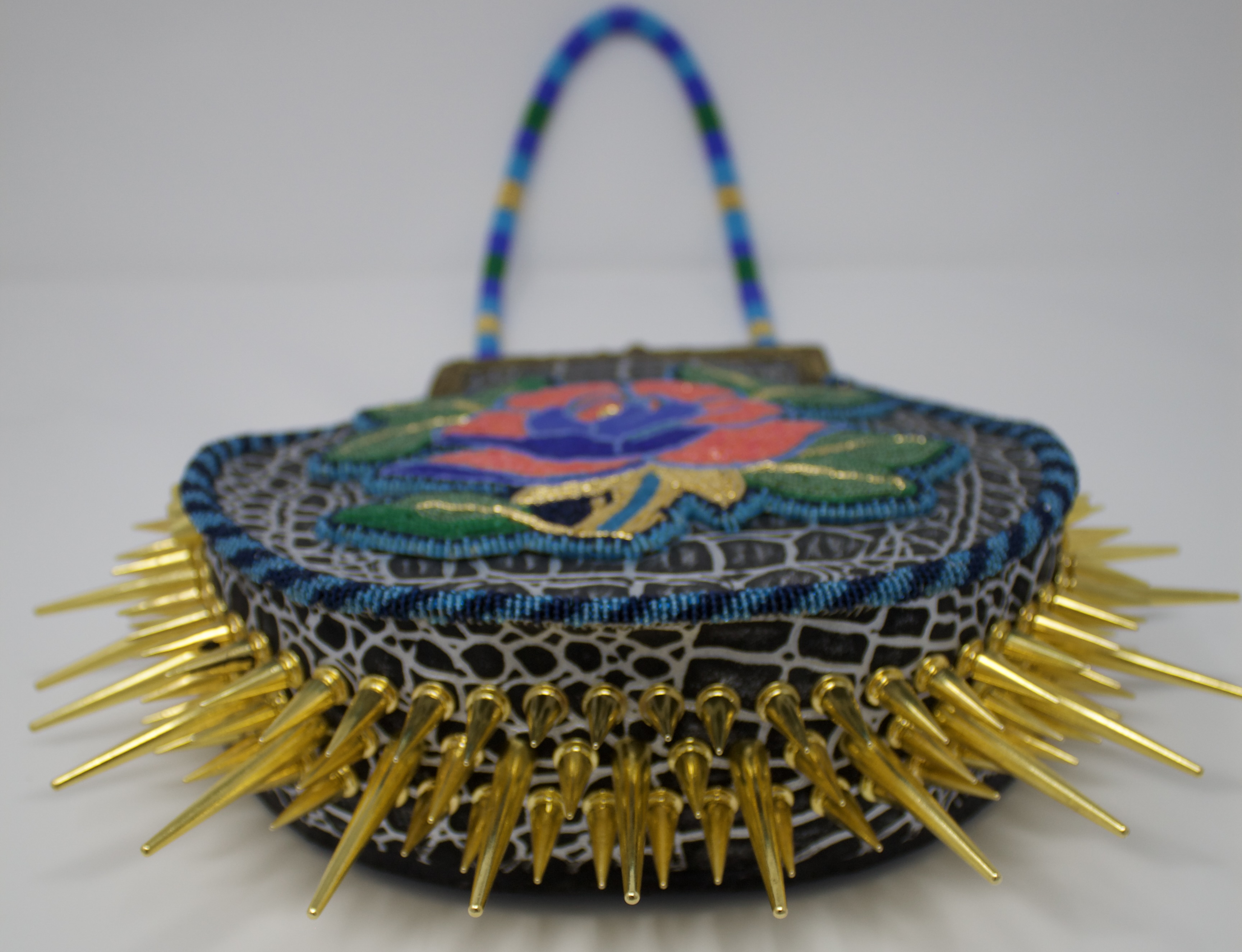 This bag is inspired by a old traditional Apsaalooké style bladder bag with modern fashion. They used the bladder of a Buffalo and repurposed to resemble a water proof bag. I gave the bag more dimension and added various sized spikes and this beautiful antique Victorian brass purse frame with floral motifs and a release button on the top with a floral pull-tab and a large ring in the back to hang on a wall or stand. The beadwork is all beaded on my handmade smoked deer hide with antique Venetian glass faceted seed beads with 24k gold tri cut beads. I used a rose design from my great grandmas stash of patterns for inspiration and made it large. I used the 2 needle appliqué beading technique with a crow edging technique. The leather on the exterior is high quality, hand made, embossed lamb skin from the Montana leather co. It’s where my great grandma would purchase her leather from, even her her mother purchased from them when they were establishing their business. The interior of the bag is lined with Italian leather. I even added a thick beaded handle/strap to hold or rest on the shoulder.