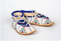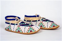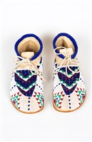 “ isbaapítiisaakshe (grandson)” These are the first moccasins that I wasn’t able to wear because I didn’t measure them correctly and after beading and sewing them together, I turned them inside out and they hardly fit my feet and so I held on to them over the years stashed away. I used my great grandma Joy’s beads from her small bead collection that was in a metal tin all mixed together *in photo attached, that was left over and I held on to them before they demolished her house without me knowing. They are all old Venetian seed bead with no facets. and later I added more beads to the top part of the moccasins. They are a size 9 in mens.