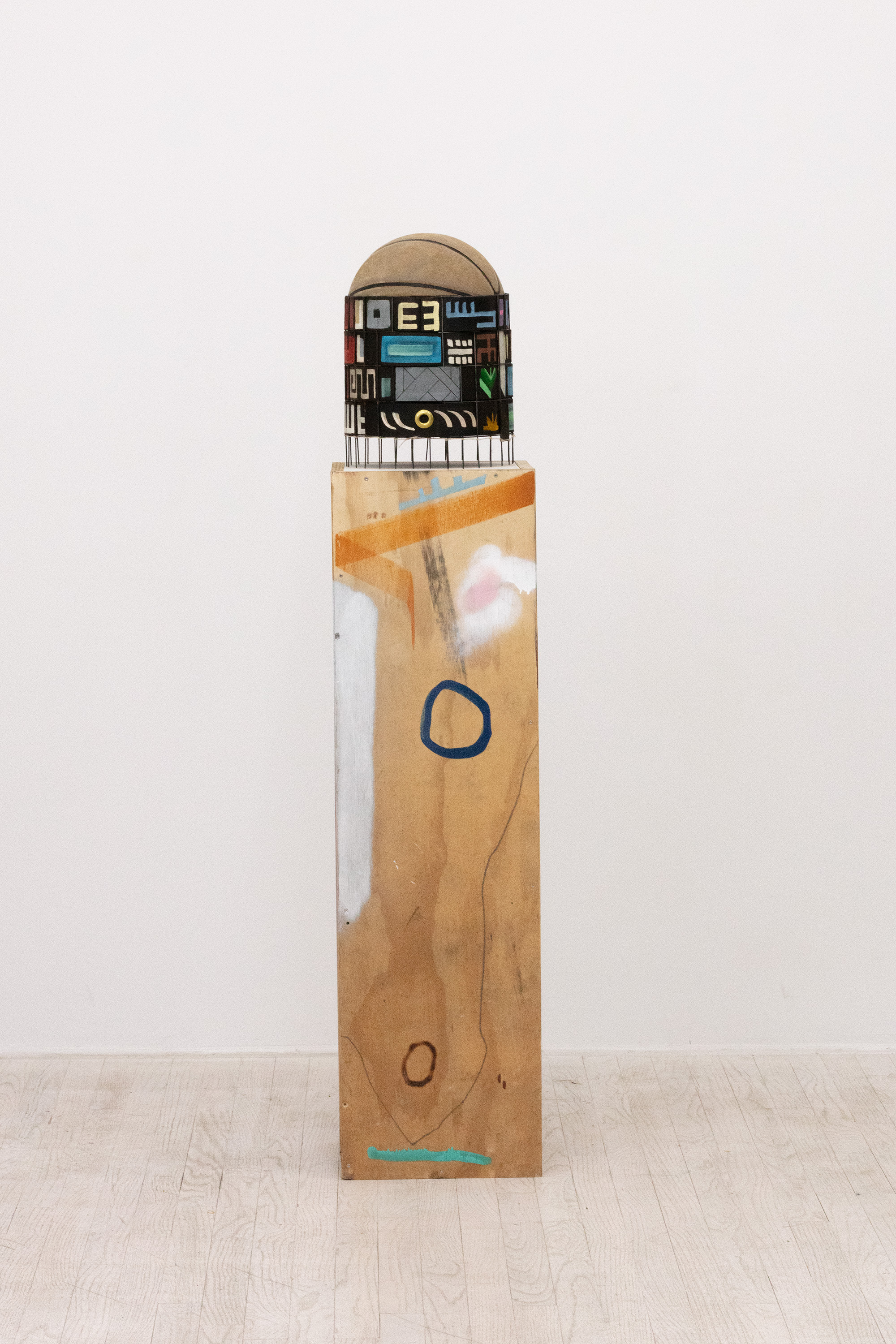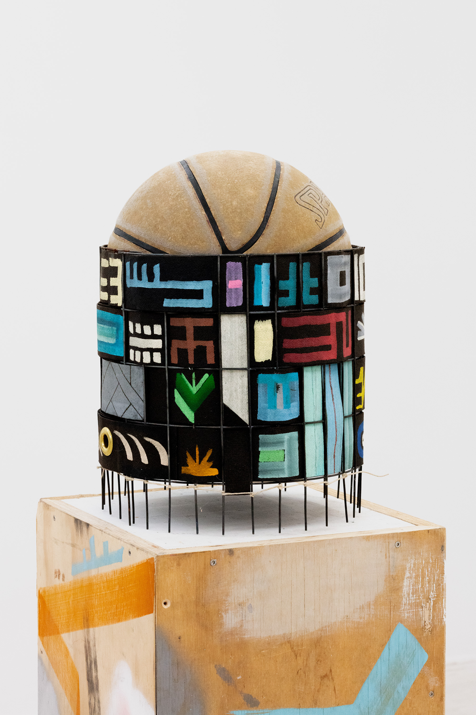 Mixed media on tar paper, steel wire mesh, twine, brass grommet, sun-aged basketball