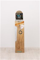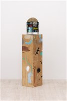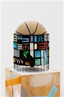 Matthew Kirk (Navajo), Trophy, 2022. Mixed media on tar paper, steel wire mesh, twine, brass grommet, sun-aged basketball, 13 ½ × 9 ½ in.
