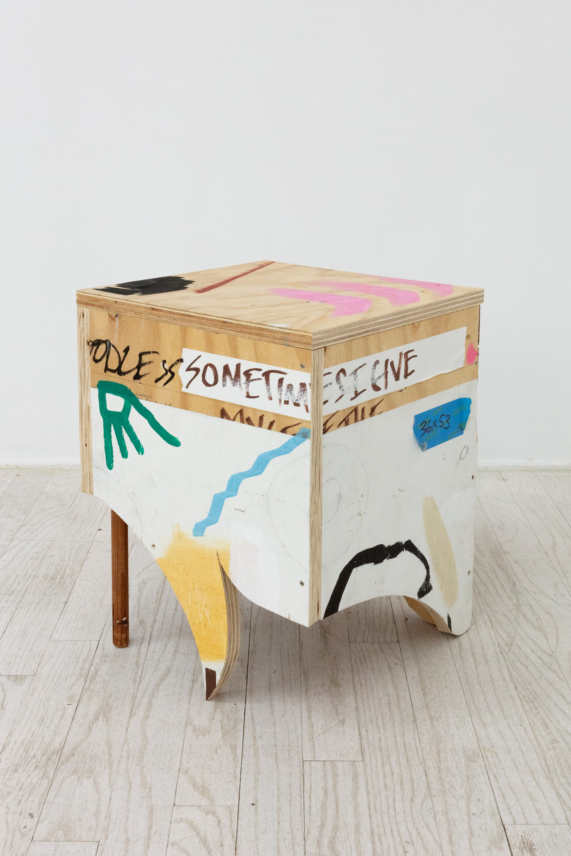 Chalk, graphite, acrylic paint marker, oil stick, spray paint, and dowels on plywood