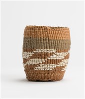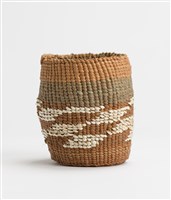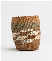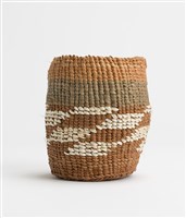 Sara Siestreem (Hanis Coos), tea with Kathleen, about a dead queen, 2015-2022. Spruce Root (Jordan Cove), Indigo Dye (Linton), Hopi Red Dye Amaranth (Linton), Bear Grass (Baldich), 5 × 3 ¾ × 3 ¾ in.