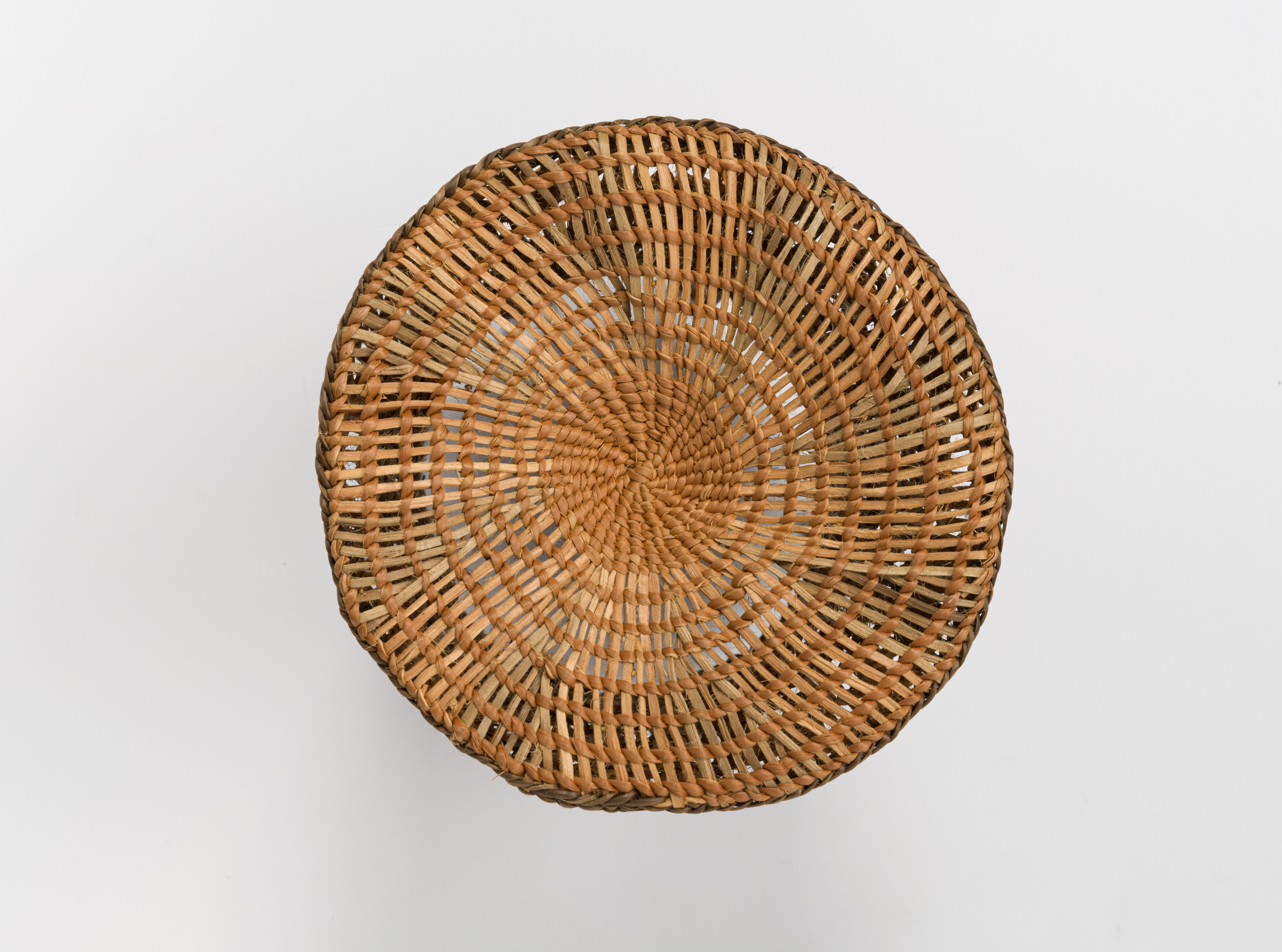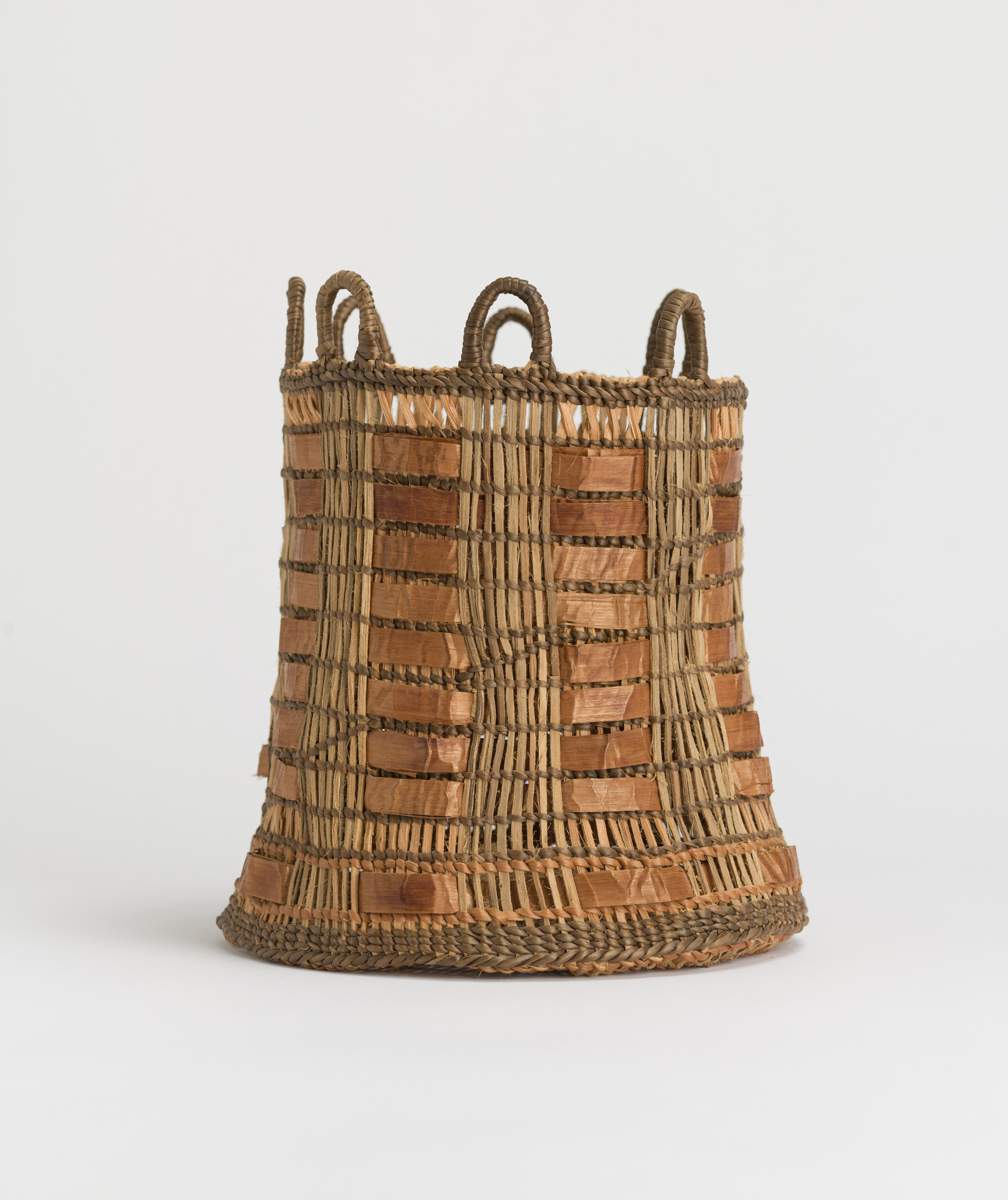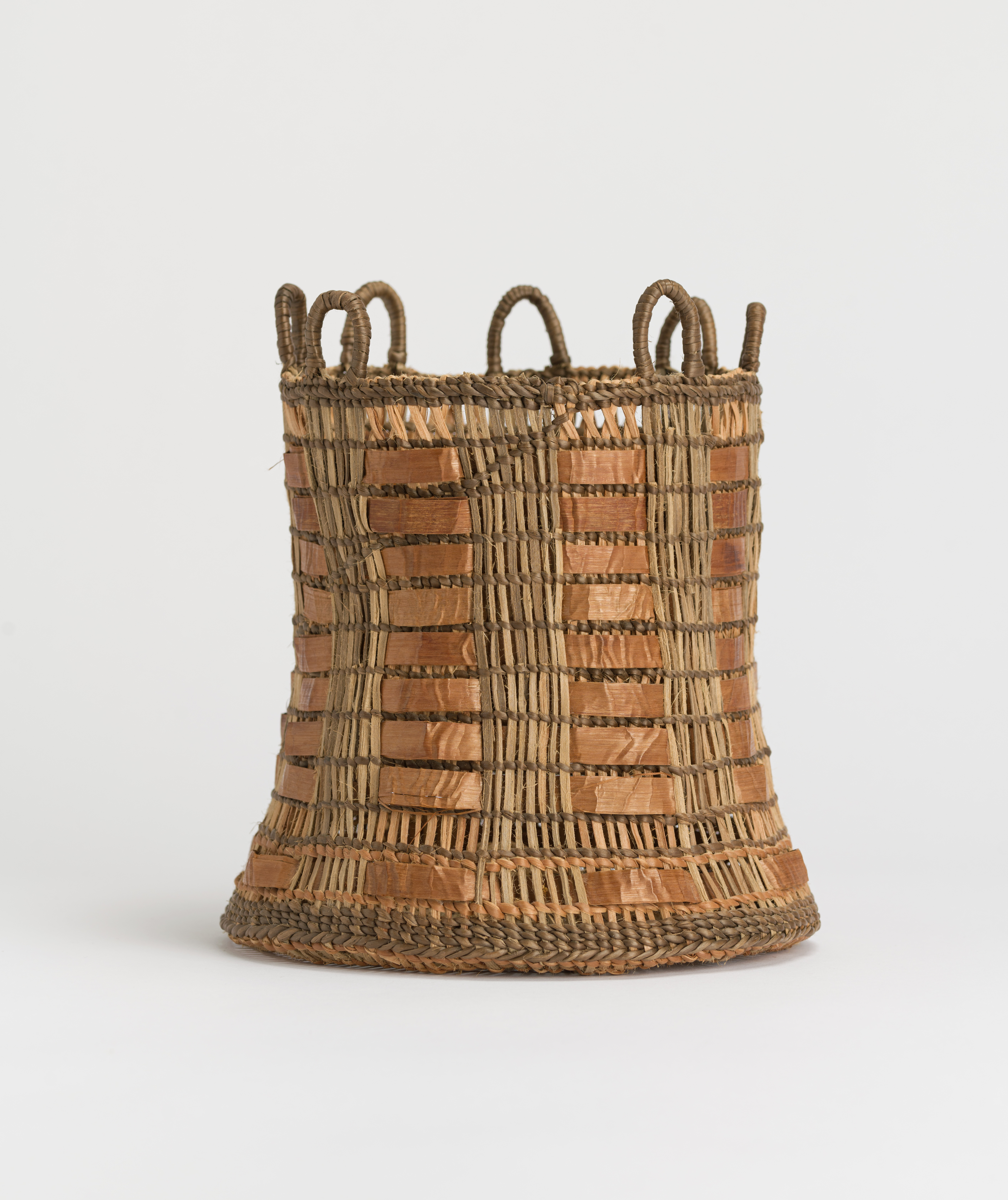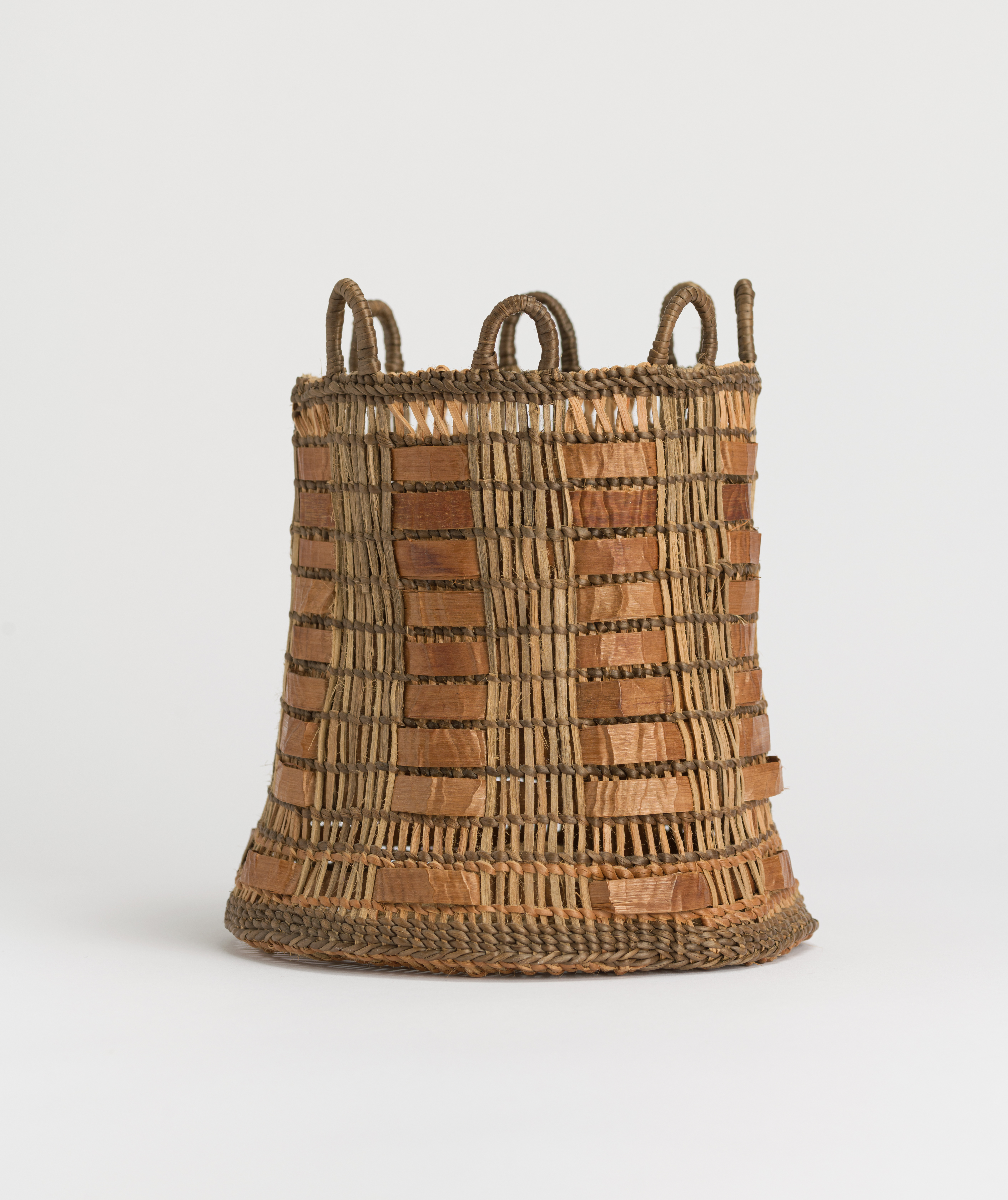 Sara Siestreem (Hanis Coos), science fiction crawdad trap (we used to eat from the stream) , 2016. Red Cedar Bark (Siuslaw Forest), Mud Dye (place of beginning, Coos Bay) and Spruce Root (Jordan Cove) , 9 × 7 ½ × 7 ½ in.