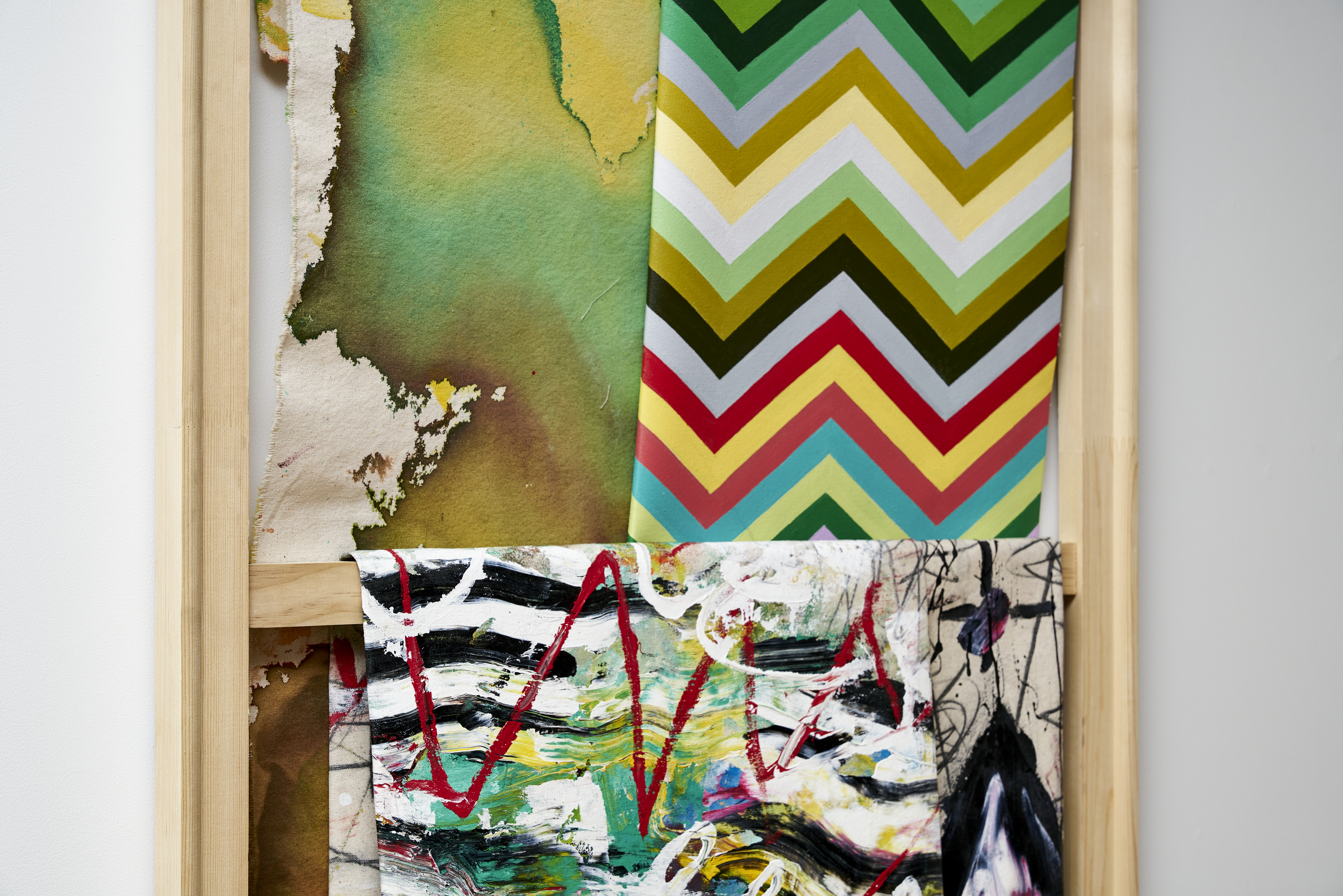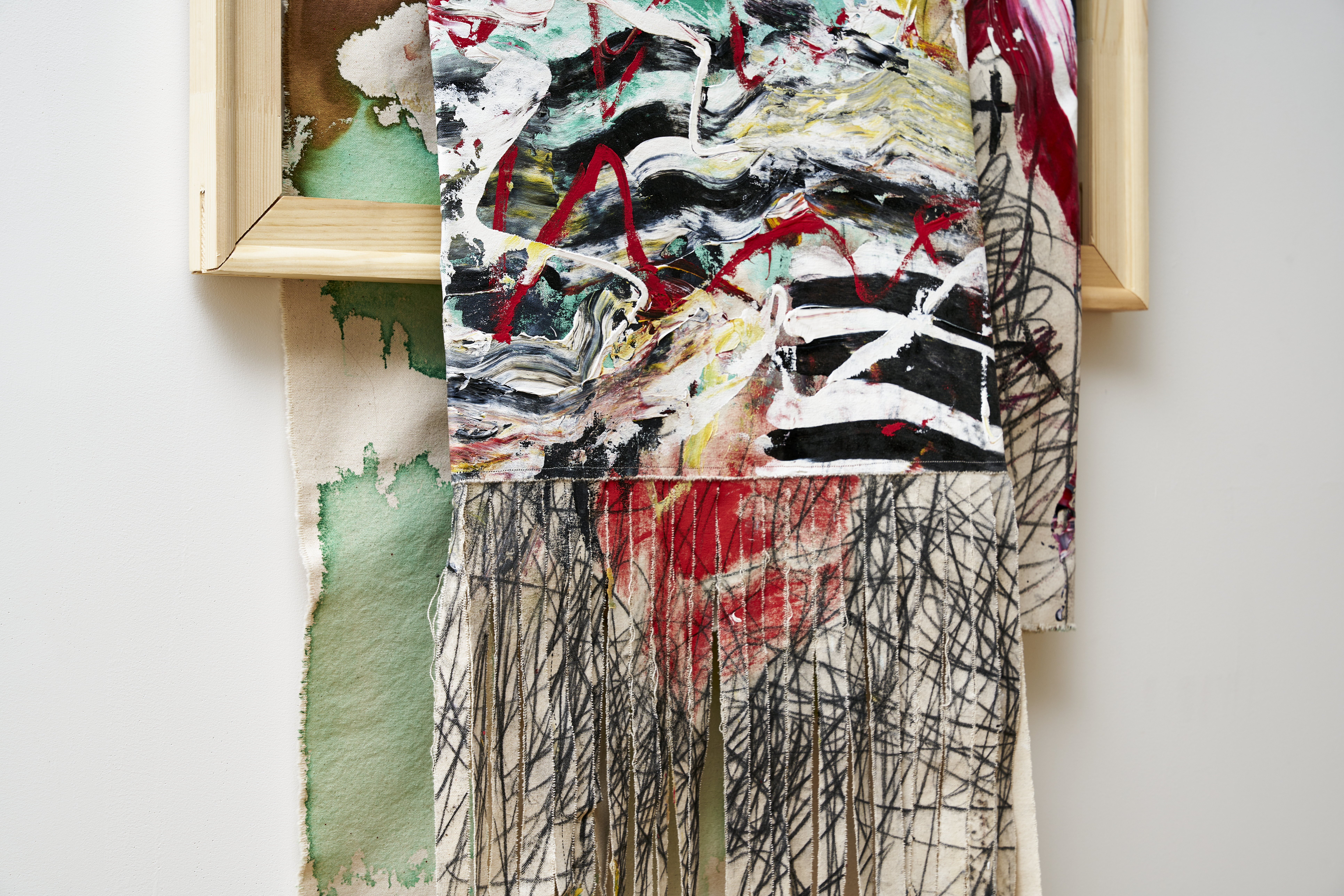 Oil, acrylic, enamel, charcoal, acrylic dispersion, sewing on canvas, wood stretcher bar frame