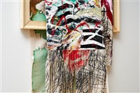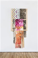 Patrick Dean Hubbell (Diné), Your Spiritual Light Rises Above All My Imperfections, 2023. Oil, acrylic, enamel, charcoal, acrylic dispersion, sewing on canvas, wood stretcher bar frame, 65 × 30 in.