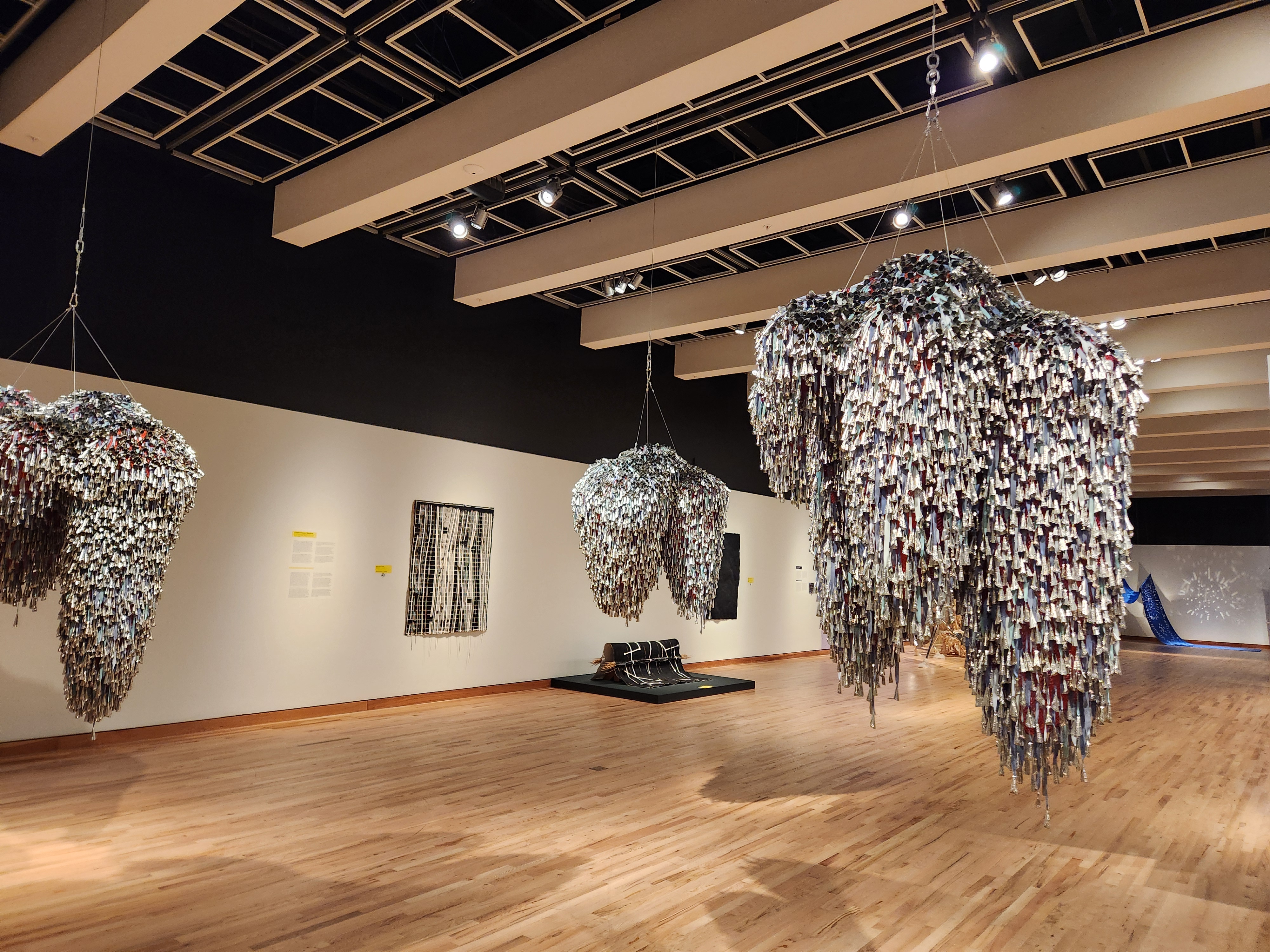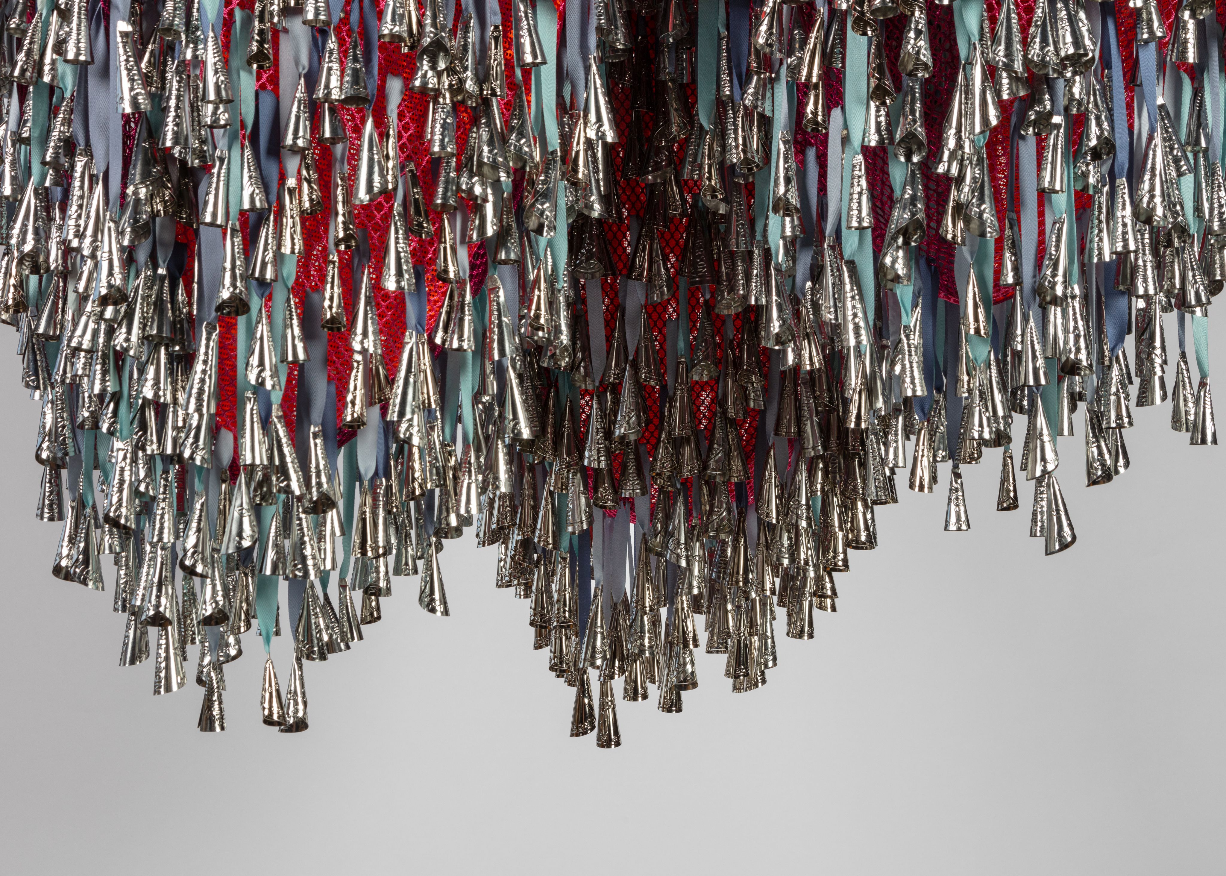 Marie Watt (Seneca and German-Scot), Sky Dances Light: Revolution VIII, 2023. Tin jingles, cotton twill tape, polyester mesh, steel, 50 × 38 × 35 in. weight: 45 lbs.