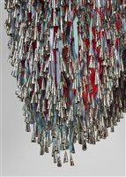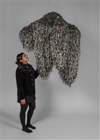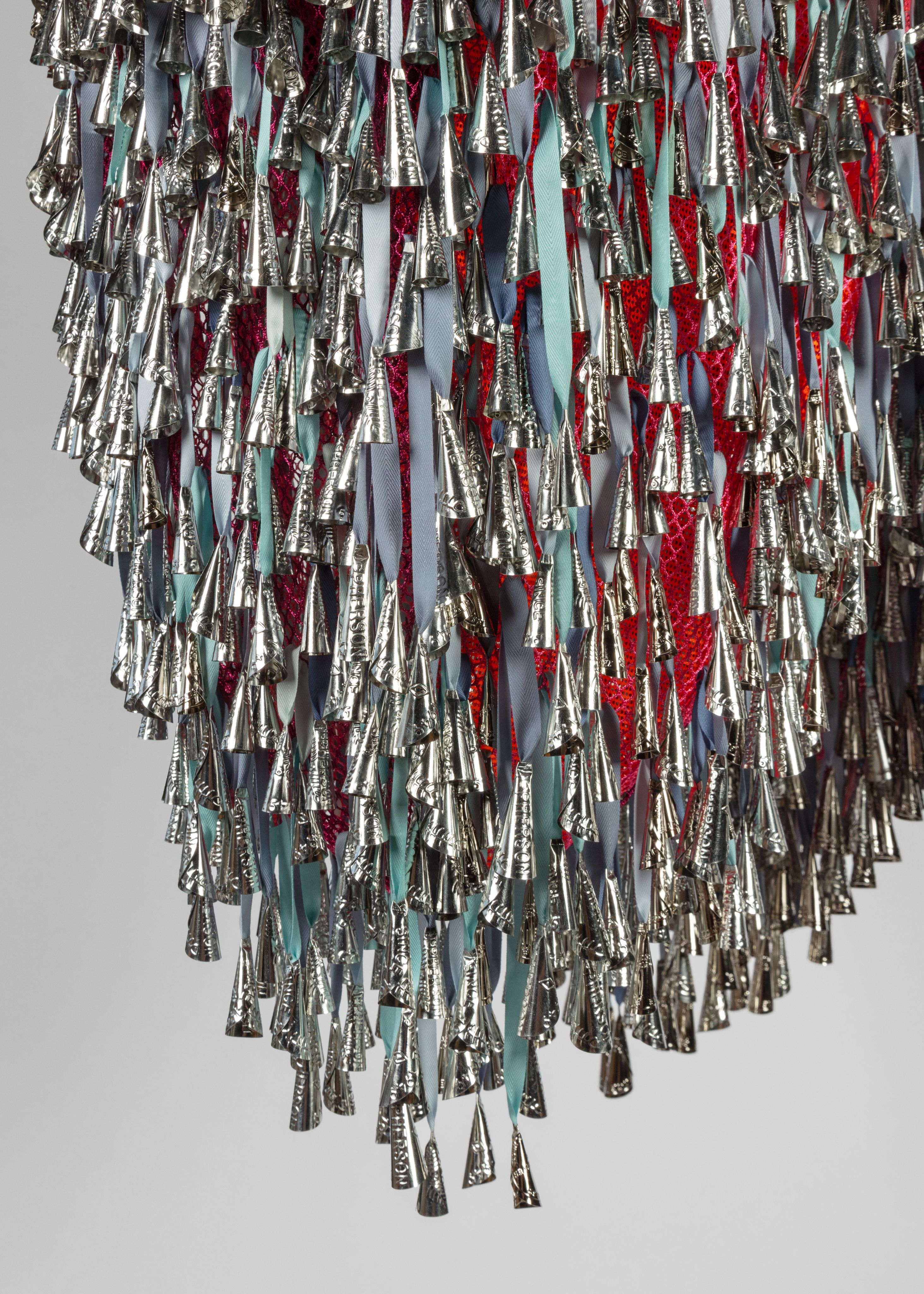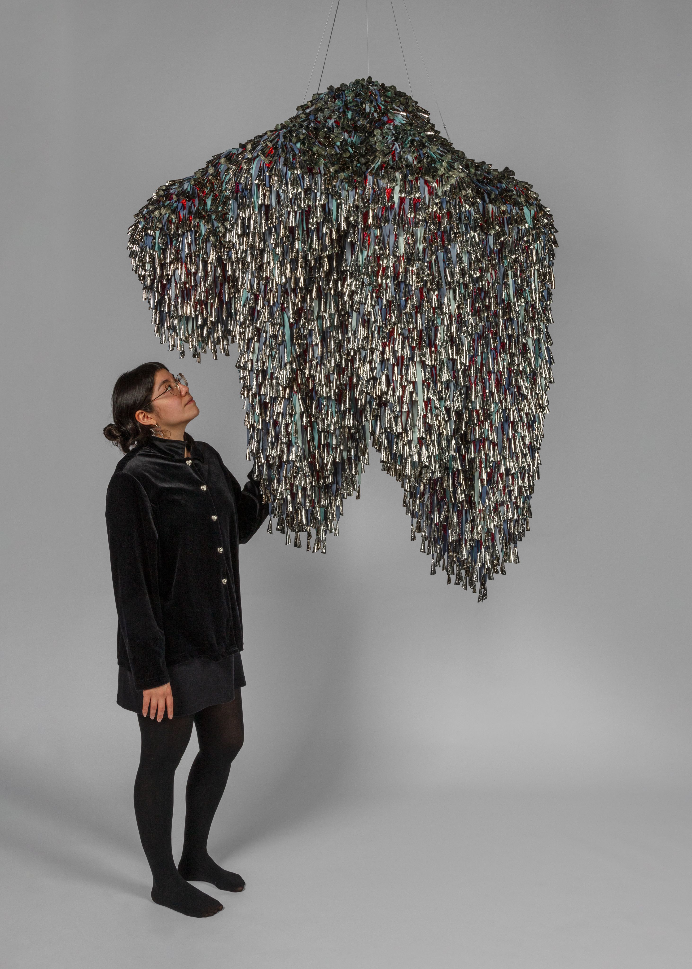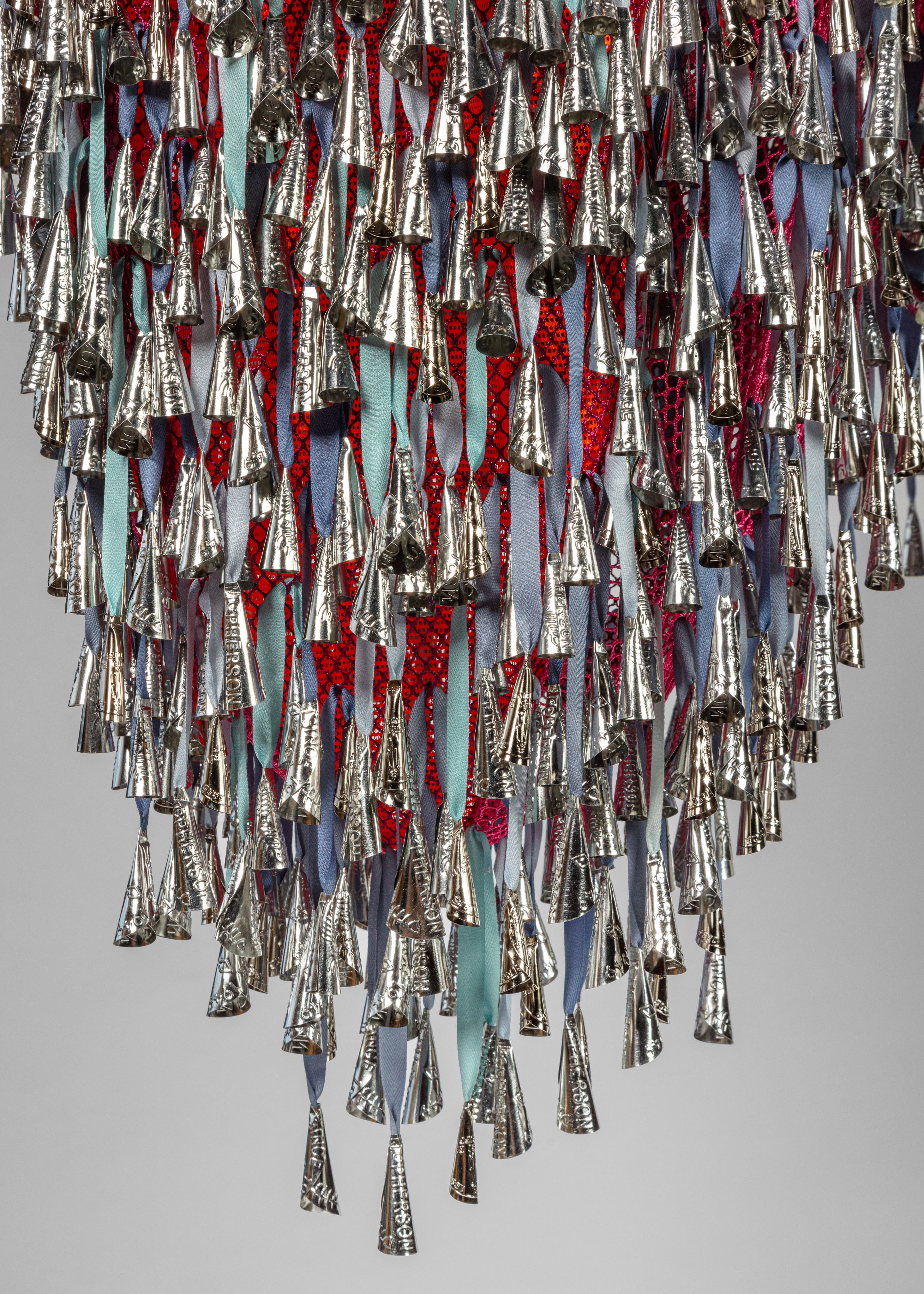 Marie Watt (Seneca and German-Scot), Sky Dances Light: Revolution IX, 2023. Tin jingles, cotton twill tape, polyester mesh, steel, 61 × 46 × 41 in. weight: 52 lbs.