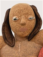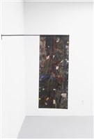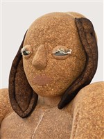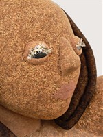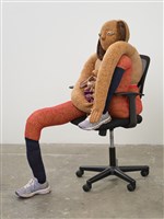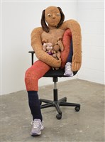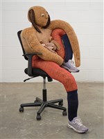 Gabrielle L'Hirondelle Hill (Métis), Untitled, 2023. Tobacco, nylon stockings, stones, pressed flowers, chair, sneakers, compression socks, thread, nail polish, copper, 49 × 24 × 37 in.