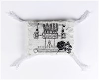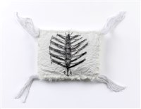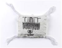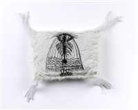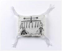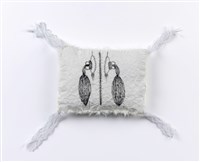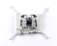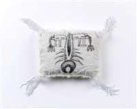 Eric-Paul Riege (Diné), pillow drawing 12, 2023. Wax crayon, archival and India ink on paper, sewn to faux fur with thrifted yarn, 12 × 15 ½ × 3 in.