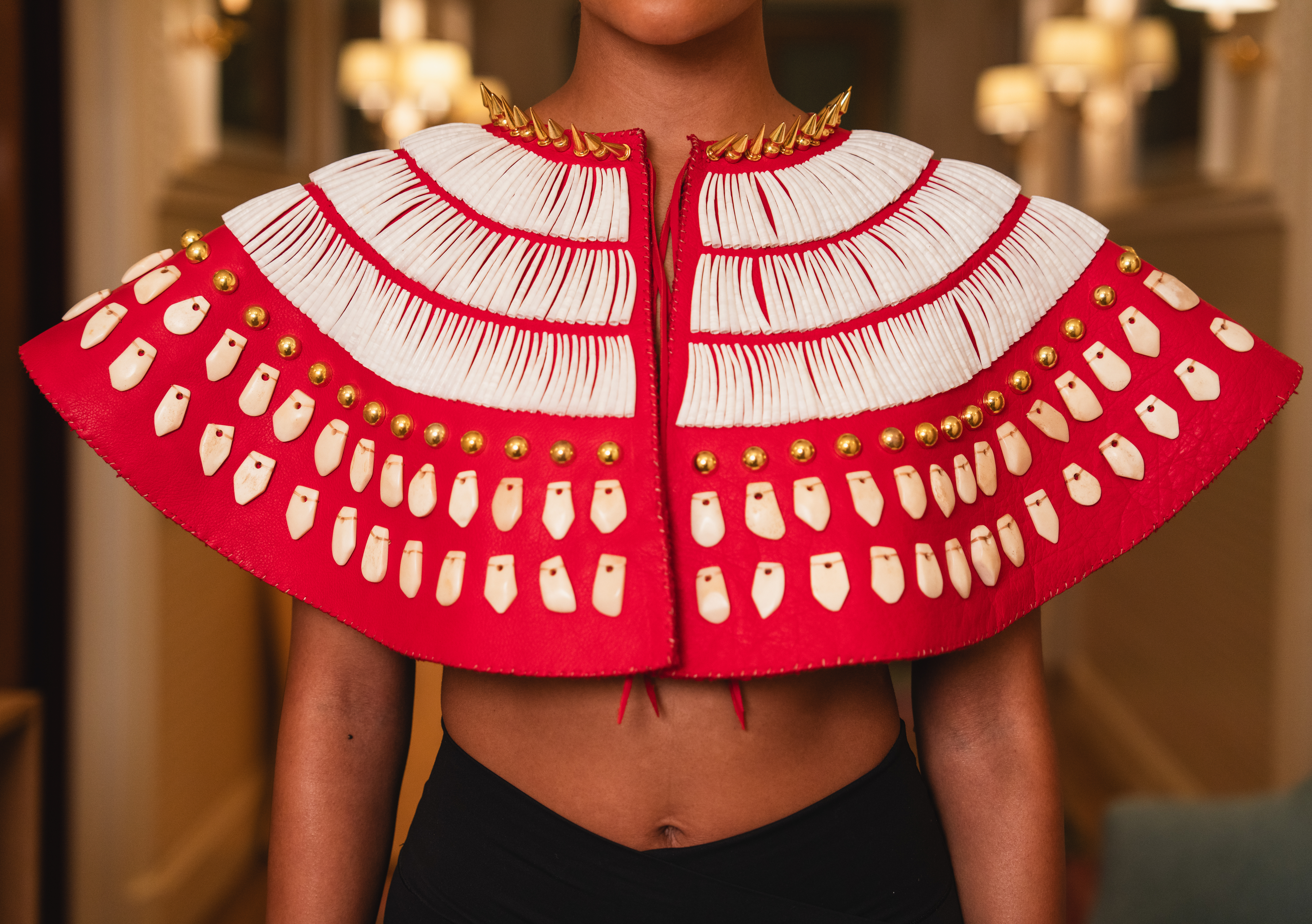 Dentalium shells, Gold spikes, Gold round rivets, Red leather, Sinew, Wool trade cloth, Elk teeth