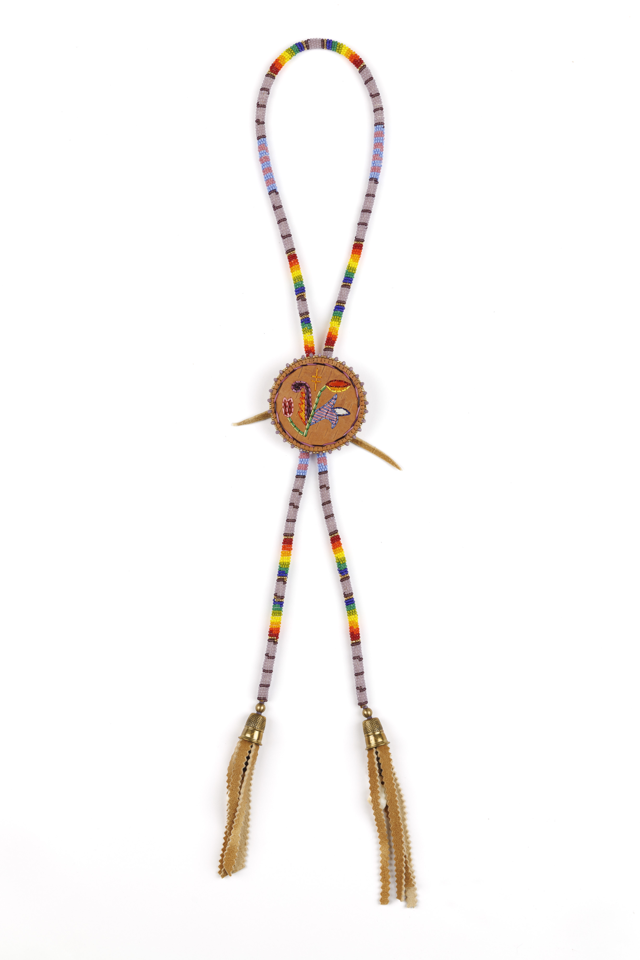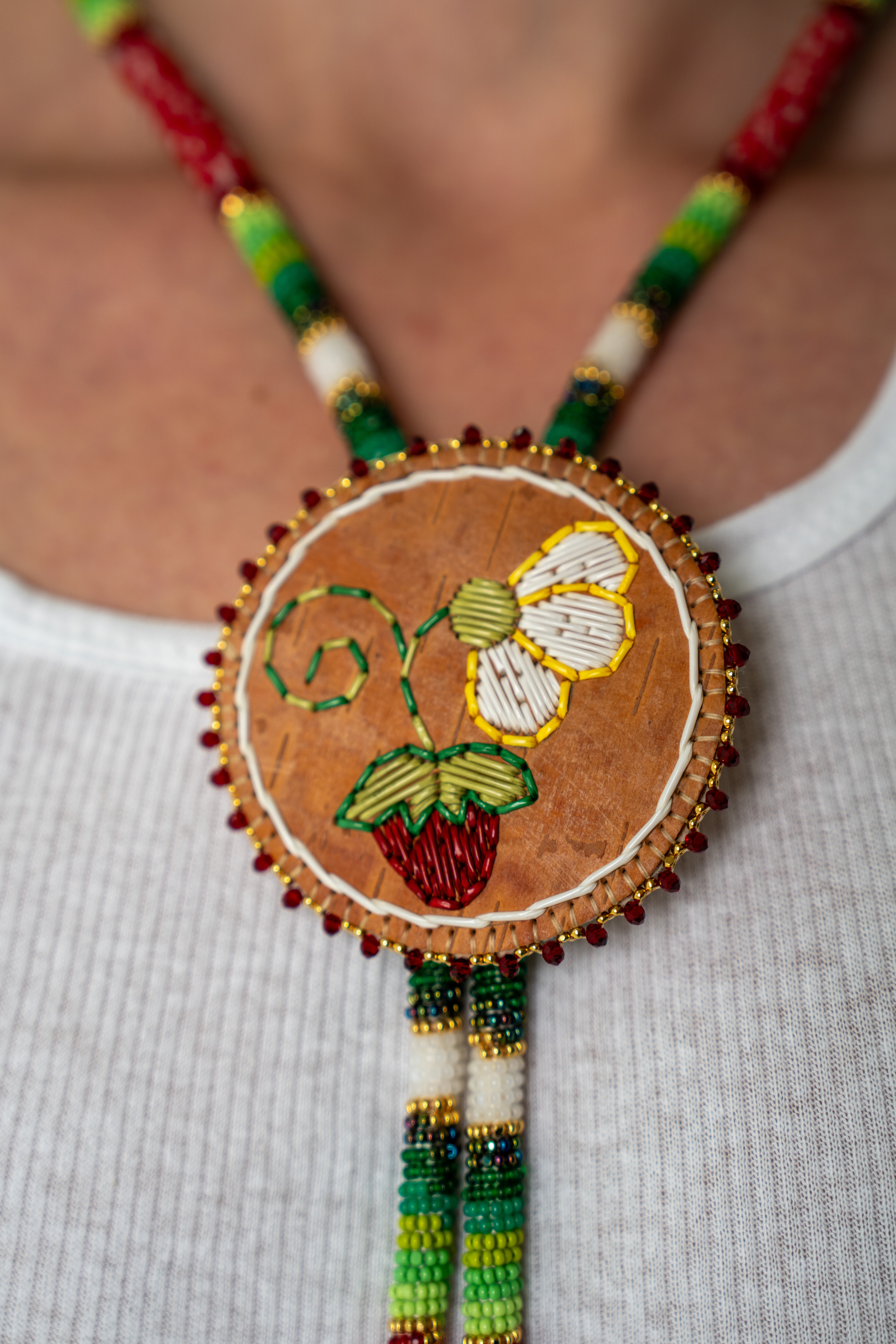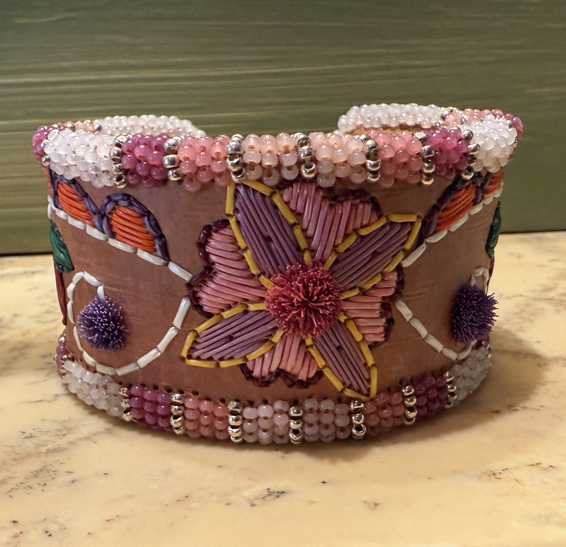 Woodland porcupine quillwork on birch bark with smoked deer hide on a beaded rope