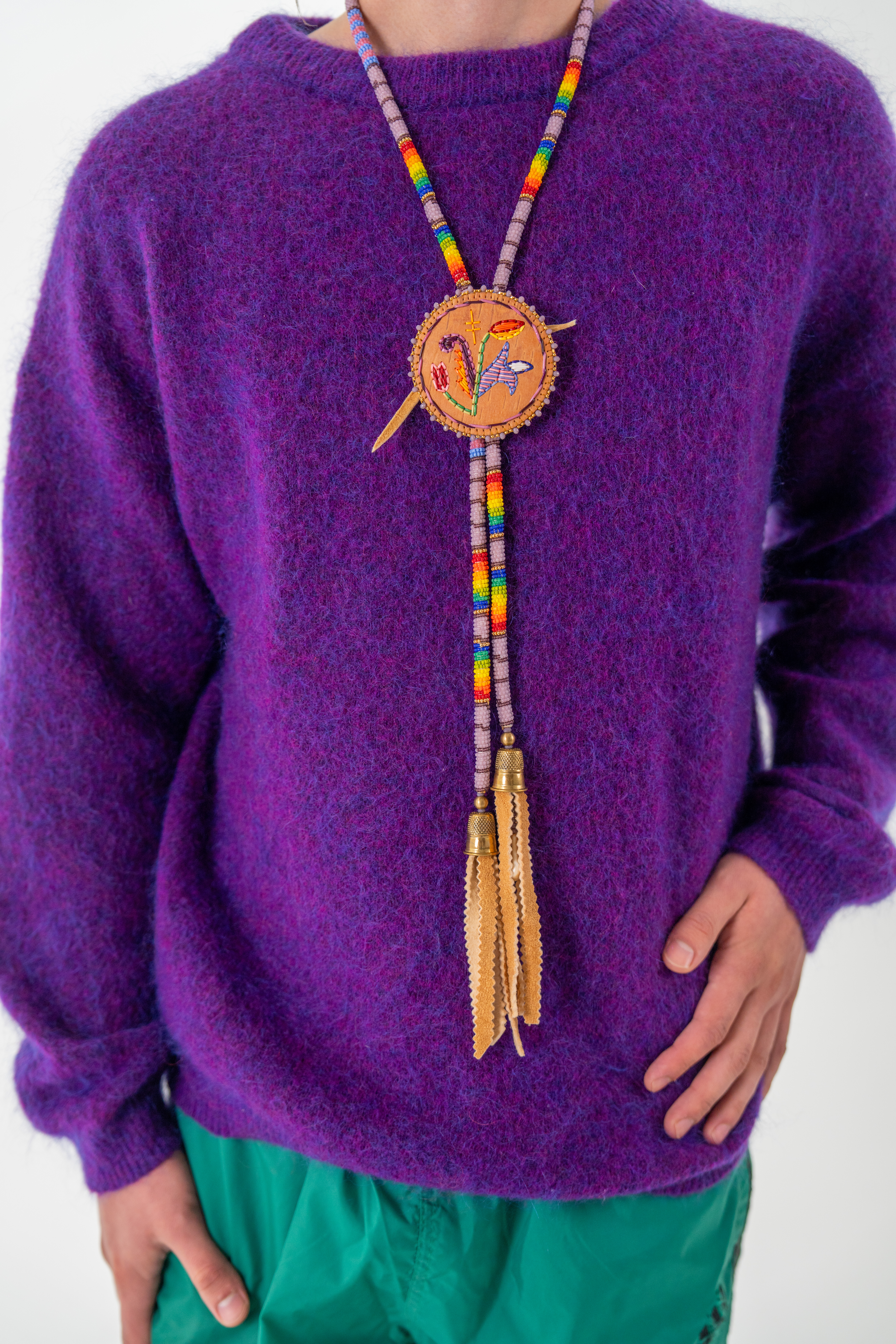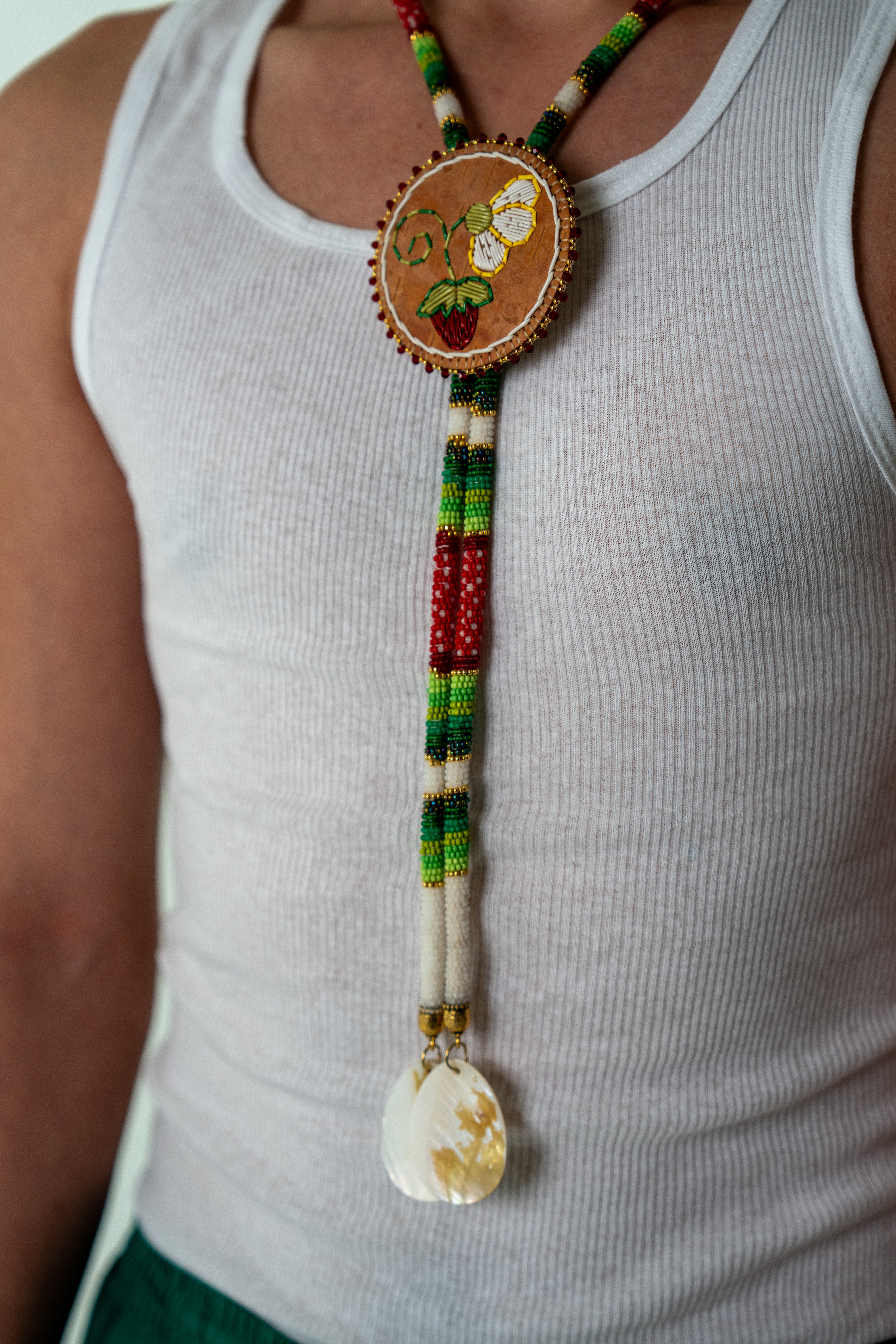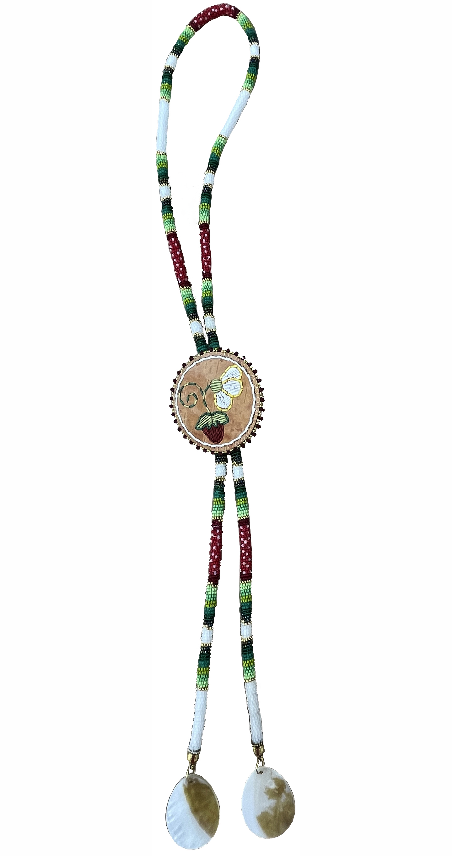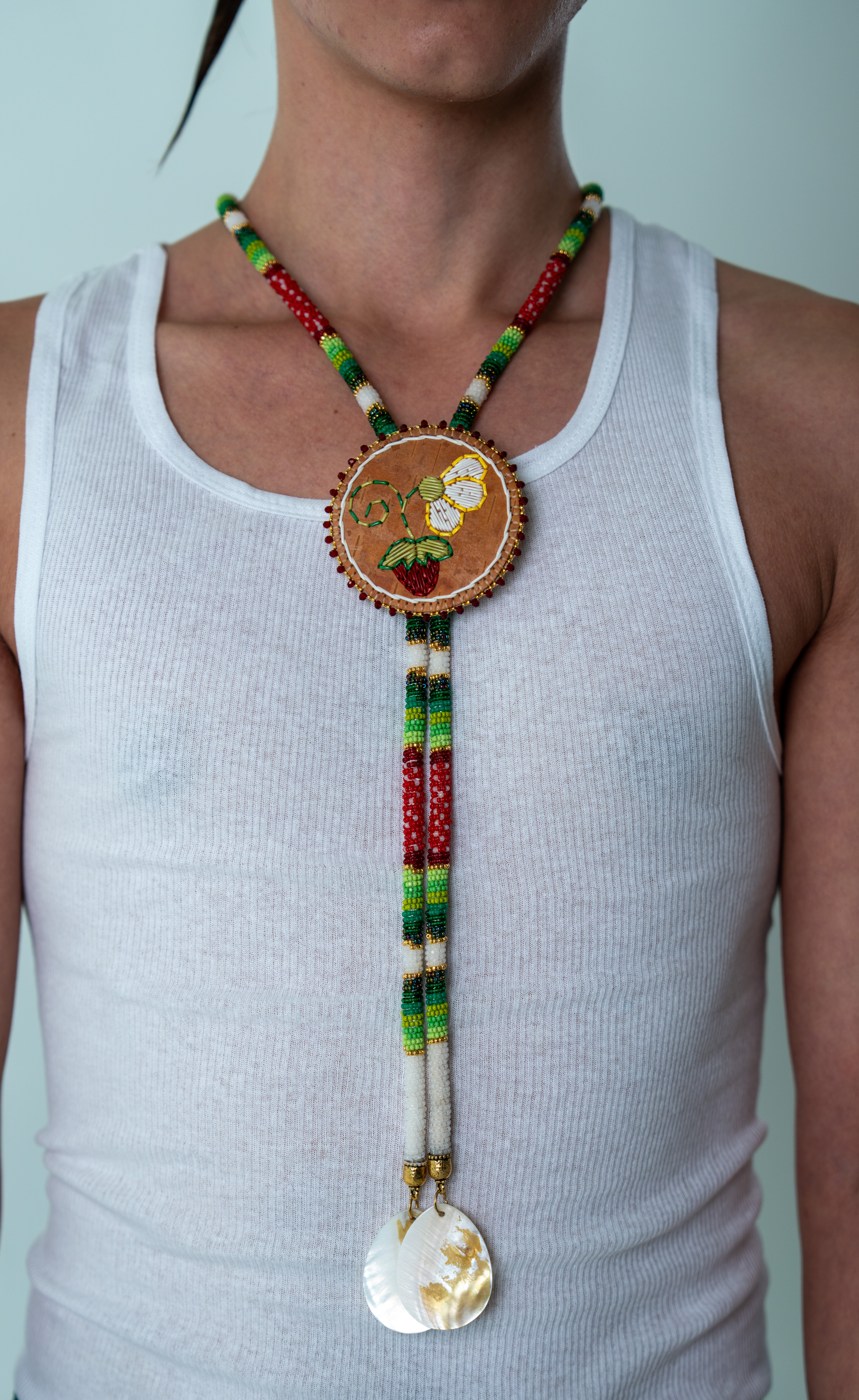 Woodland porcupine quillwork on birch bark with smoked deer hide on a beaded rope