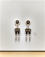 Eric-Paul Riege (Diné), Hólǫ́ ‘s Rattles, the Yáhzí 1z [3-4] + [jaatłohYe’iitsoh], 2023. Woven fibers, 66 × 18 × 9 in.