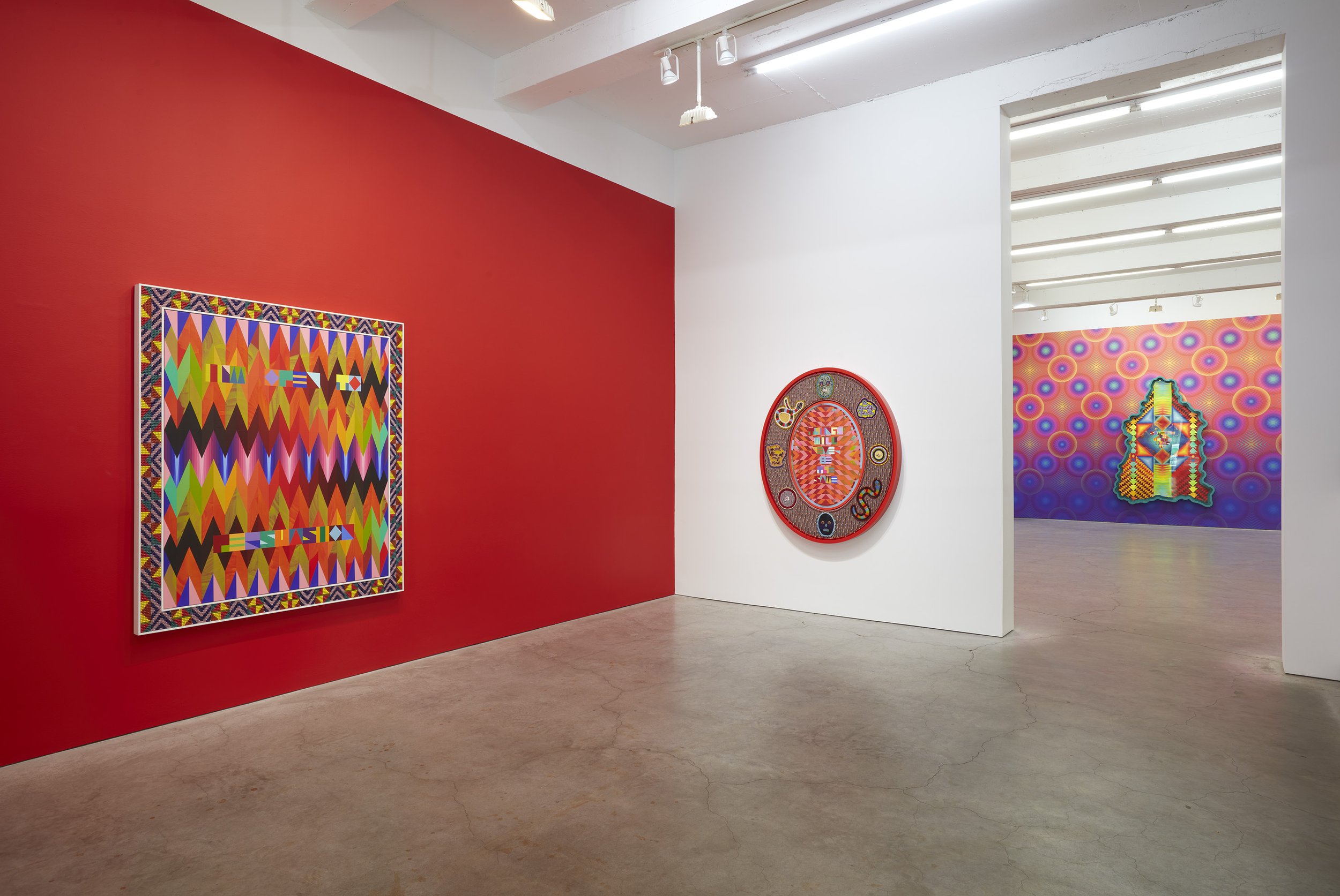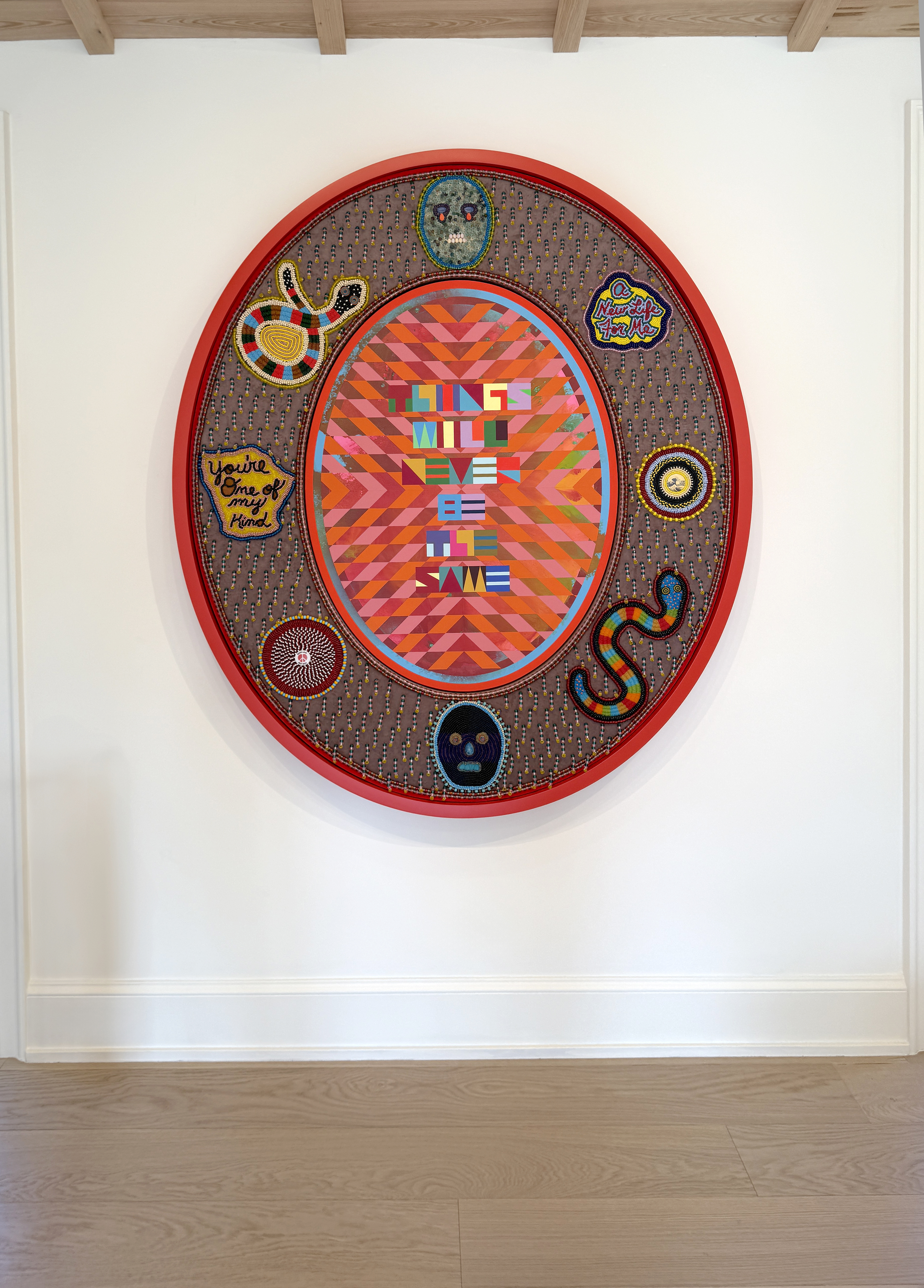 Jeffrey Gibson (Mississippi Band of Choctaw and Cherokee), THINGS WILL NEVER BE THE SAME, 2023. Acrylic paint on canvas inset in custom frame, acrylic velvet, acrylic felt, glass beads, plastic beads, vintage pinback buttons, druzy crystal, artificial sinew, nylon thread, cotton canvas, cotton rope, 60 × 50 × 5 ½ in.