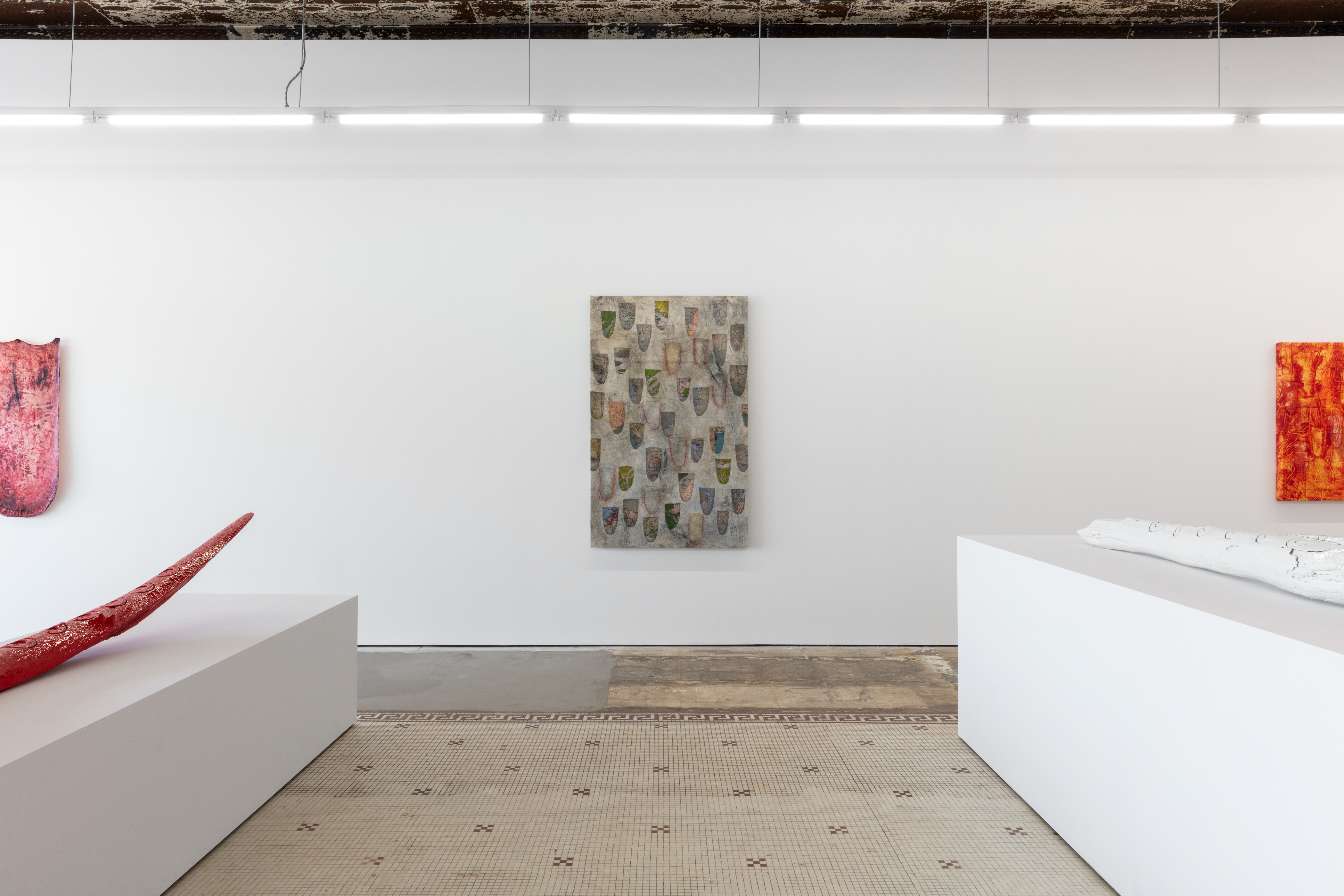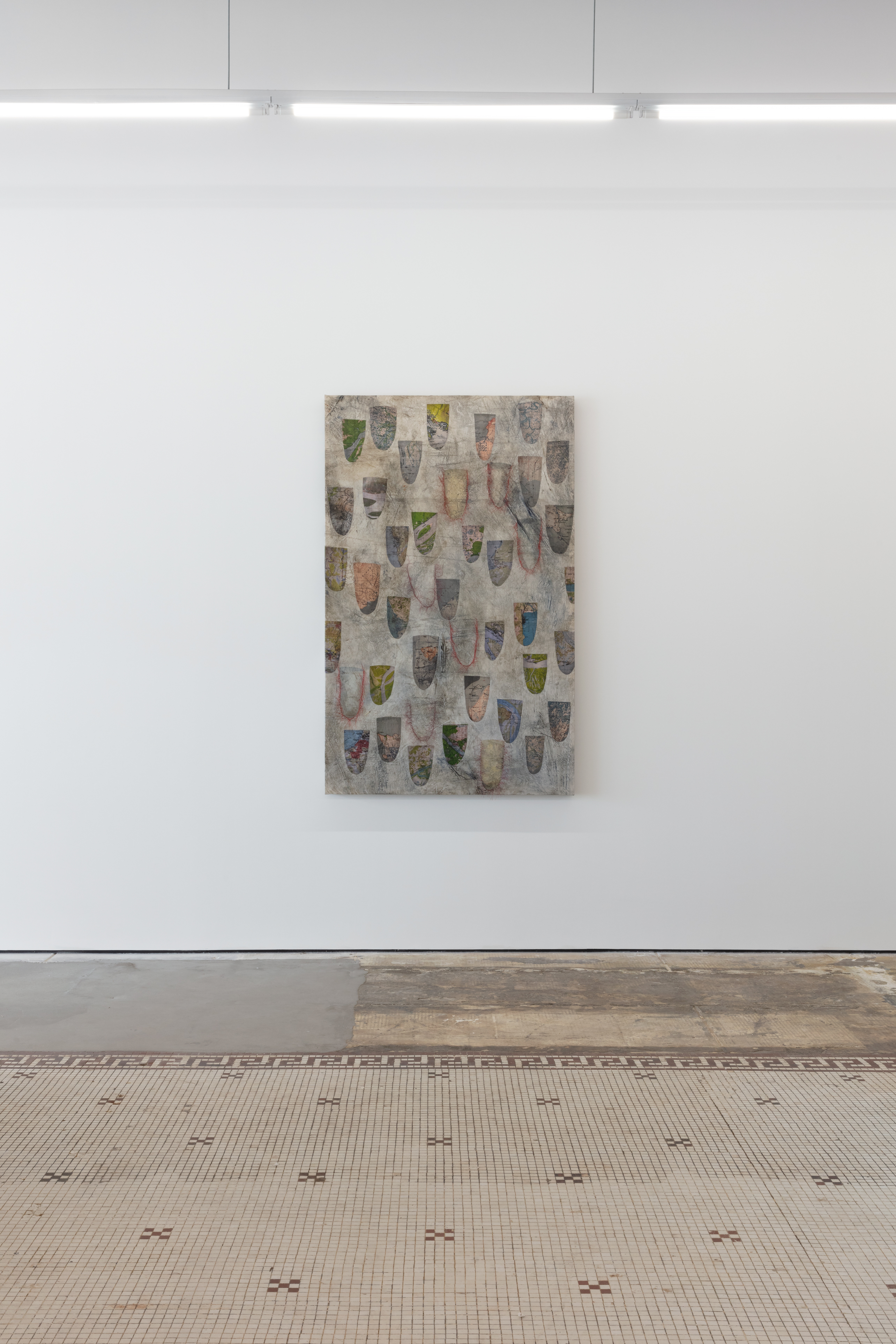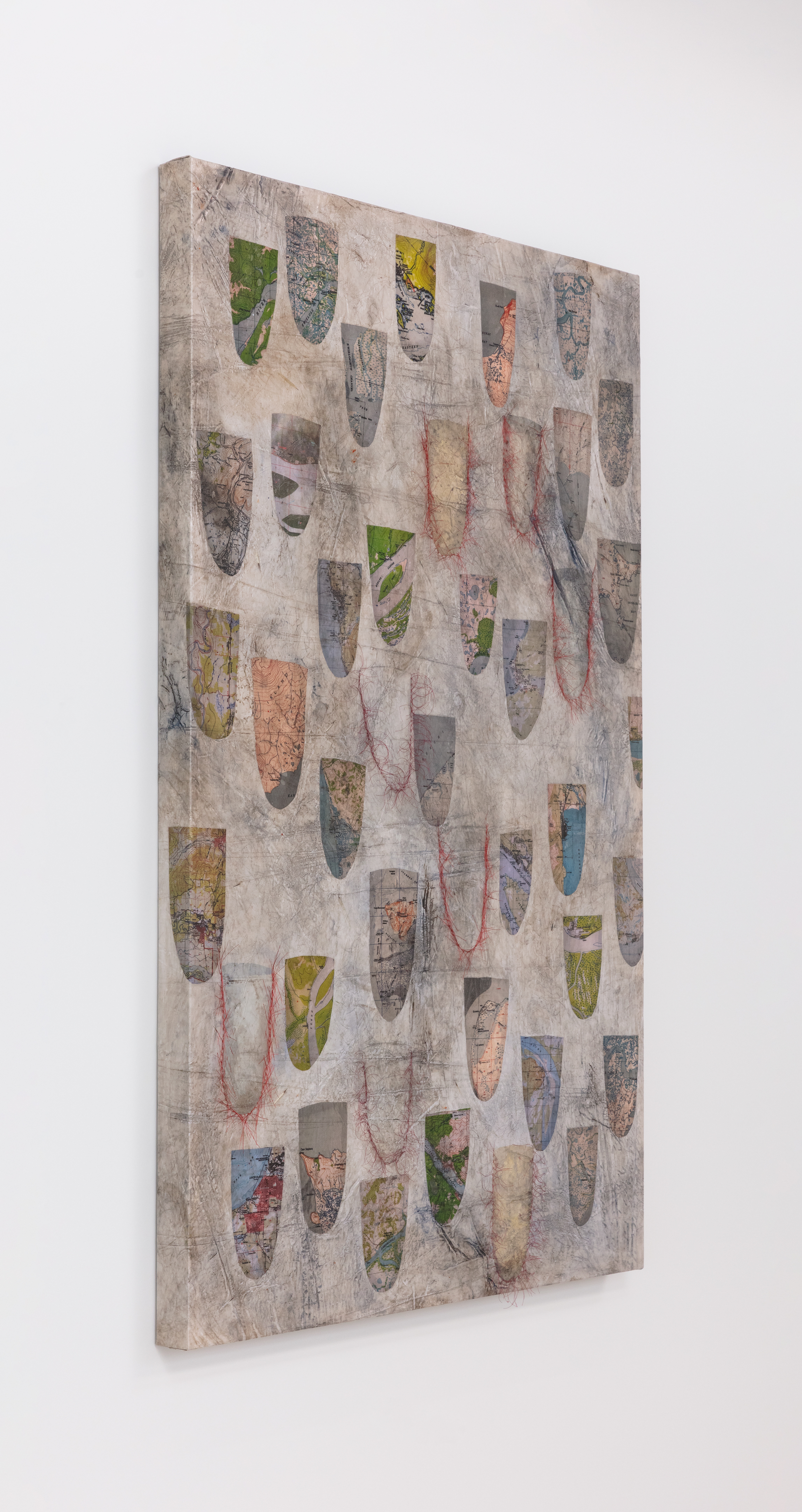 Acrylic polymer, glass bead, nylon thread, cotton muslin, printed maps on cotton fabric