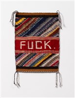 Tyrrell Tapaha (Diné), Ashkii Tsoh, 2024. 4-ply acid dyed yarn, handspun natural white/brown Navajo churro, and vegetal dyed Navajo churro., 69 × 20 in.