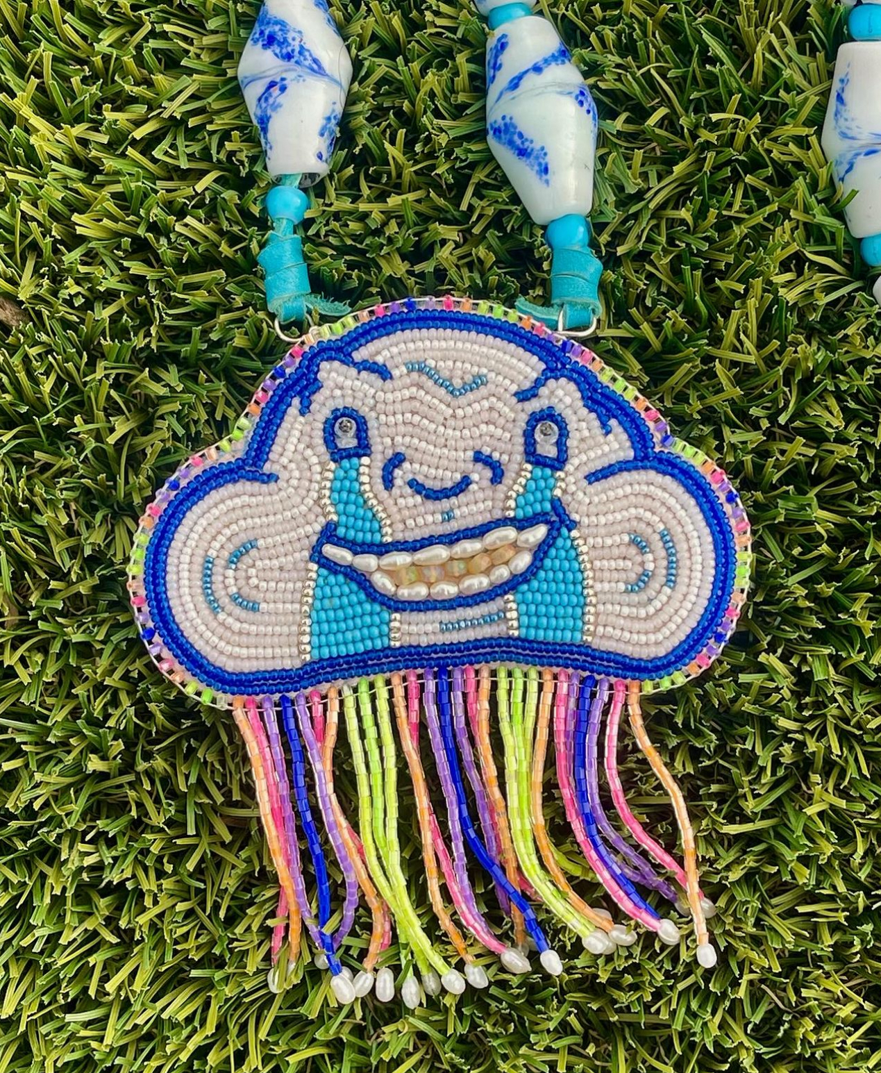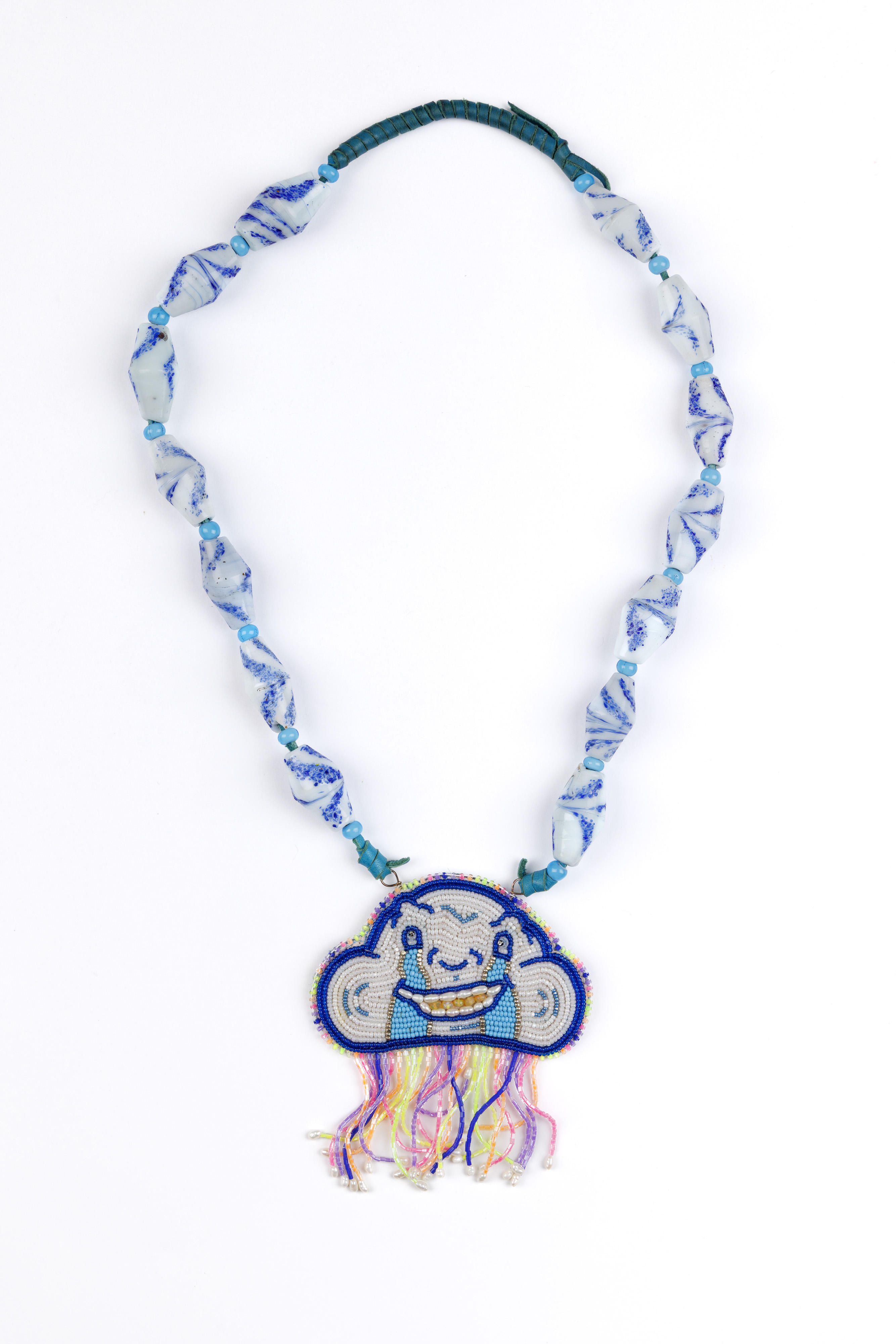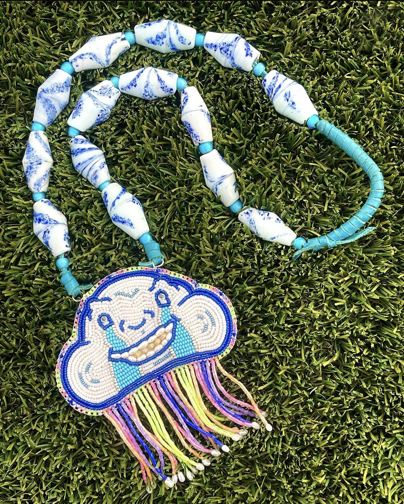 Glass beads, sterling silver, miyuki beads, freshwater pearls, opals, white rubies, black diamonds, trade beads, and leather