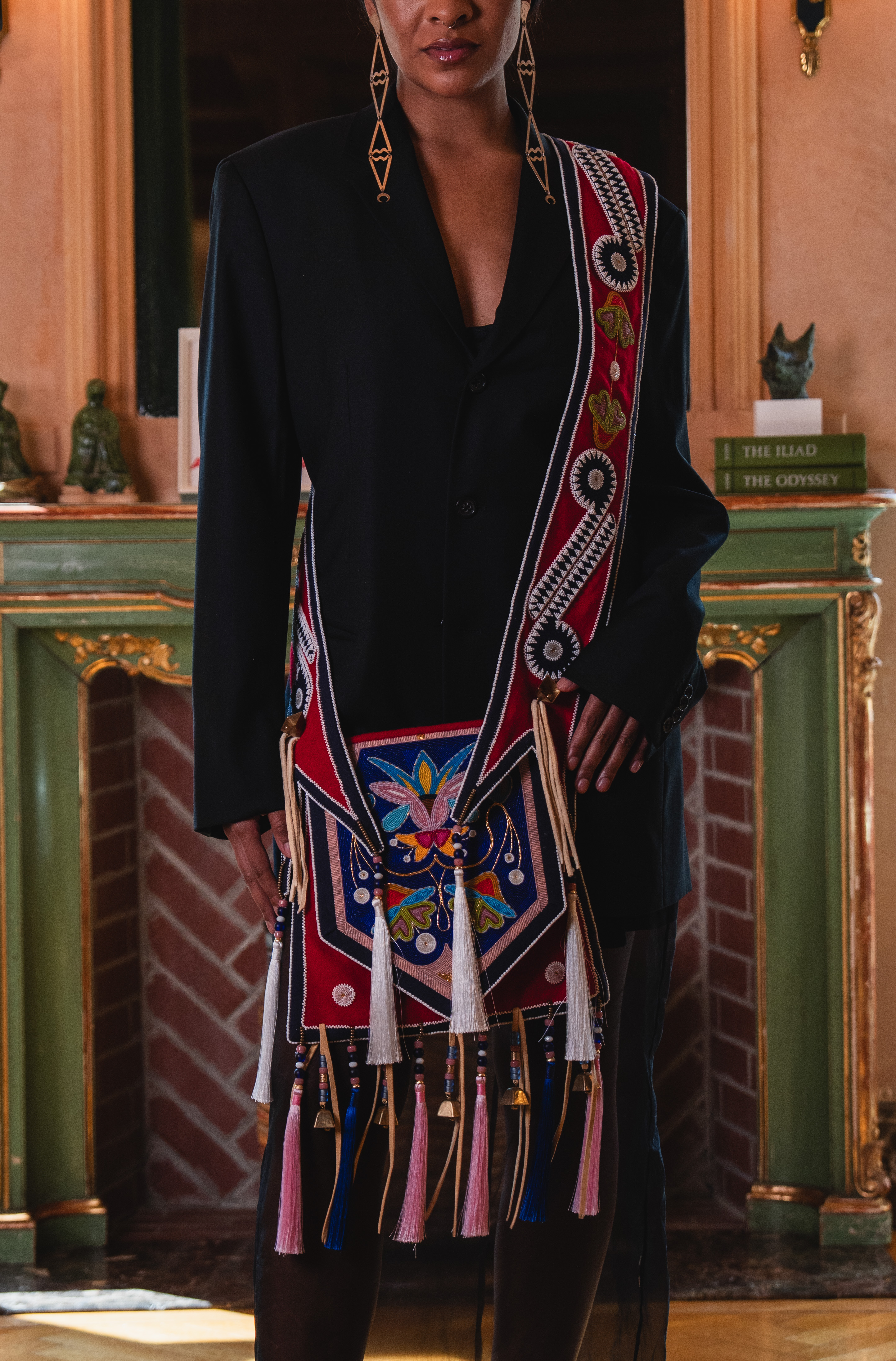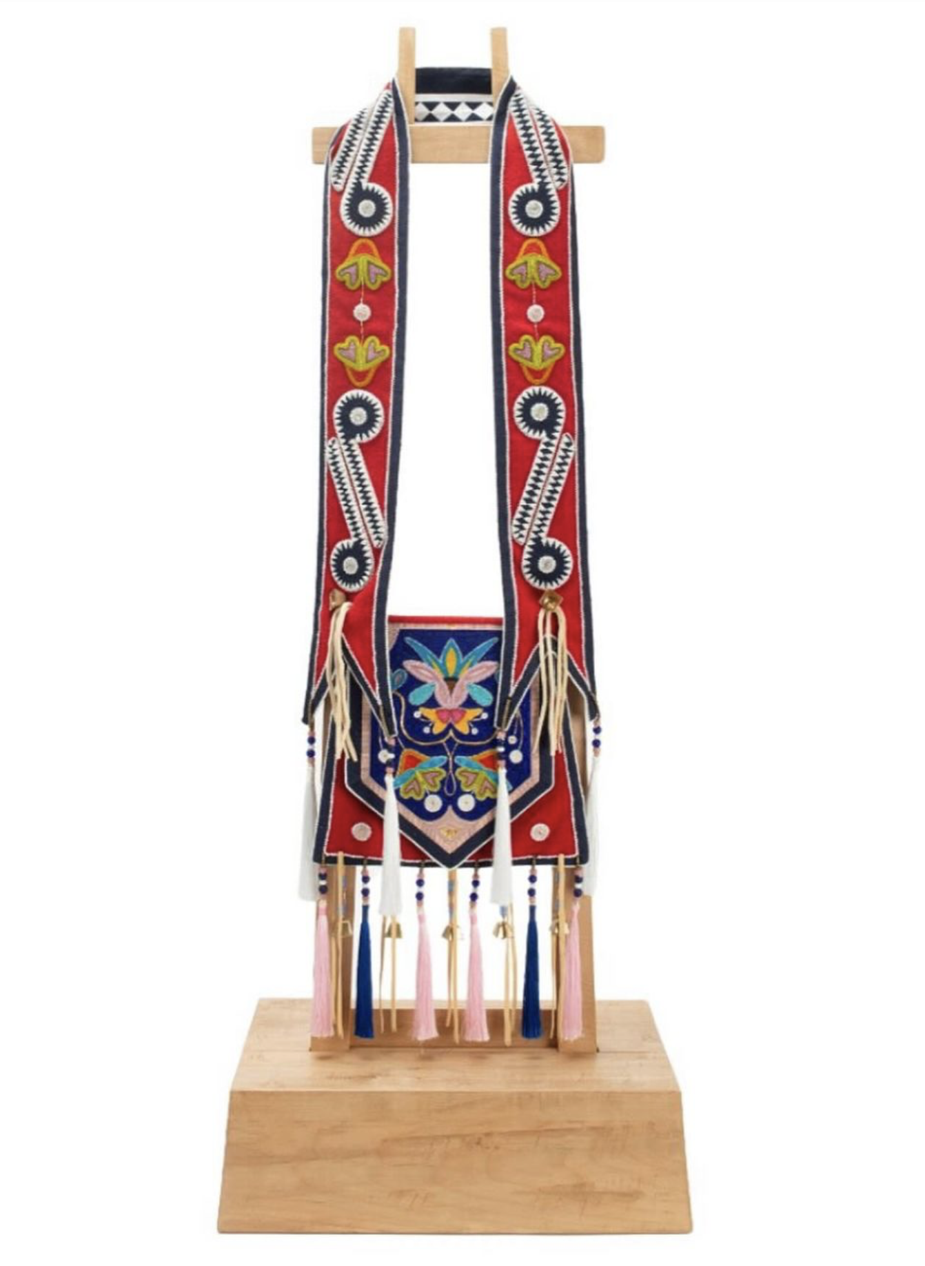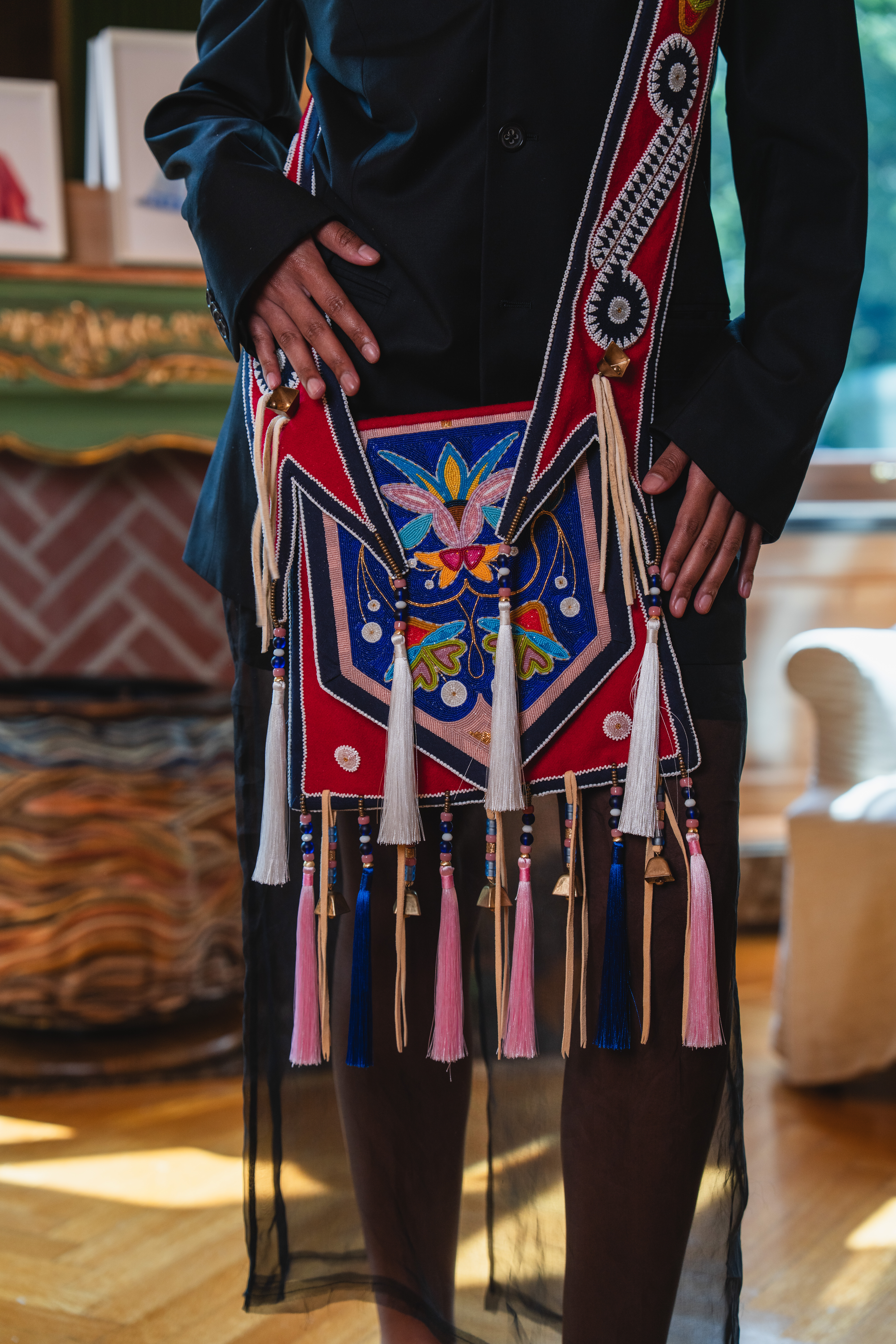 Hollis Chitto (Mississippi Choctaw, Laguna Pueblo, Isleta Pueblo), Napakanli Um Okla Imma (Flowers for My Family), 2023. Wool, cotton, brain-tanned buckskin, glass beads, contemporary & vintage seed beads, Chinese crystal & glass pony beads, brass bells and beads, 46 ½ in.