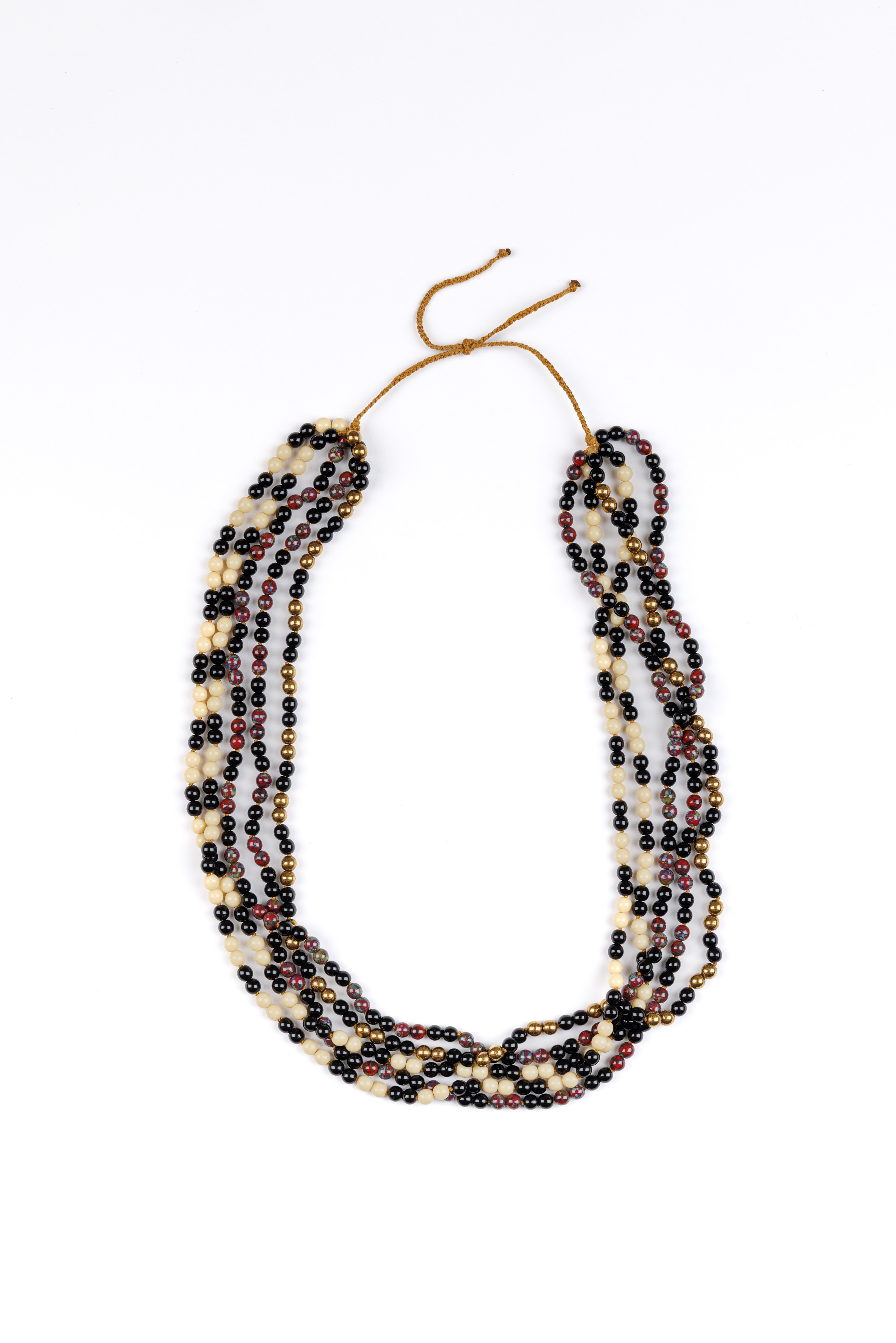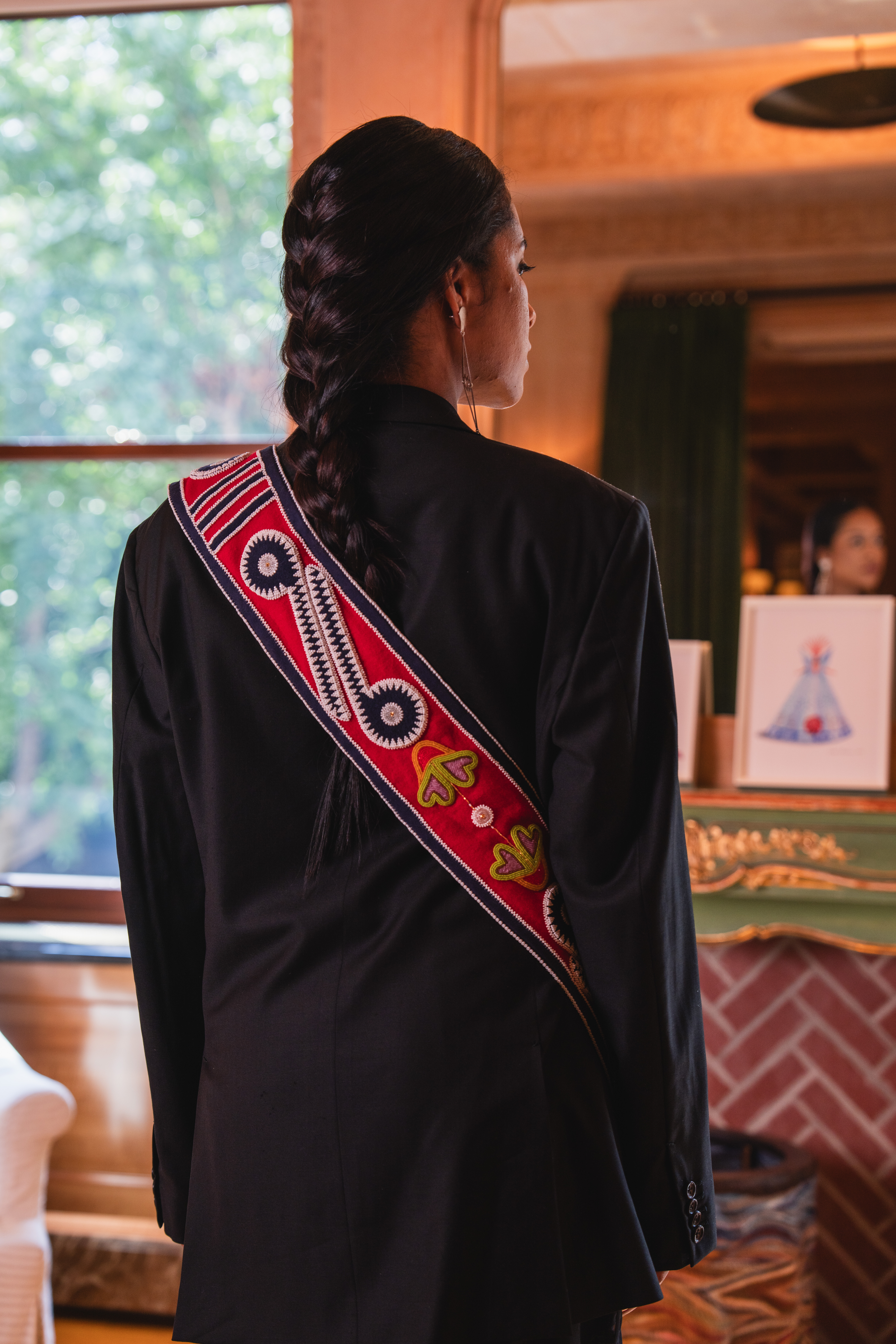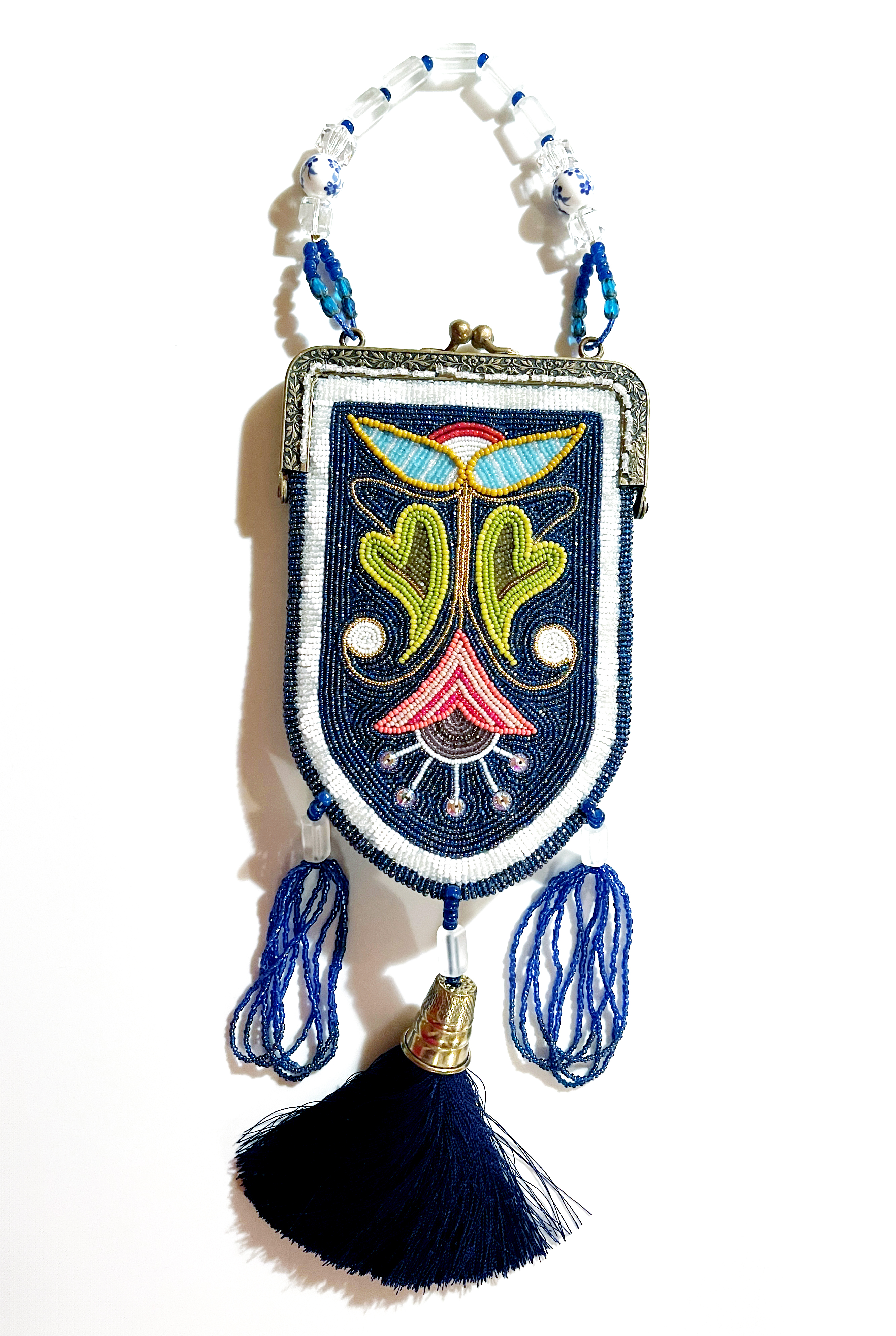Hollis Chitto (Mississippi Choctaw, Laguna Pueblo, Isleta Pueblo), Napakanli Um Okla Imma (Flowers for My Family), 2023. Wool, cotton, brain-tanned buckskin, glass beads, contemporary & vintage seed beads, Chinese crystal & glass pony beads, brass bells and beads, 46 ½ in.