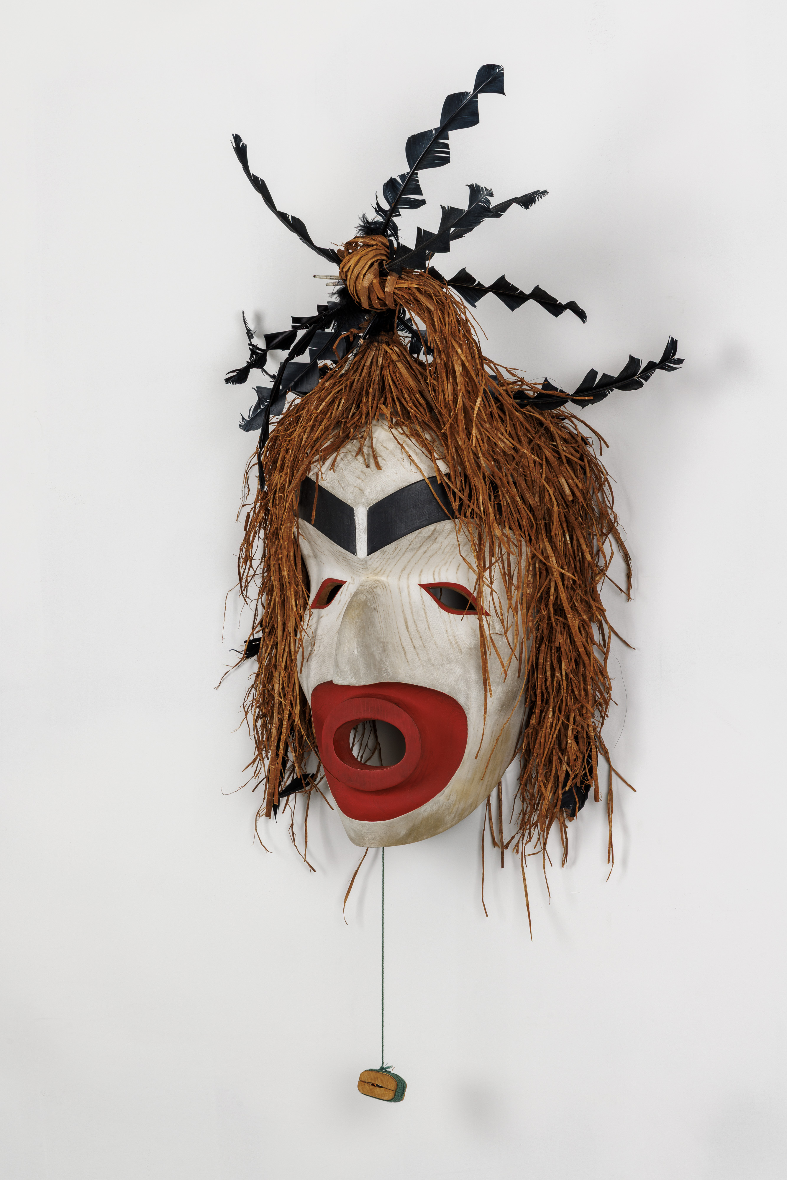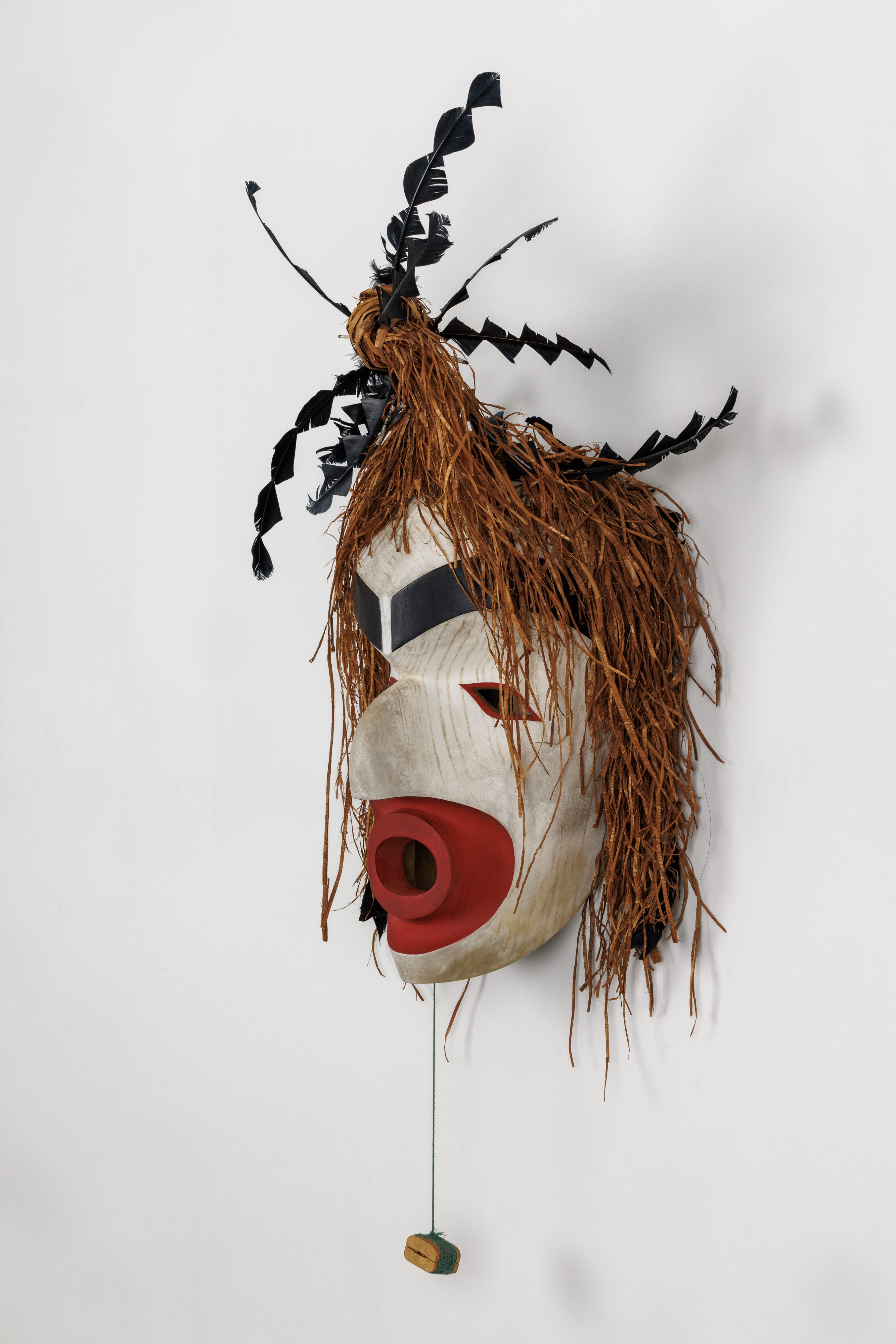 Shredded cedar bark, cedar, paint, feathers, and twine