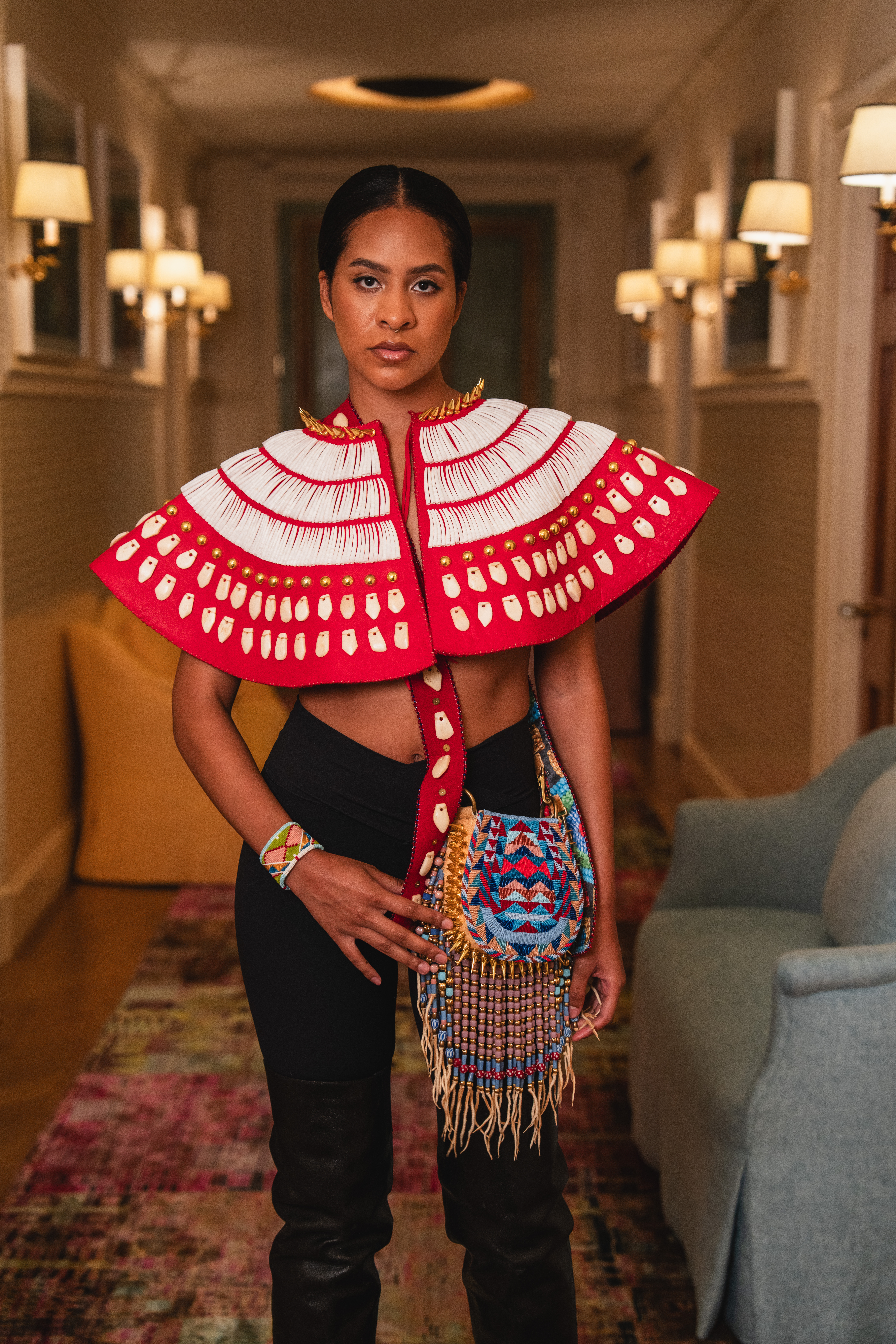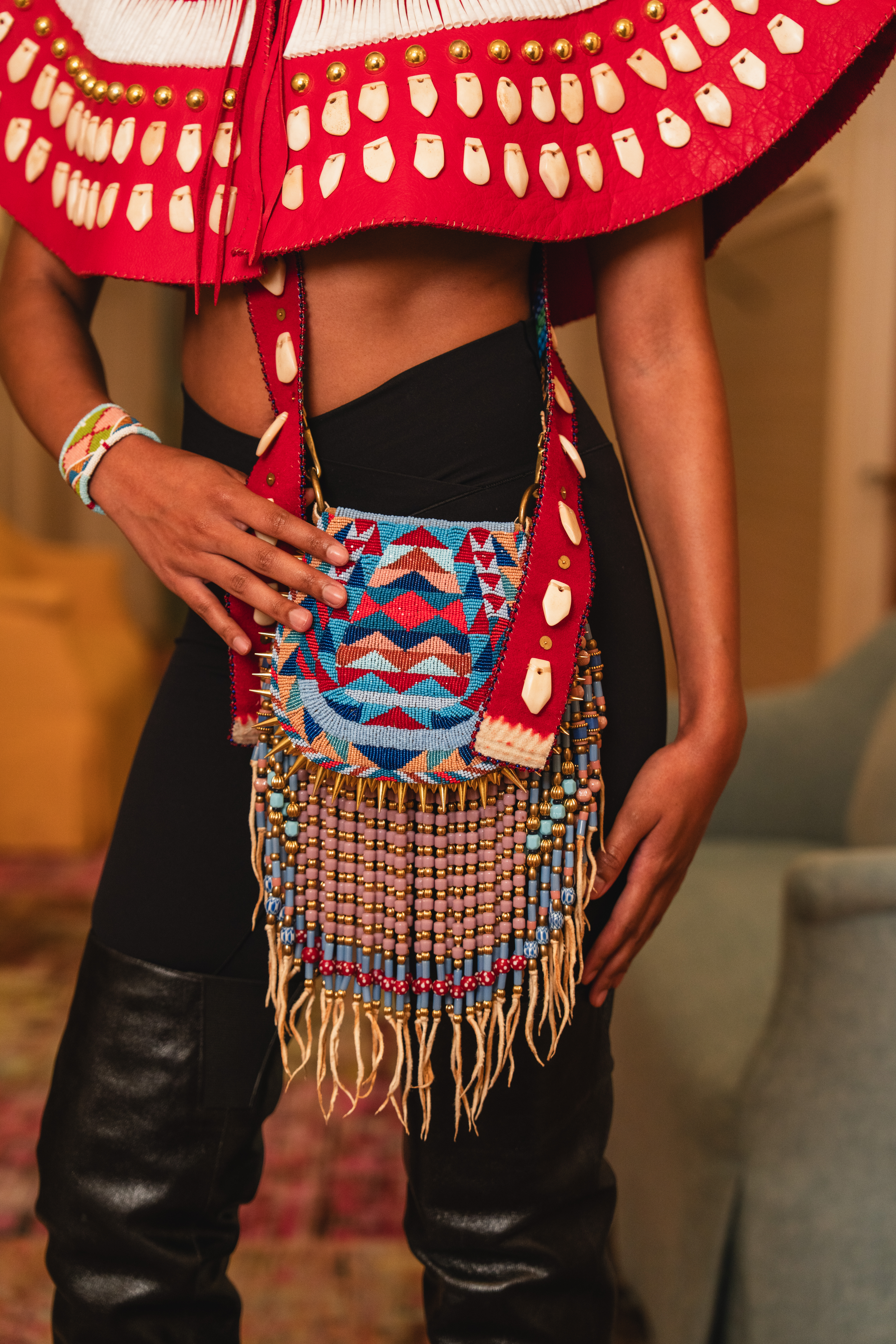 Wool, smoked deer hide, Italian leather, gold spikes and studs, bone-carved elk ivory, antique brass sequins and glass cut beads