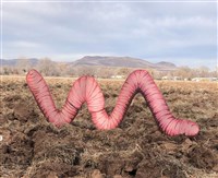 Haley Greenfeather English (Ojibwe), Worm, 2024. Acrylic on wood , 23 × 67 × 17 in.