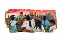 Manuel Hernandez Sanchez (Displaced Nahau descendant), Por La Tierra, 2024. Oil on shaped canvas, 10 × 23 in.