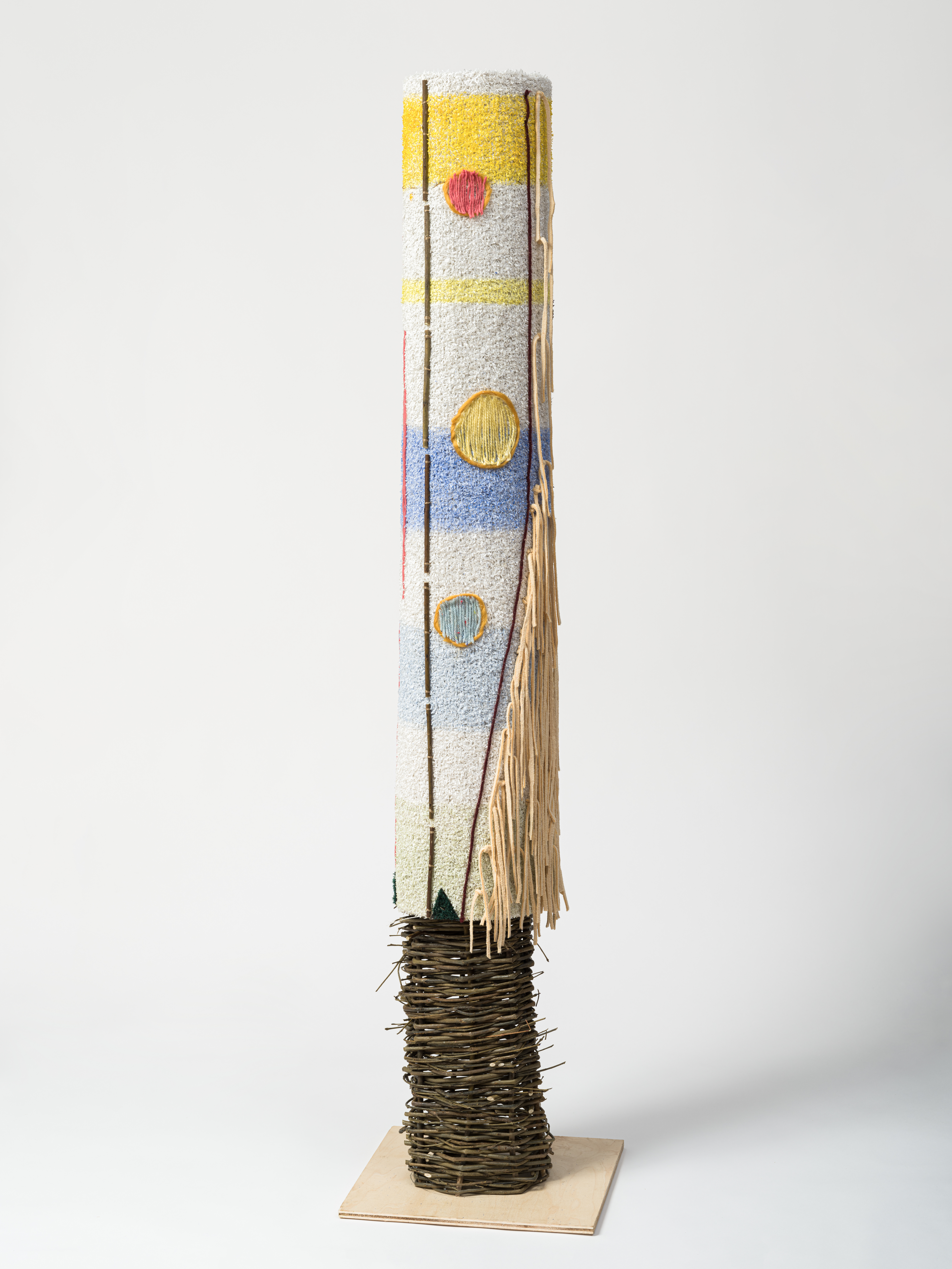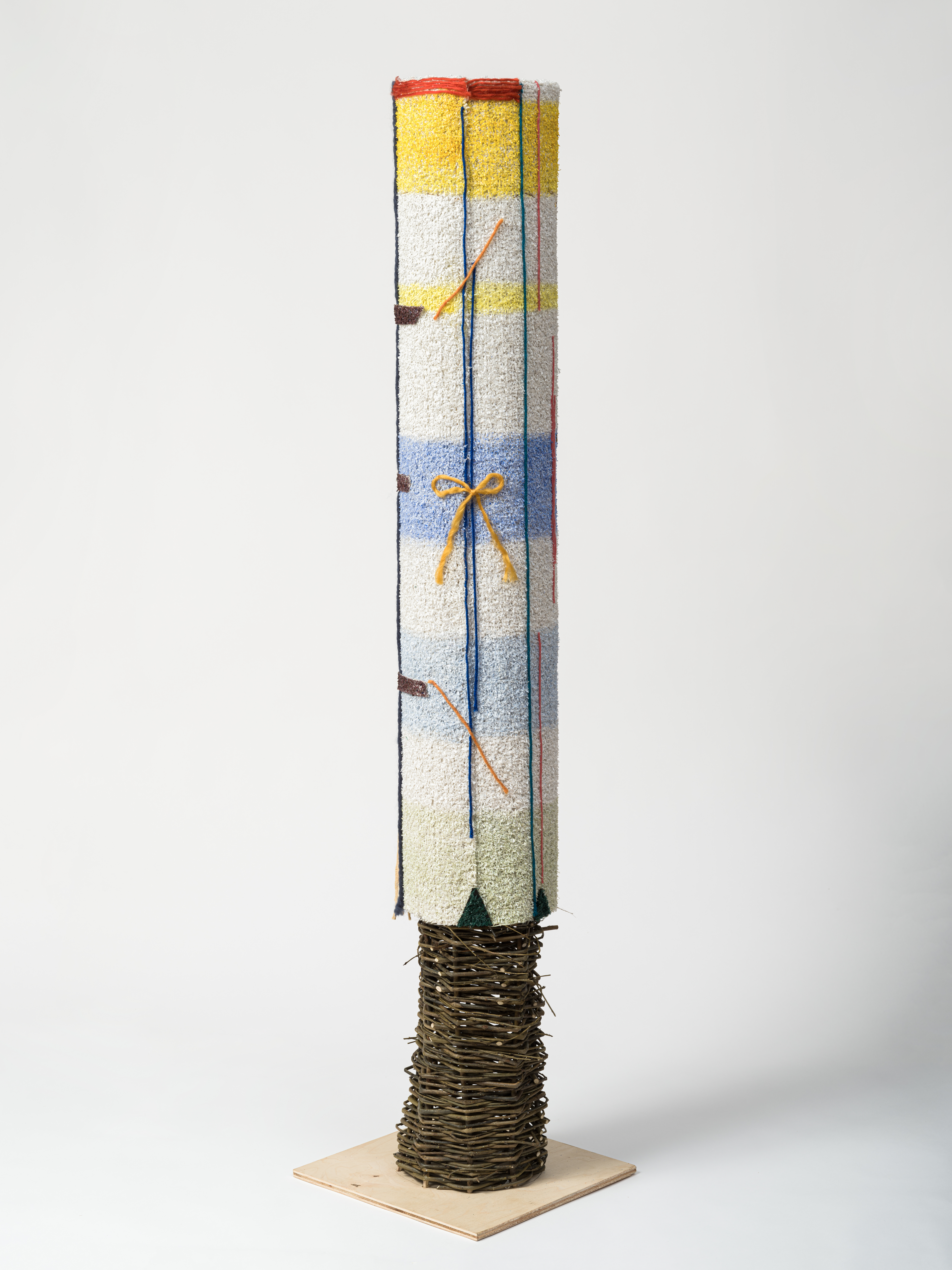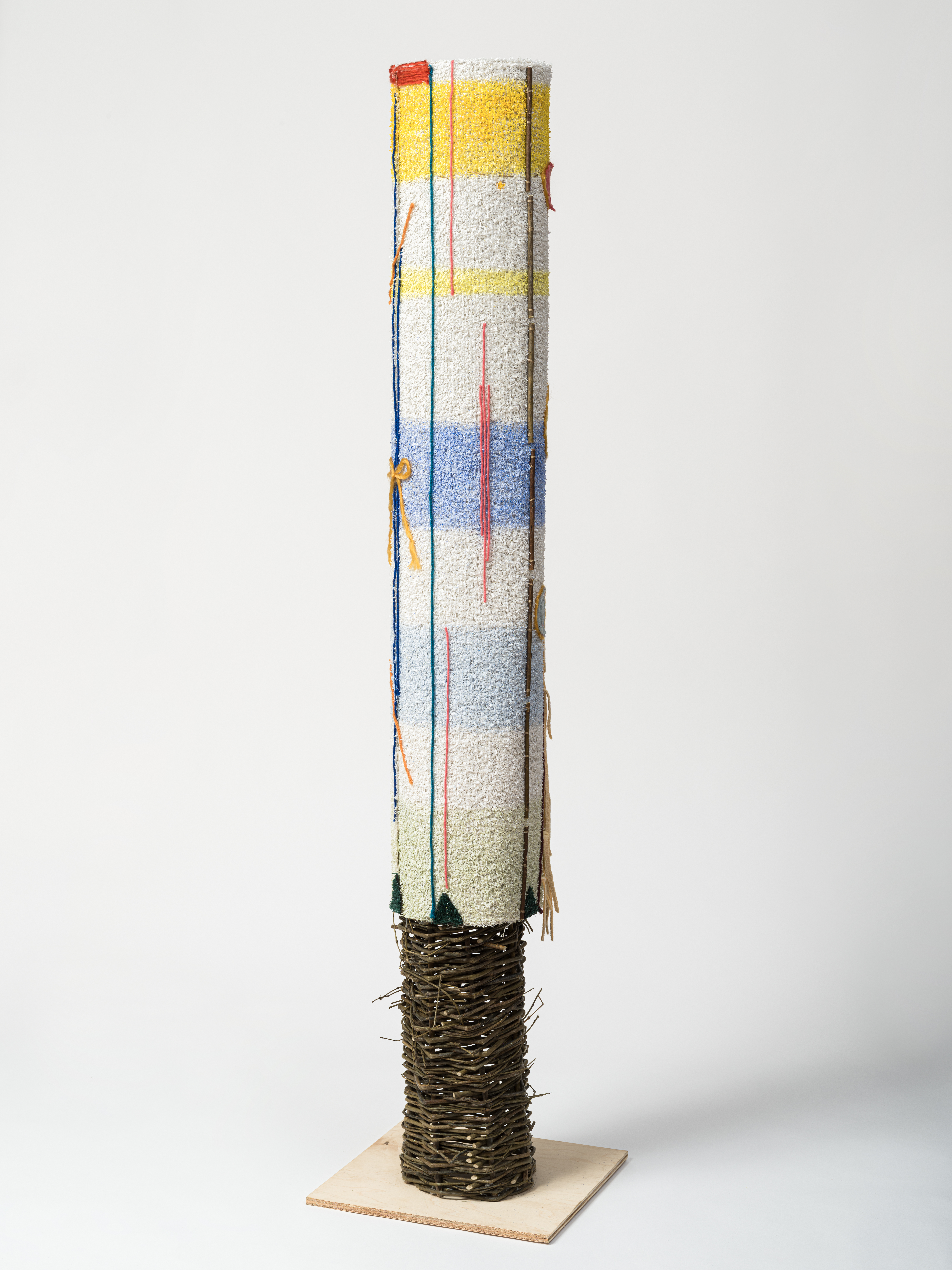 Teresa Baker (Mandan/Hidatsa), Beacon 1, 2024. Willow, yarn, buckskin, cardboard and artificial turf, 53 × 8 3/8 × 8 3/8 in.