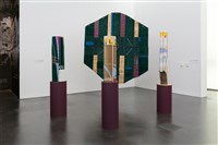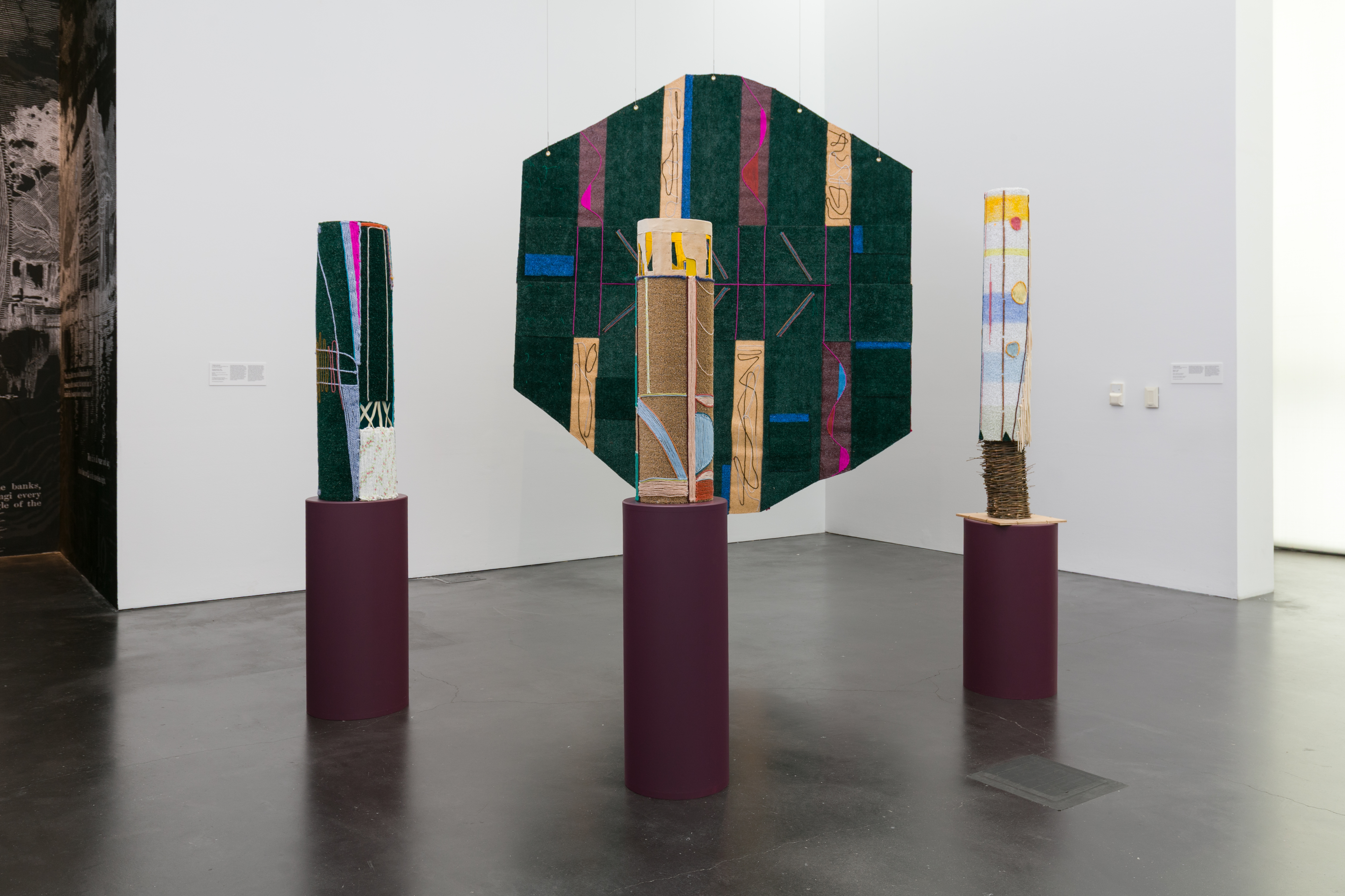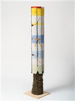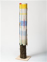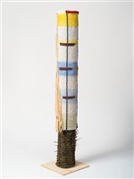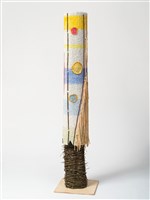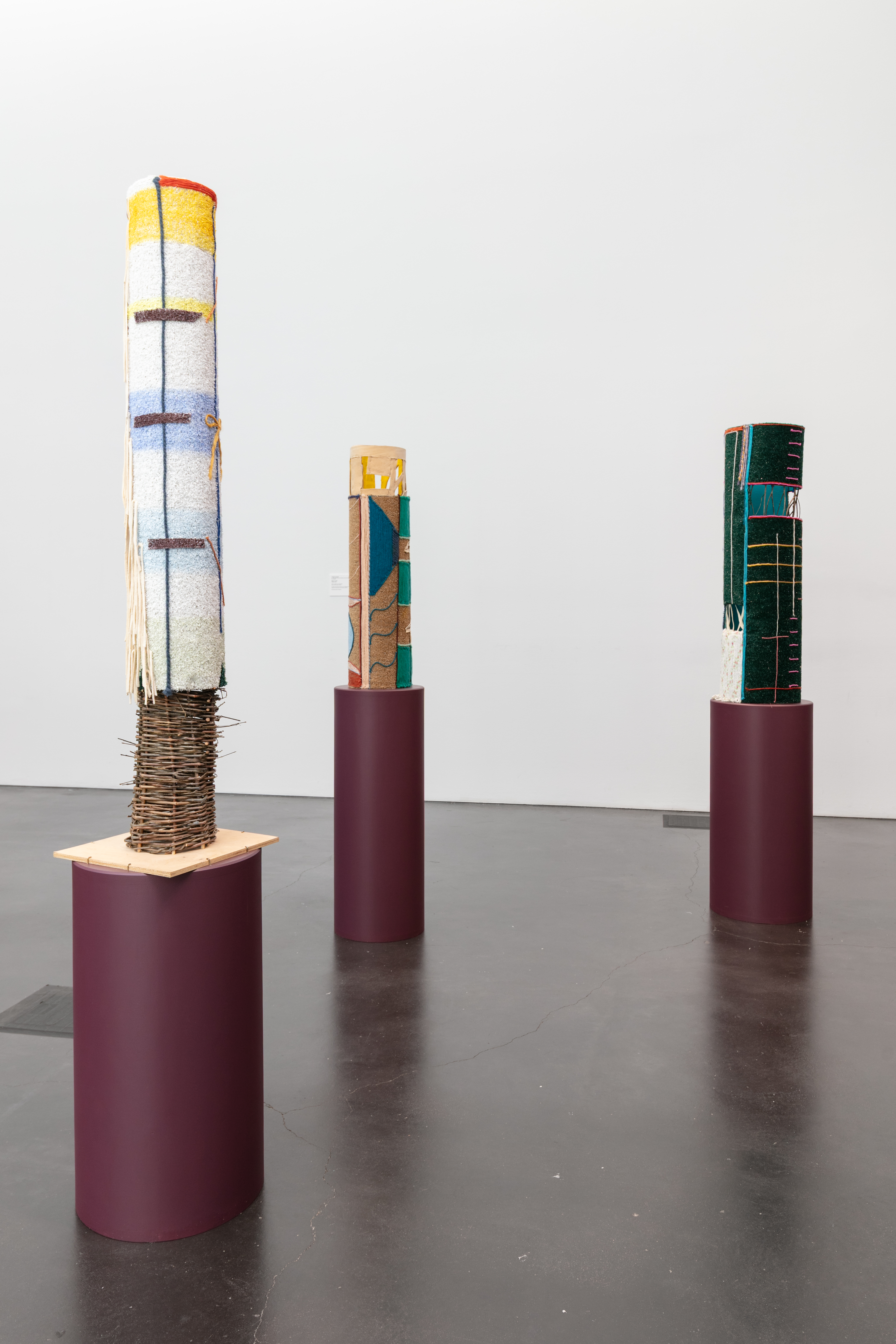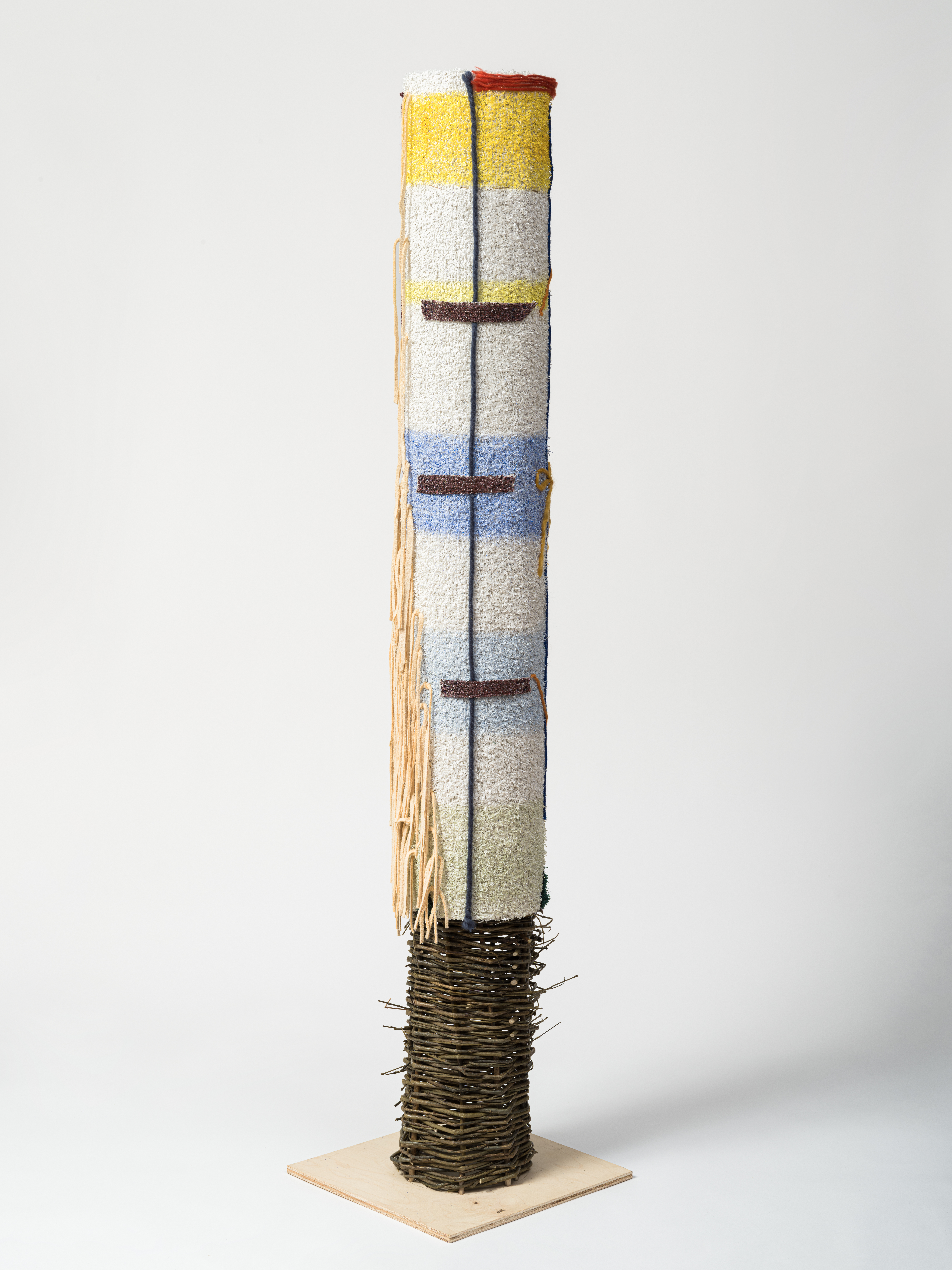 Teresa Baker (Mandan/Hidatsa), Beacon 1, 2024. Willow, yarn, buckskin, cardboard and artificial turf, 53 × 8 3/8 × 8 3/8 in.