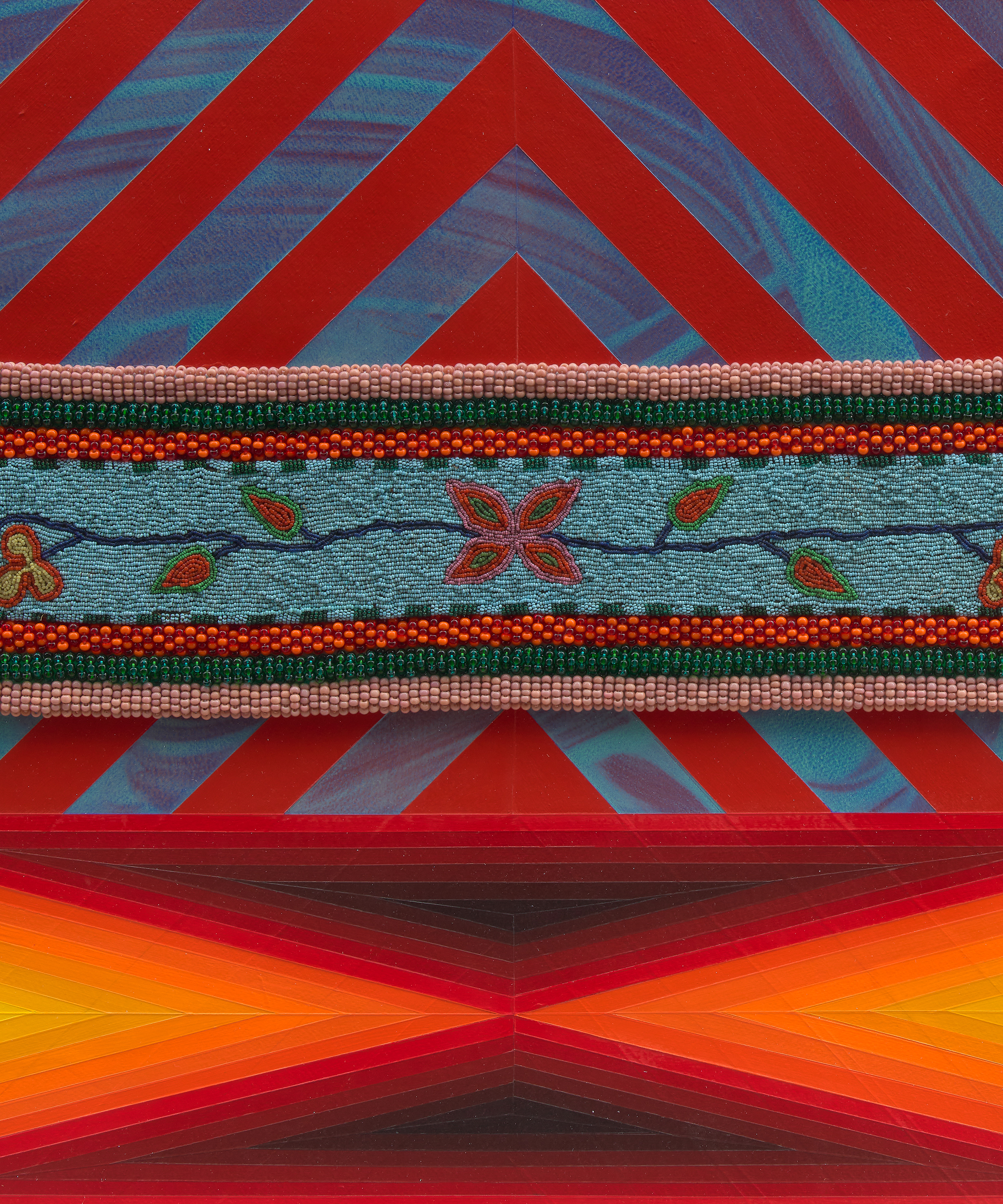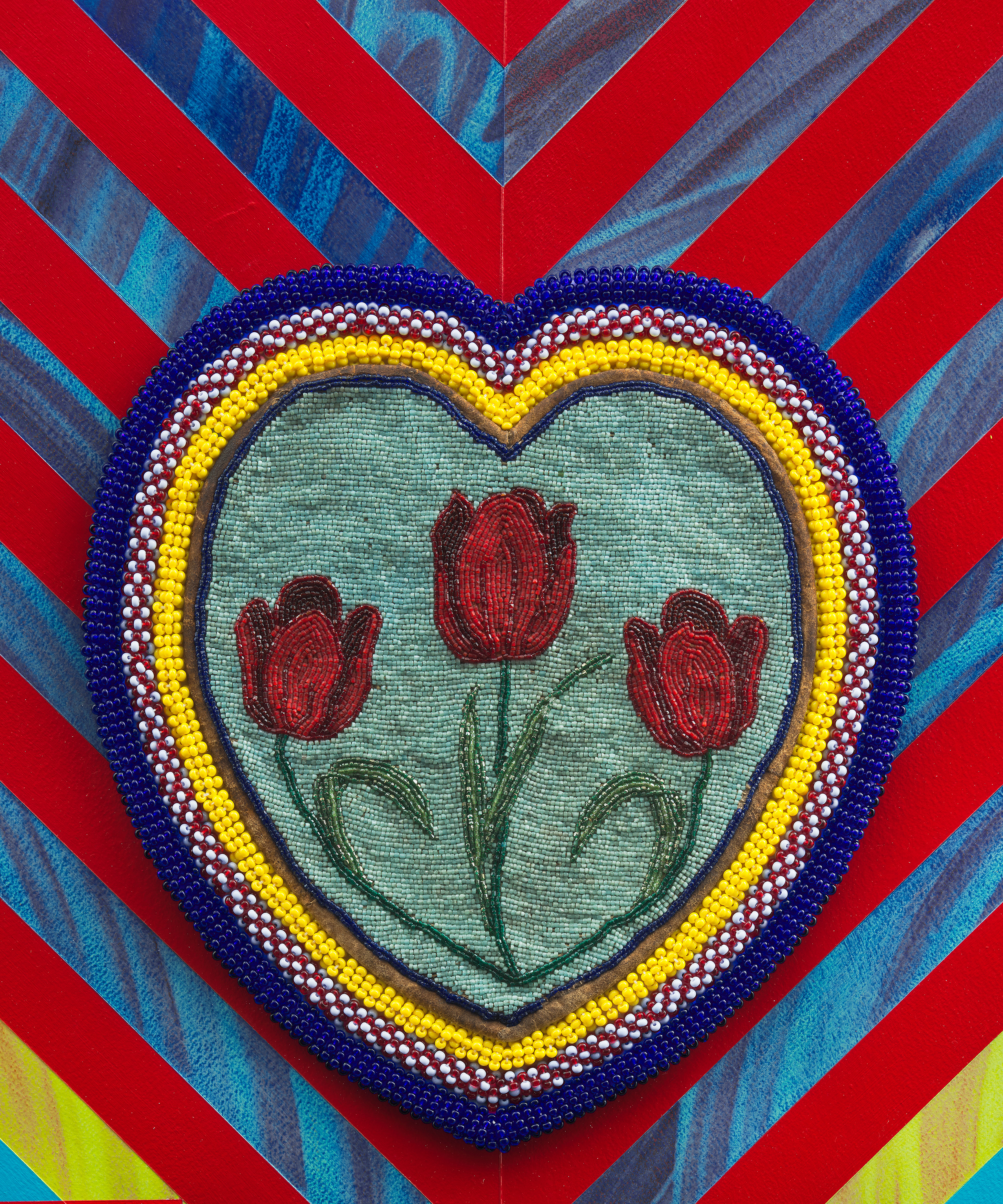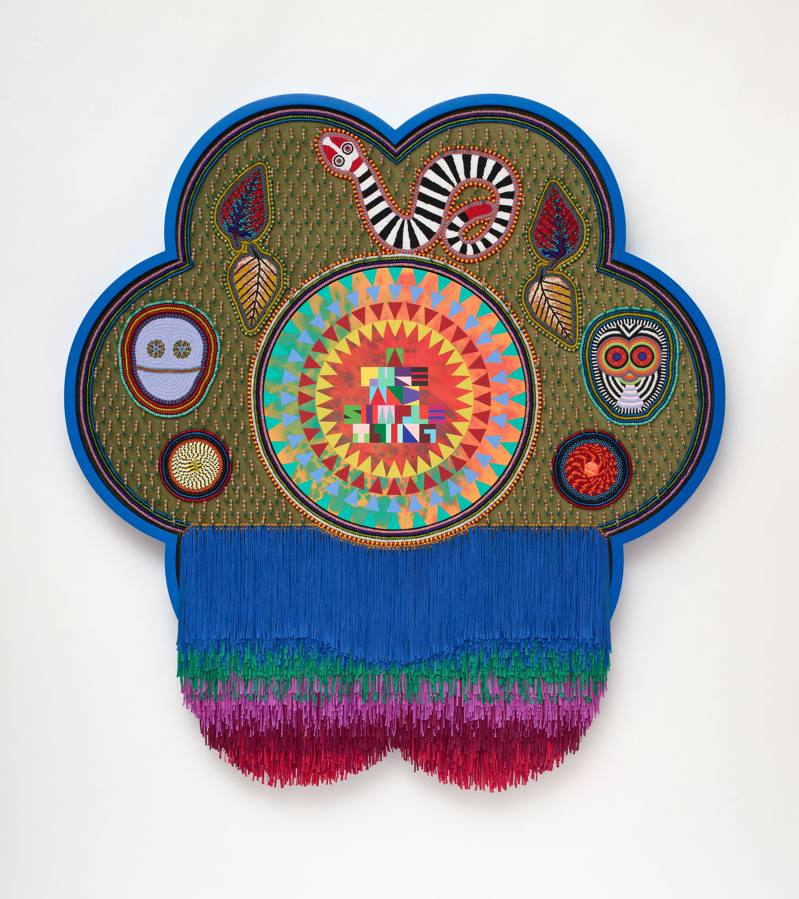 Acrylic on watercolor paper, acrylic felt, glass beads, silicone adhesive and found objects