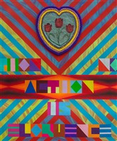 Jeffrey Gibson (Mississippi Band of Choctaw and Cherokee), ACTION NOW ACTION IS ELOQUENCE, 2024. Acrylic on watercolor paper, acrylic felt, glass beads, silicone adhesive and found objects, Framed: 72 × 59 in.