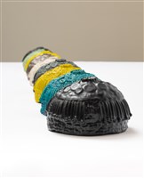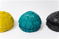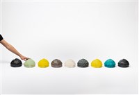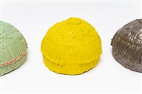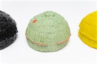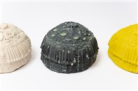 Sara Siestreem (Hanis Coos), catacomb, 2024. Nine slip cast ceramic dance caps, glaze, acrylic and graphite, Each: 5 × 8 × 6 in.